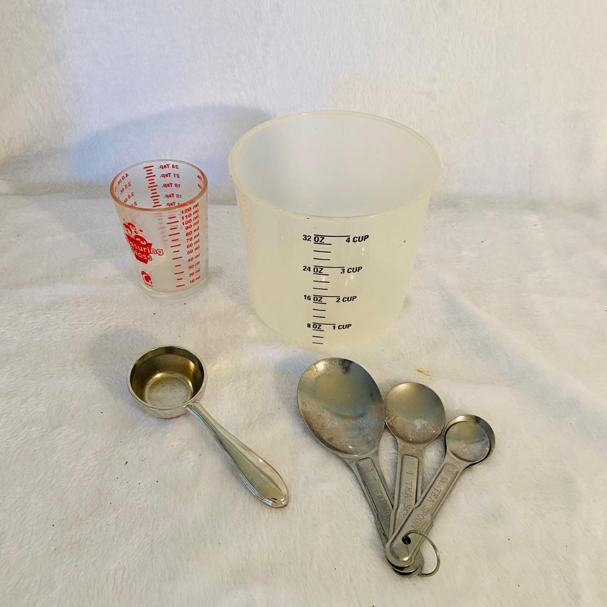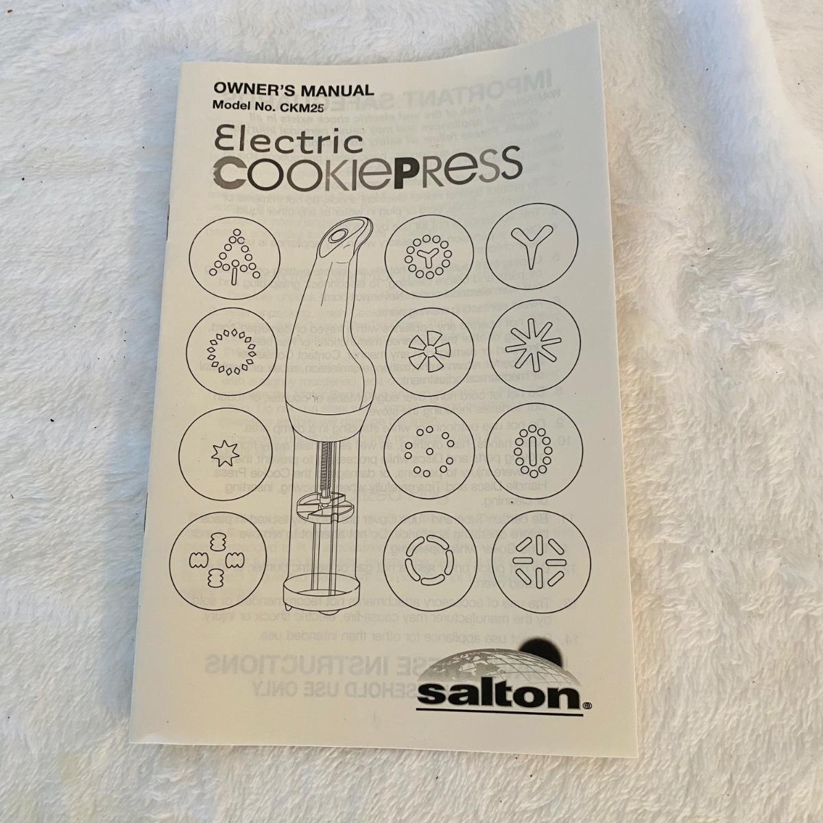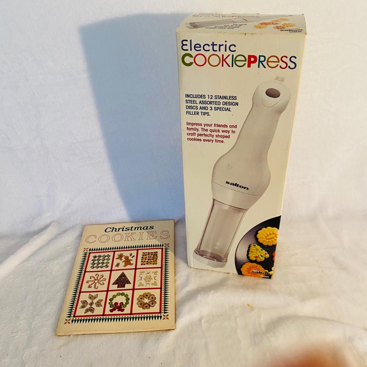 Electric Salton cookie press and Christmas cookie cookbook. Glass cutting board measures 20” x 16”. Two measuring cups - one glass and one plastic. Set of metal measuring spoons in good condition.