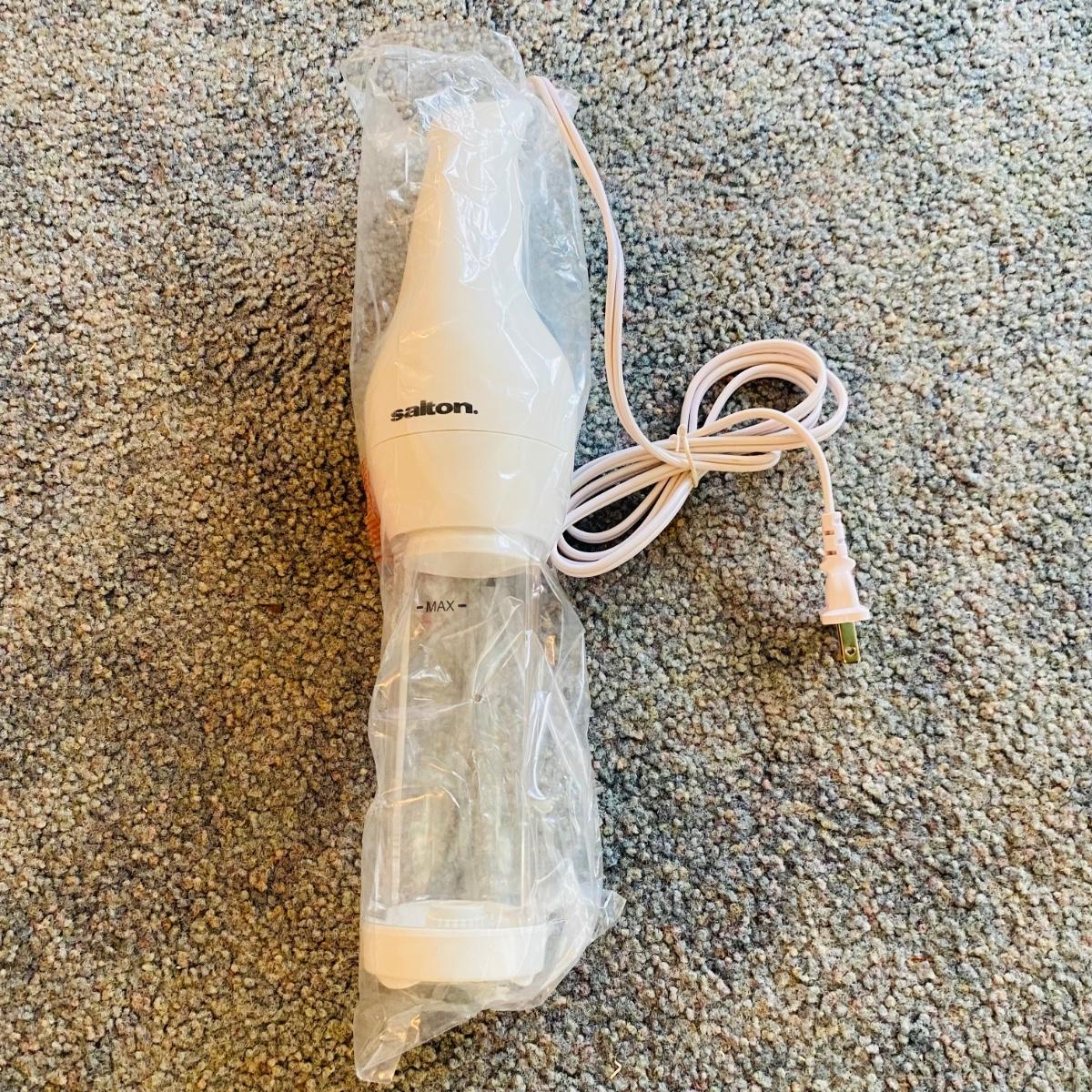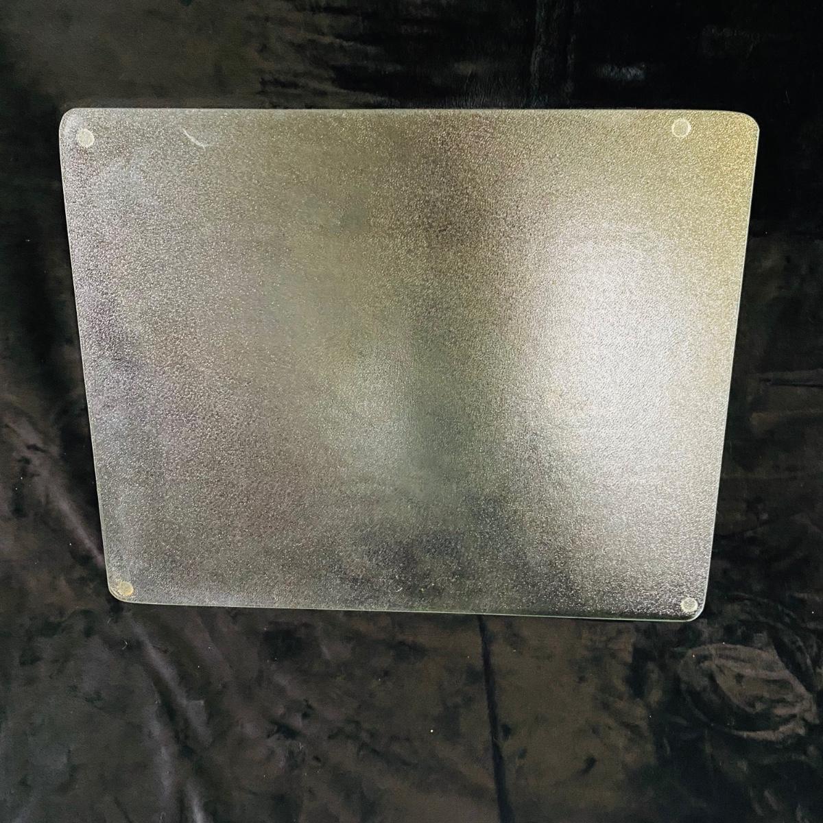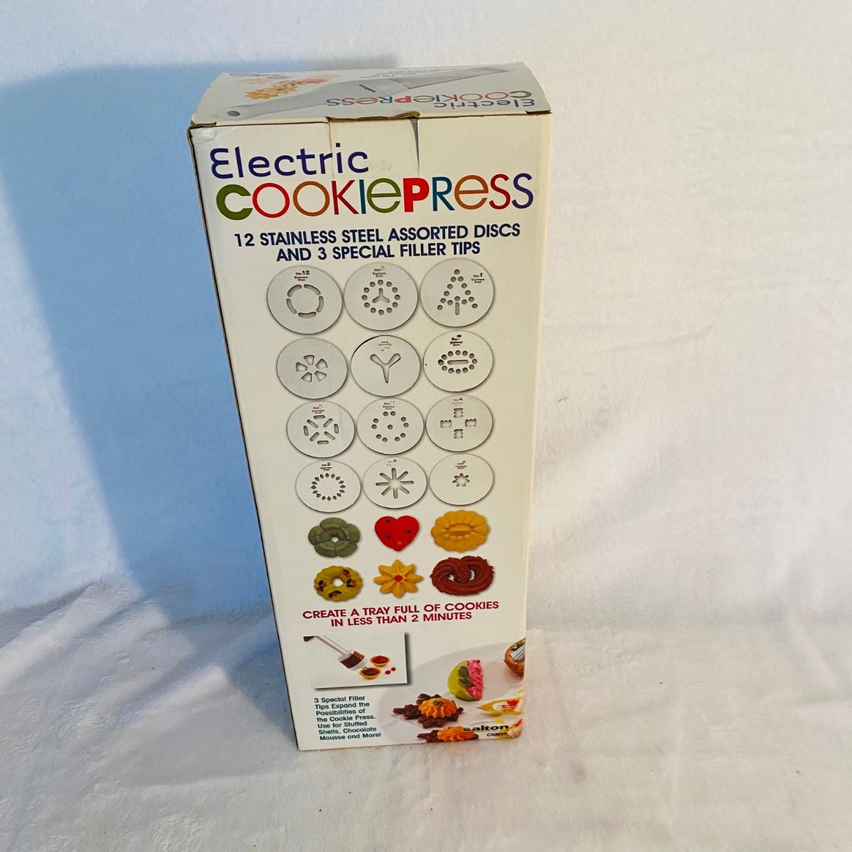 Electric Salton cookie press and Christmas cookie cookbook. Glass cutting board measures 20” x 16”. Two measuring cups - one glass and one plastic. Set of metal measuring spoons in good condition.