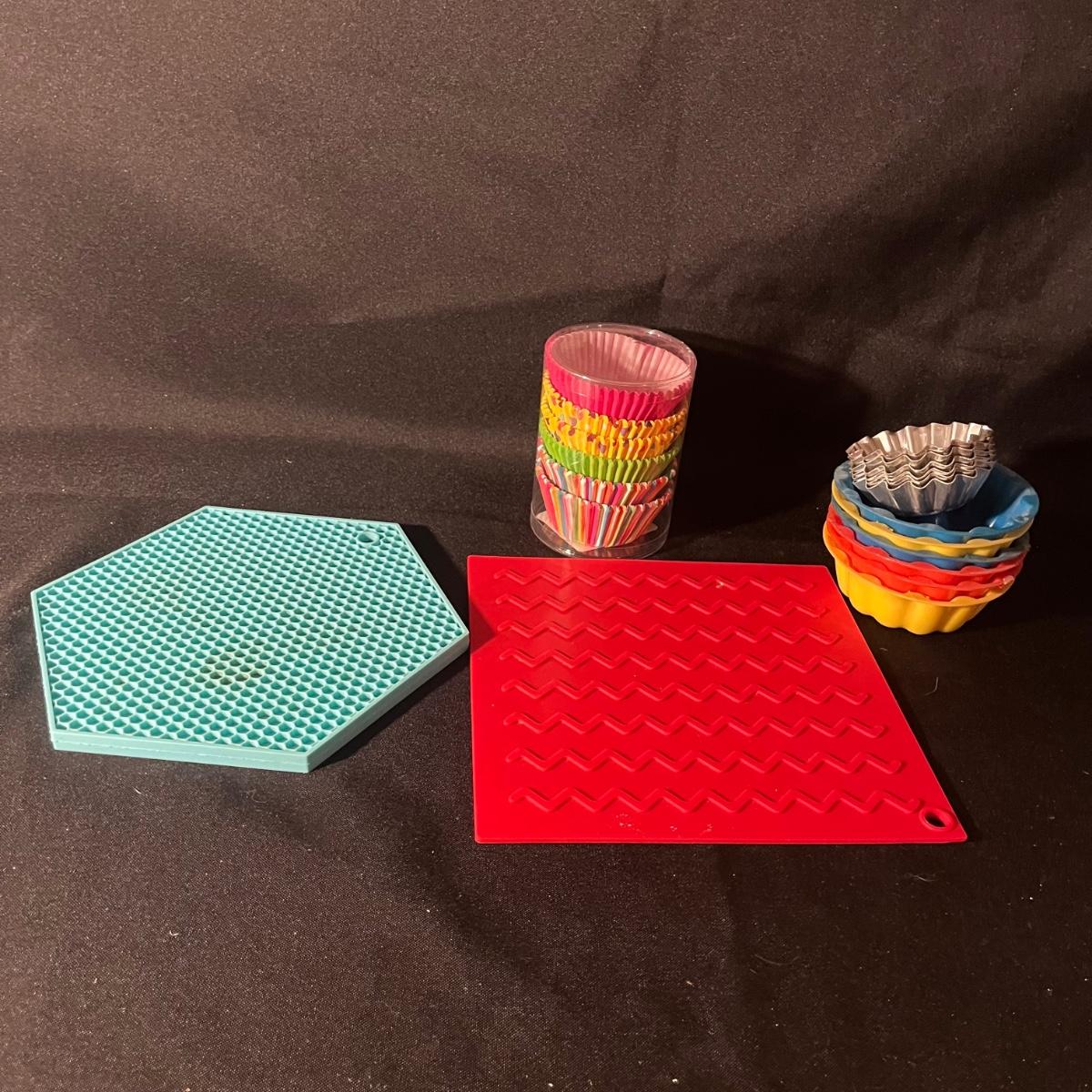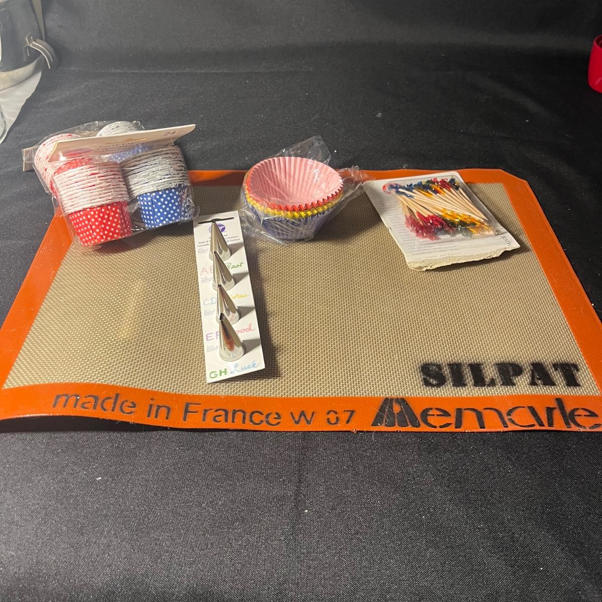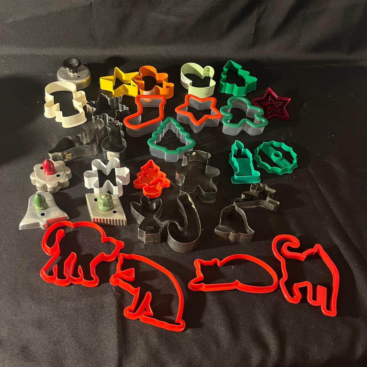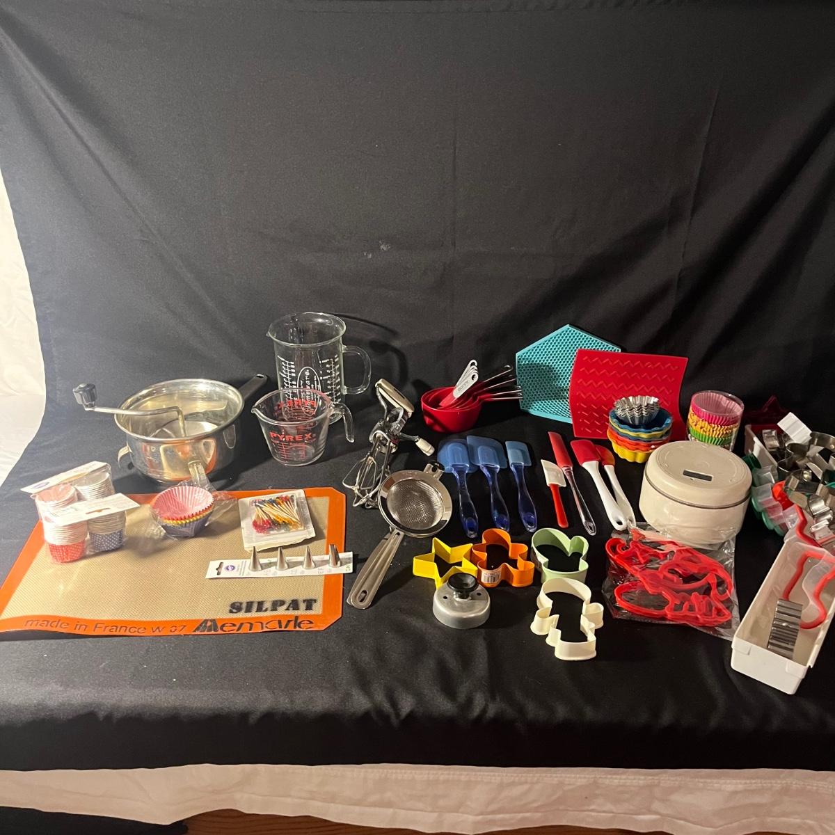 Lot includes over 25 cookie cutters in plastic and metal, Braun scale, hand mixer, spatulas, glass measuring cups, sifter, Silpat cooking sheet and more.