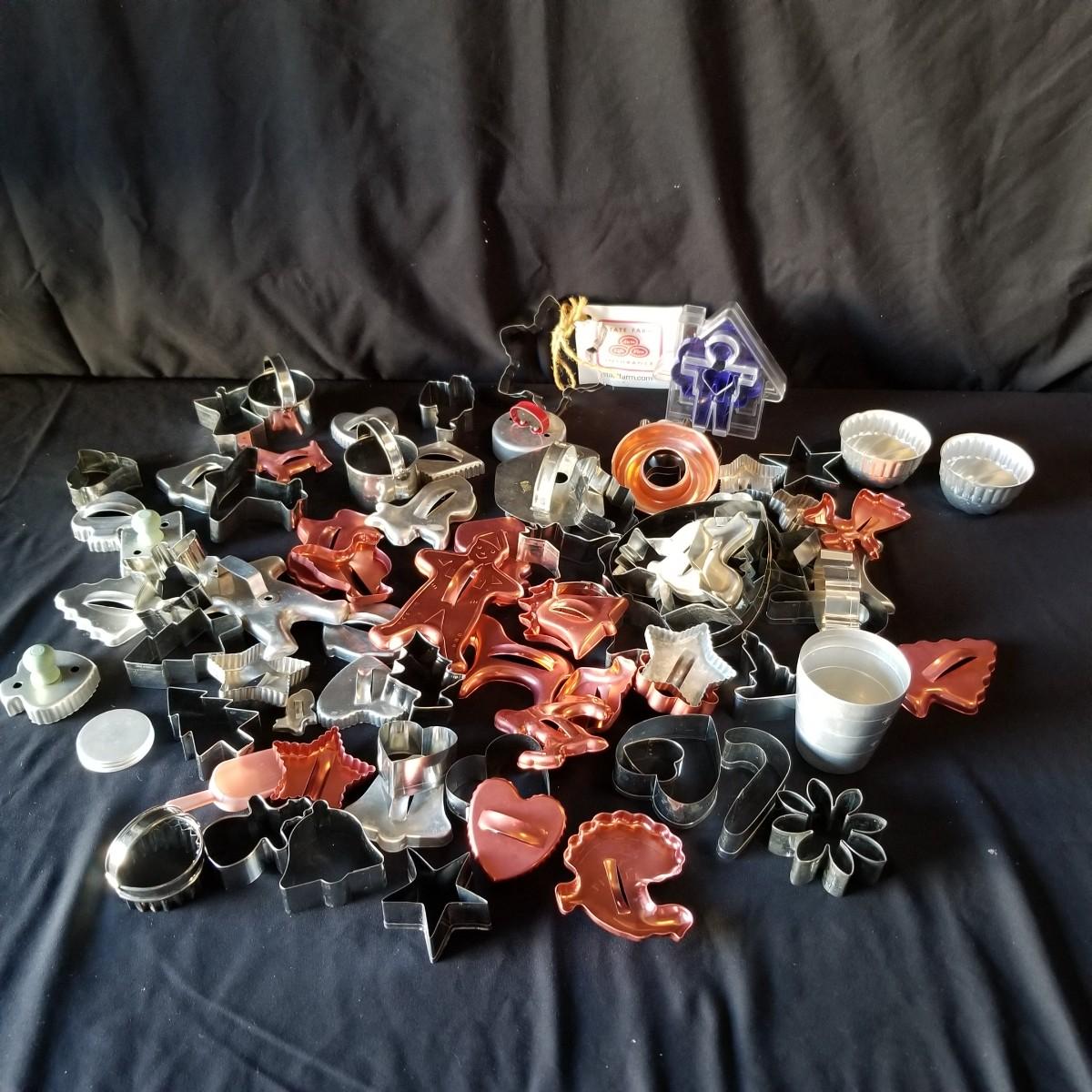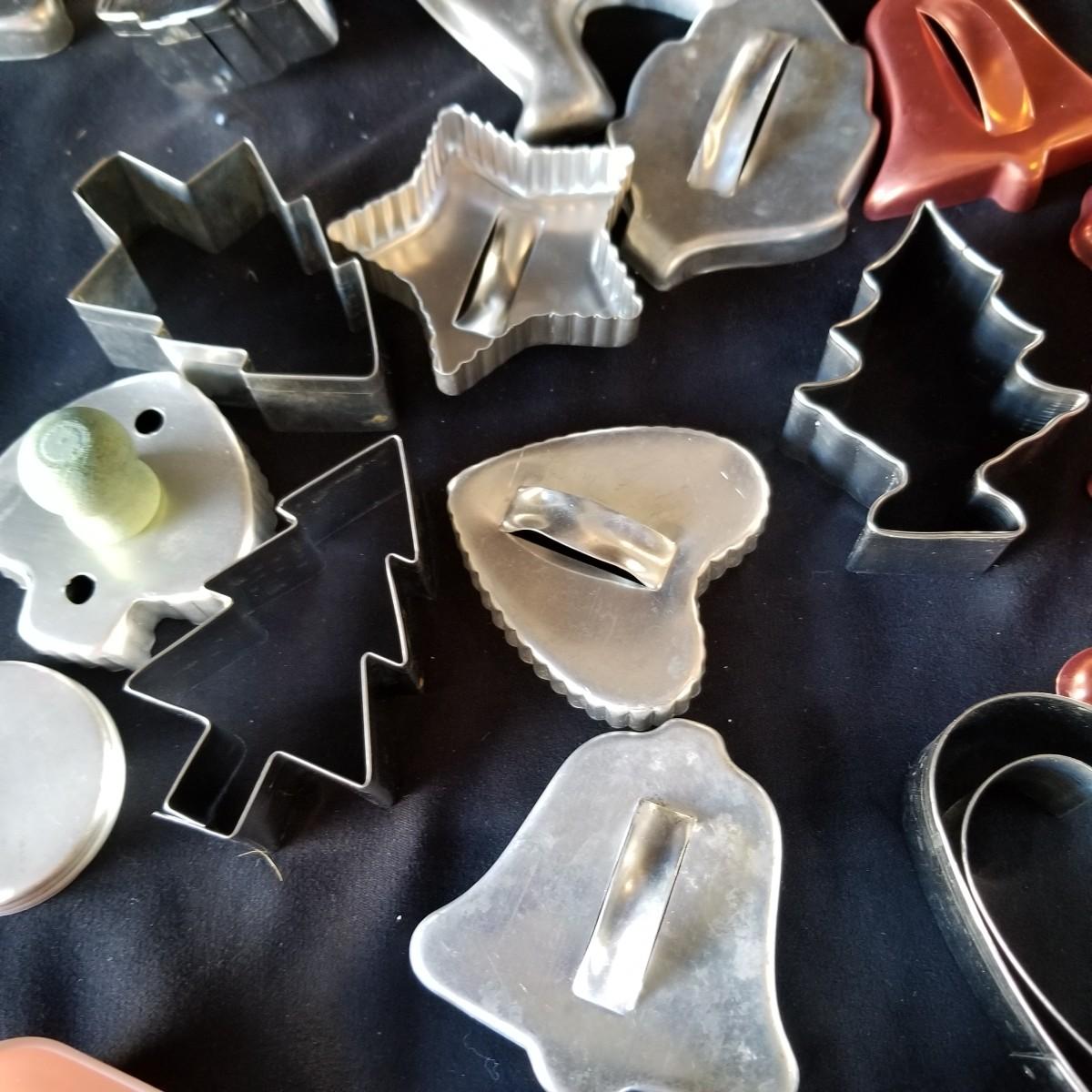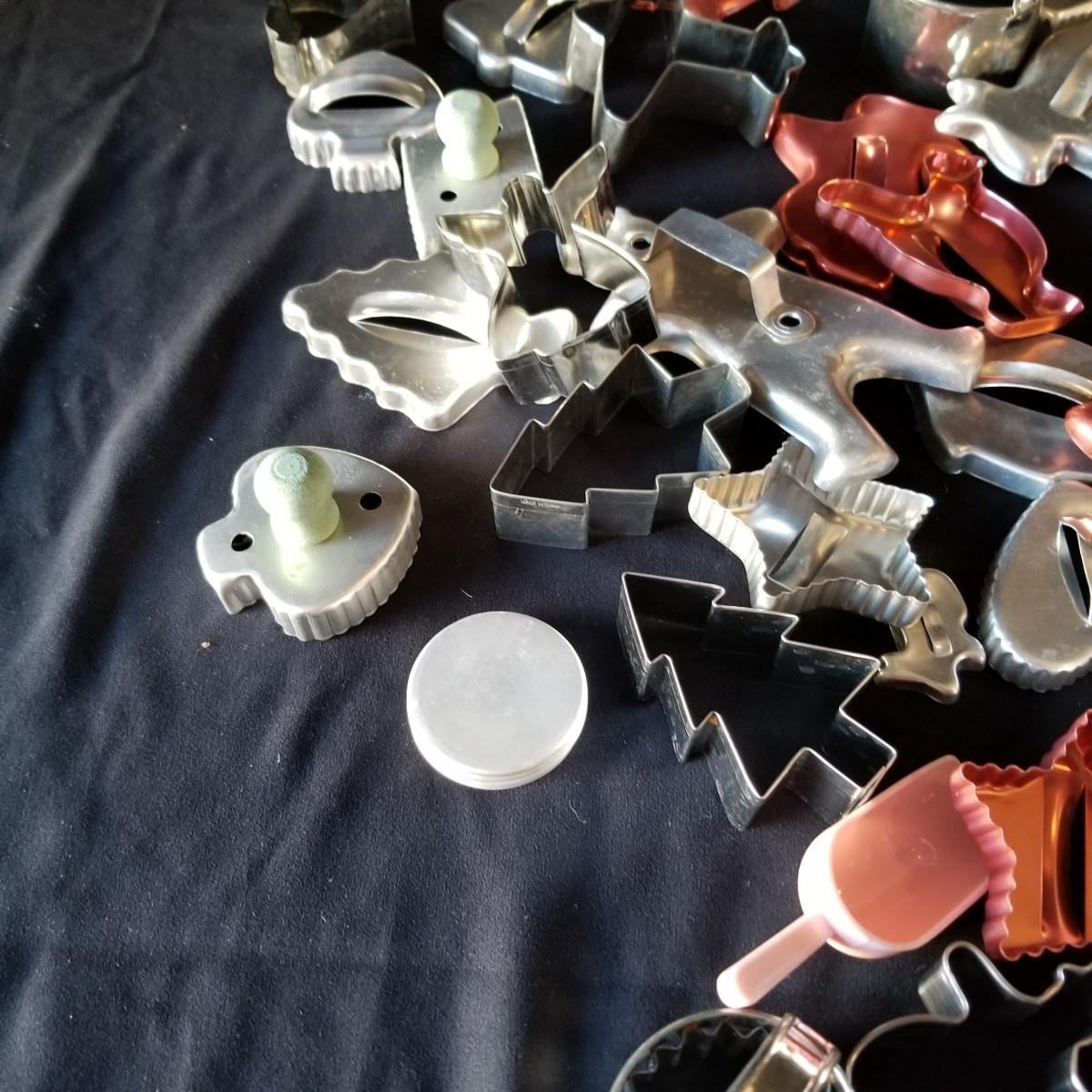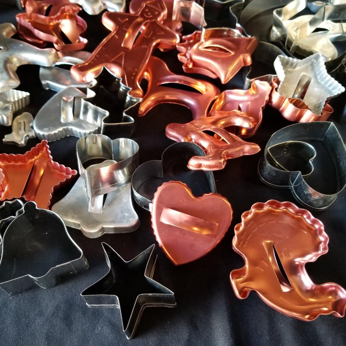 A mixture of old and new cookie cutters. The majority of items are Christmas themed but there are also hearts, rounds, animals and more. Seventy-five + pieces total. Cutters in fair to good shape. See photos for details. Shipping available.