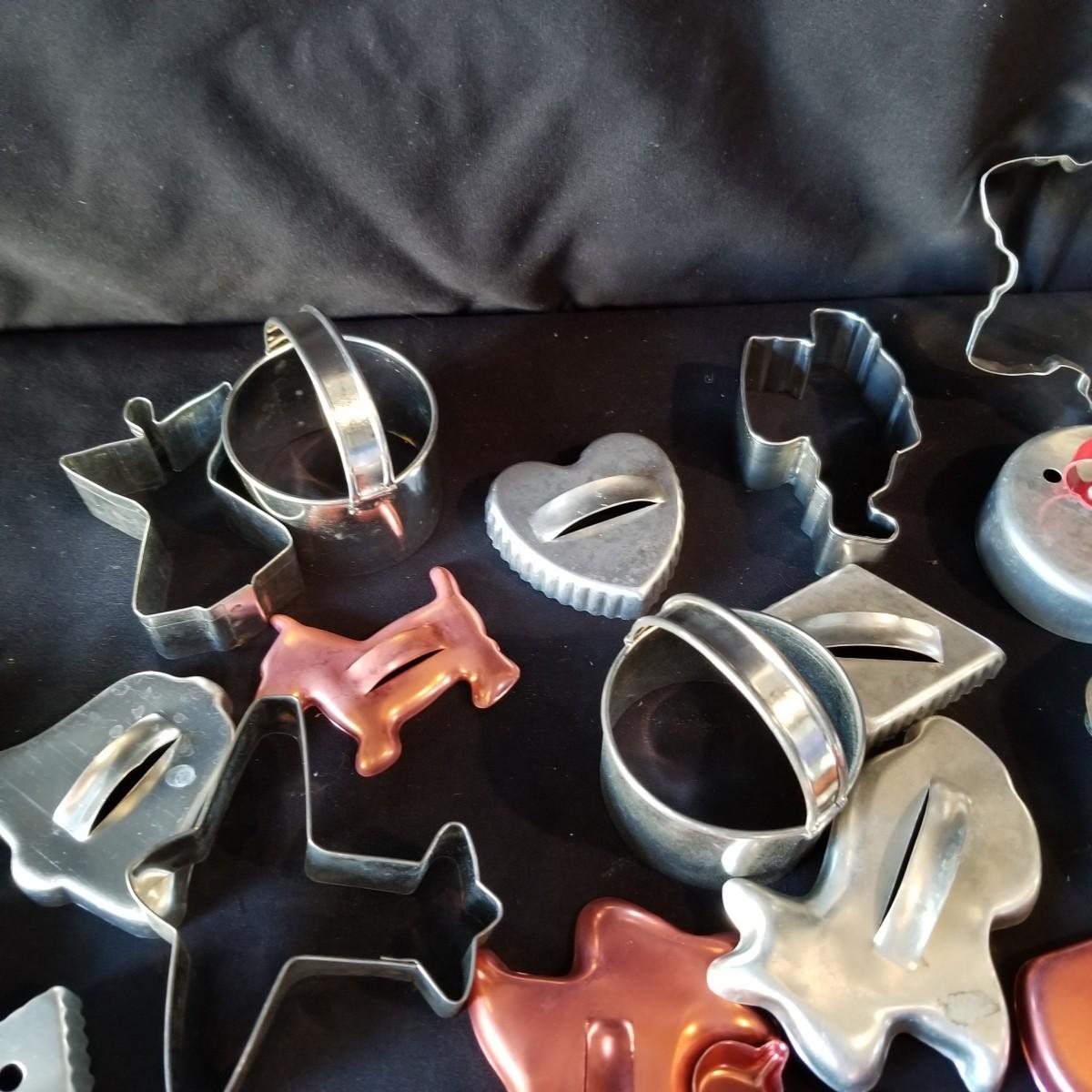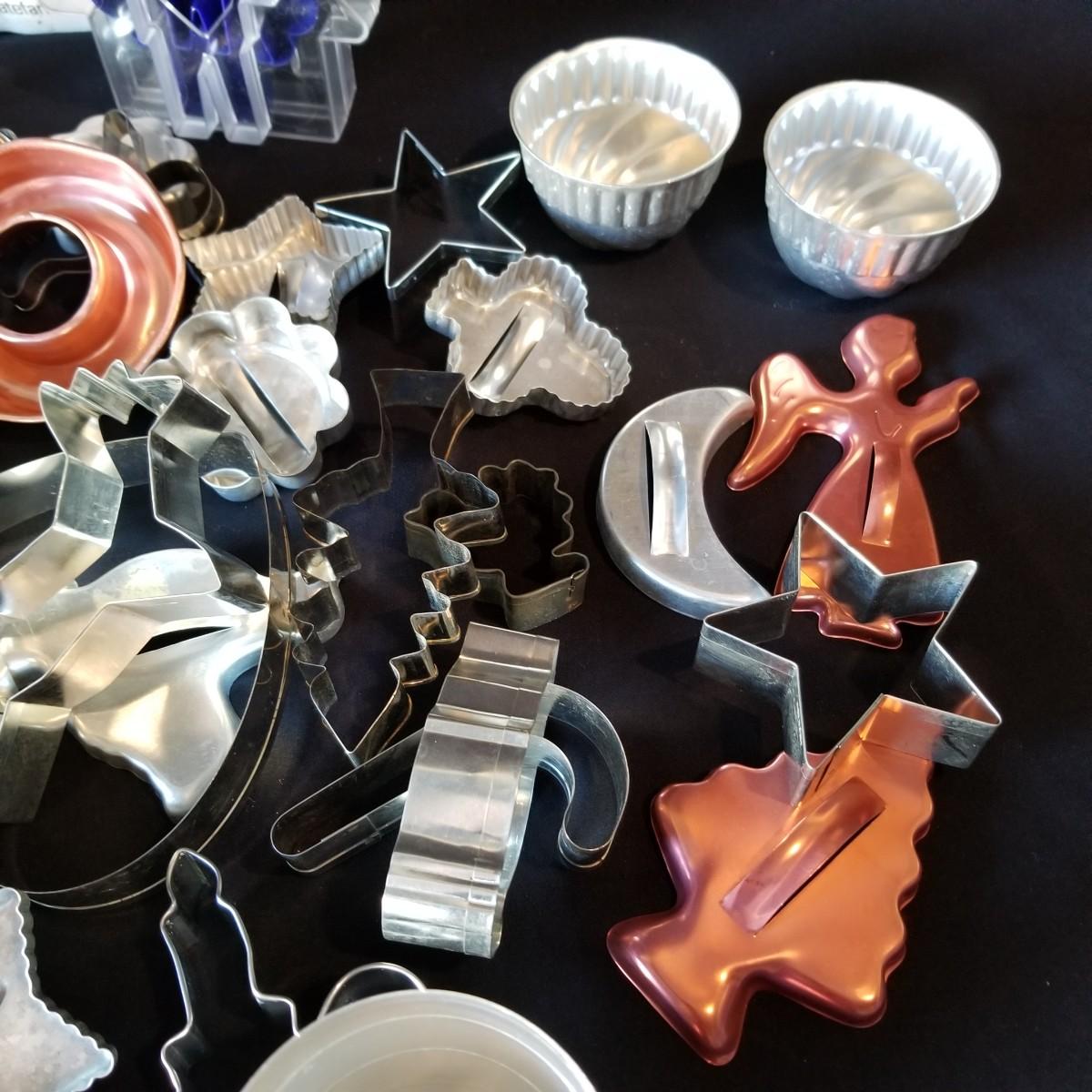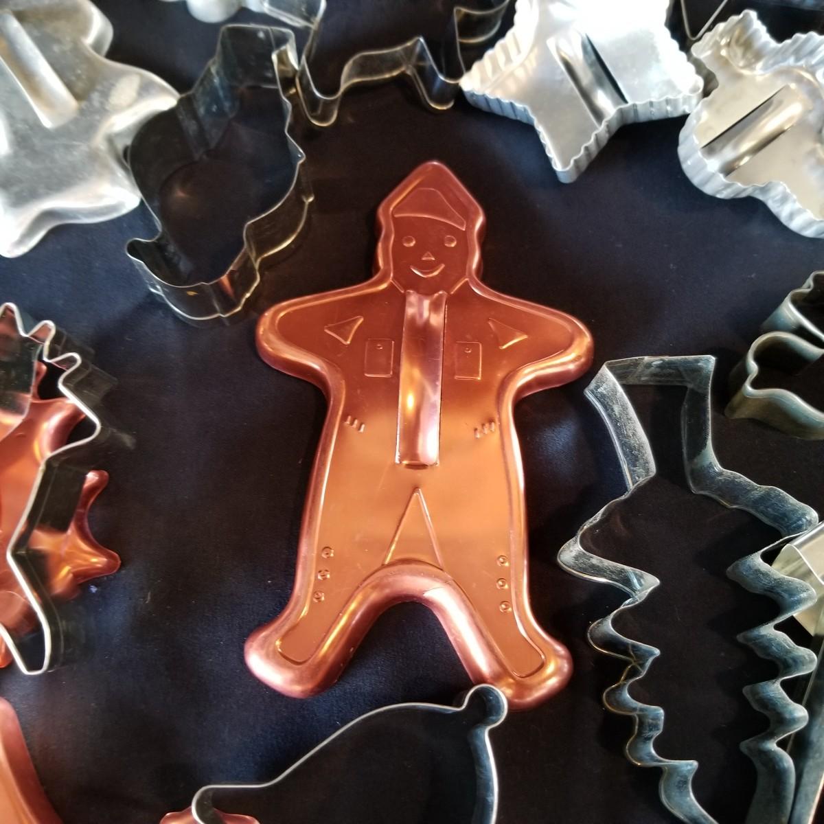 A mixture of old and new cookie cutters. The majority of items are Christmas themed but there are also hearts, rounds, animals and more. Seventy-five + pieces total. Cutters in fair to good shape. See photos for details. Shipping available.