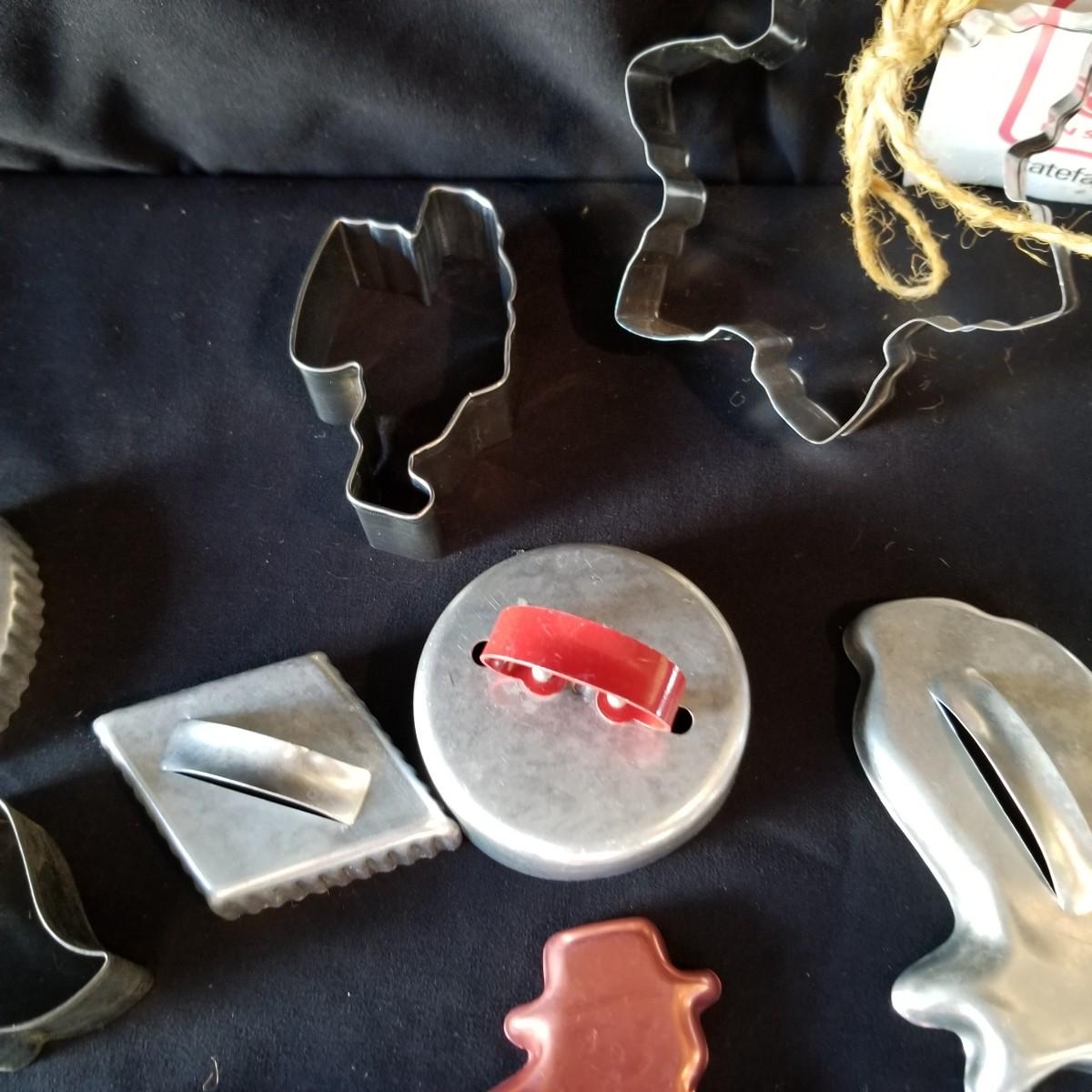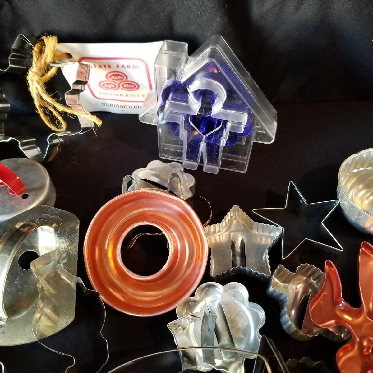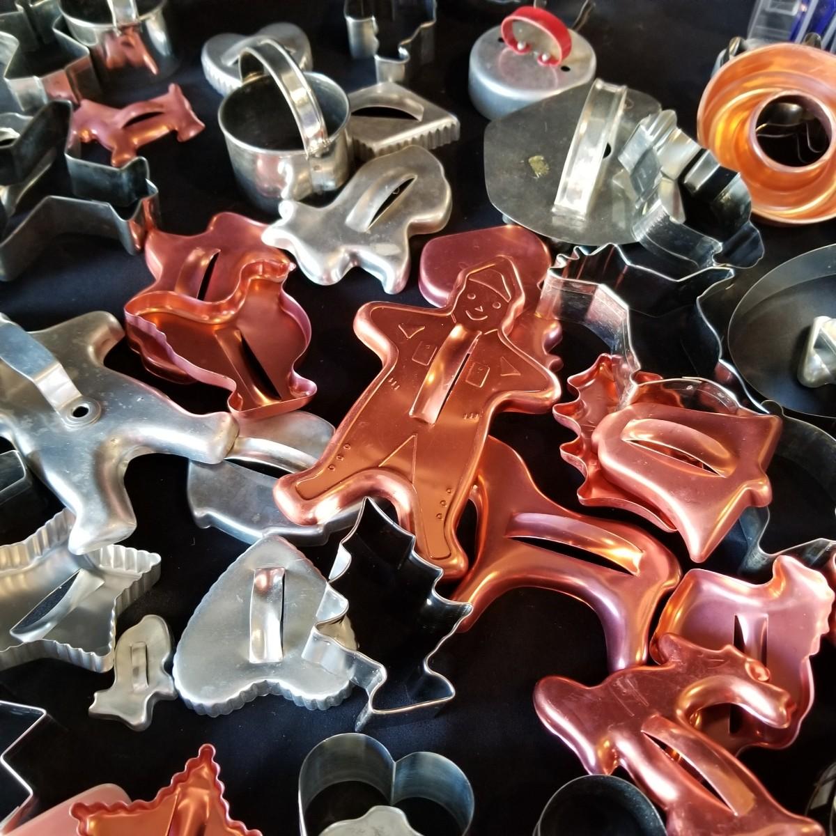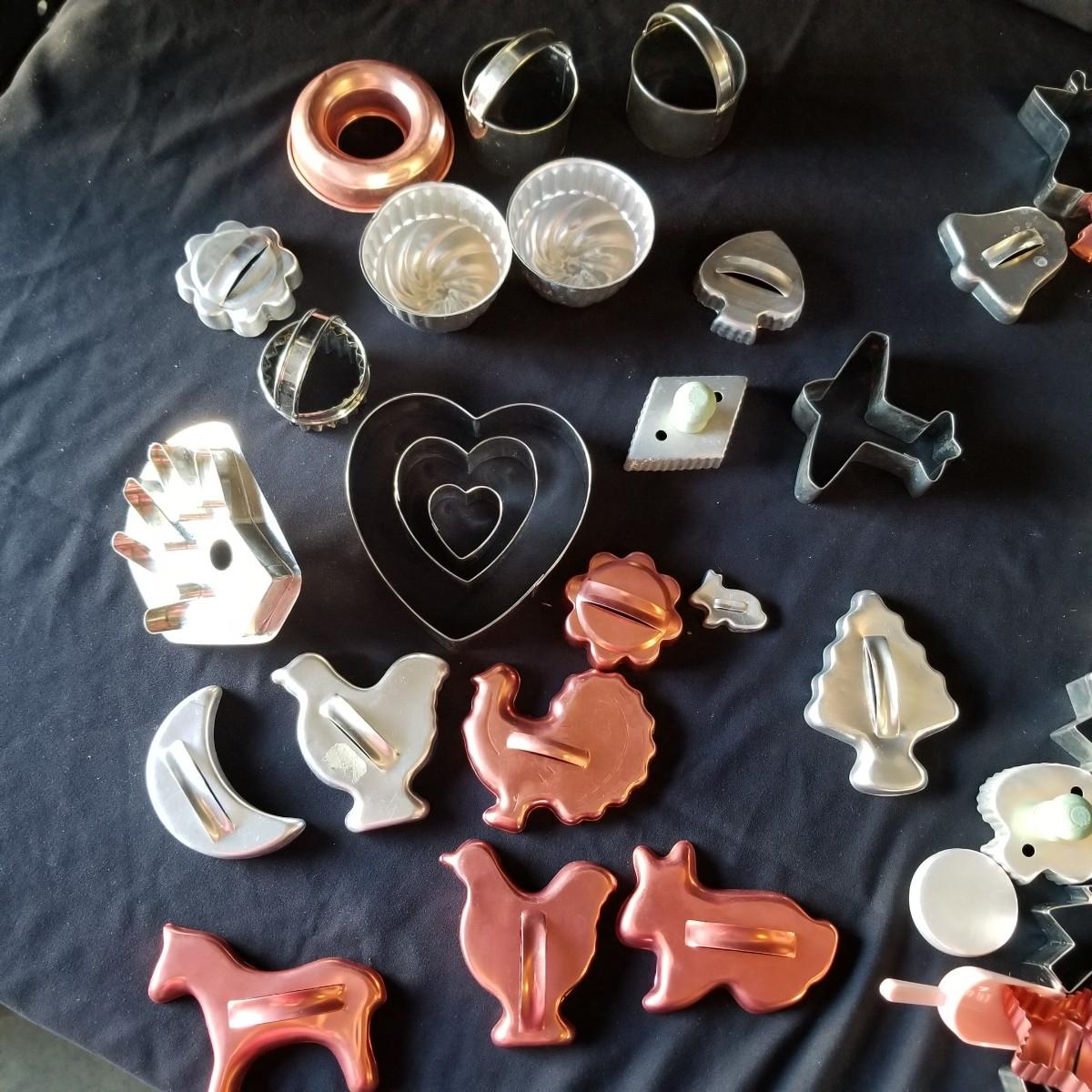 A mixture of old and new cookie cutters. The majority of items are Christmas themed but there are also hearts, rounds, animals and more. Seventy-five + pieces total. Cutters in fair to good shape. See photos for details. Shipping available.