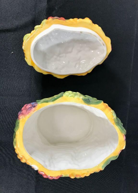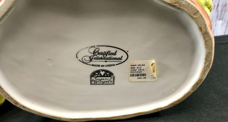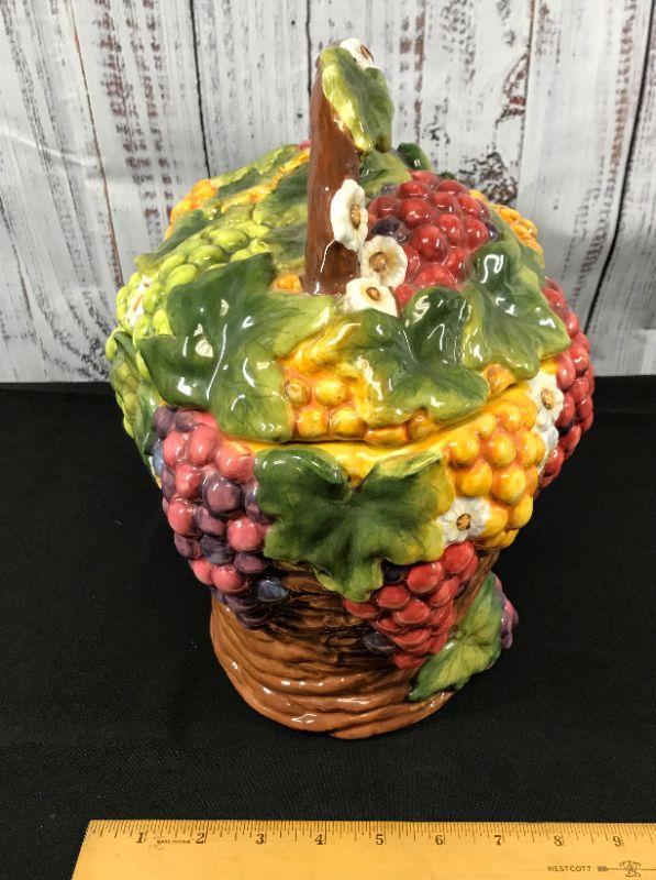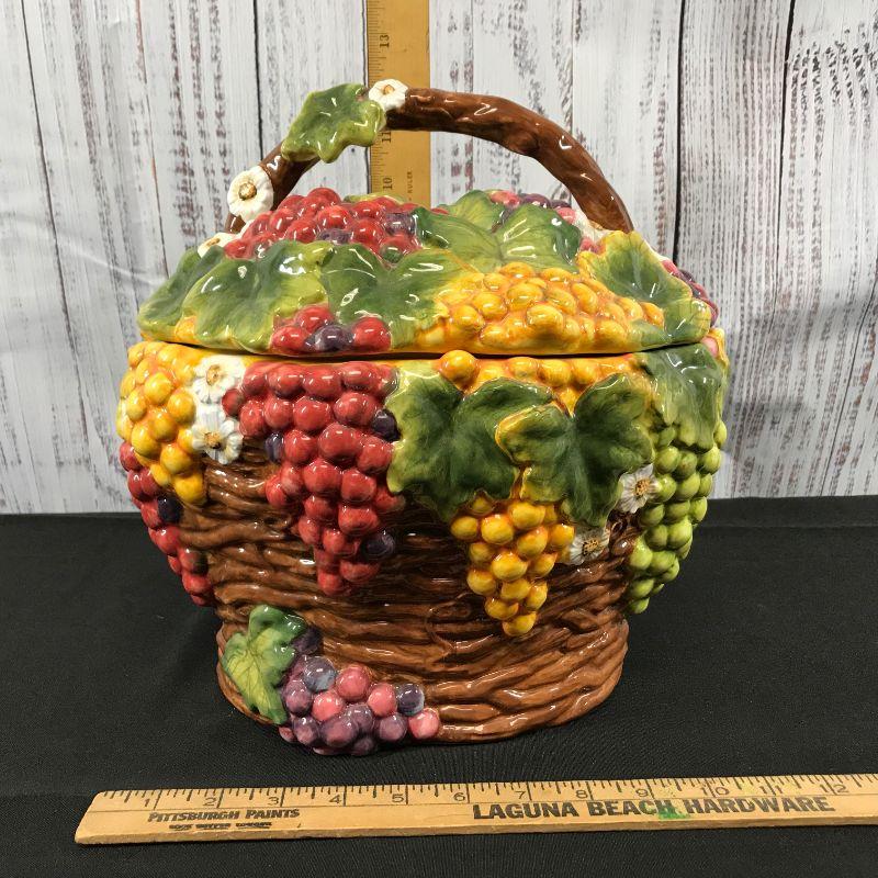 Hand painted Susan Winget 'Vineyard' Cookie Lovely majolica-style stoneware cookie jar from the Vineyard collection by Susan Winget. Inspired by the lush Tuscan grape country these stunning ceramic pieces are richly hand painted and beautifully embossed. Spectacular cookie jar with a brown grape vine background, watermelon red, purply-pink, golden-yellow, and lime green grapes and green grape leaves. The lid is solid embossed grapes and the handle is a brown grape vine and is also accented with green grape leaves and white blossoms and the interior is white. Not recommended for use in dishwasher or microwave. Hand wash. It measures 11 1/4 inches spout to handle and is 8 1/4 inches tall. In good, gently used condition. #020-1220-00208