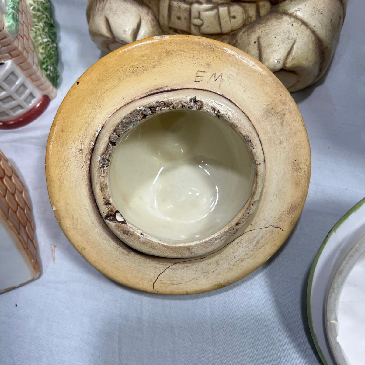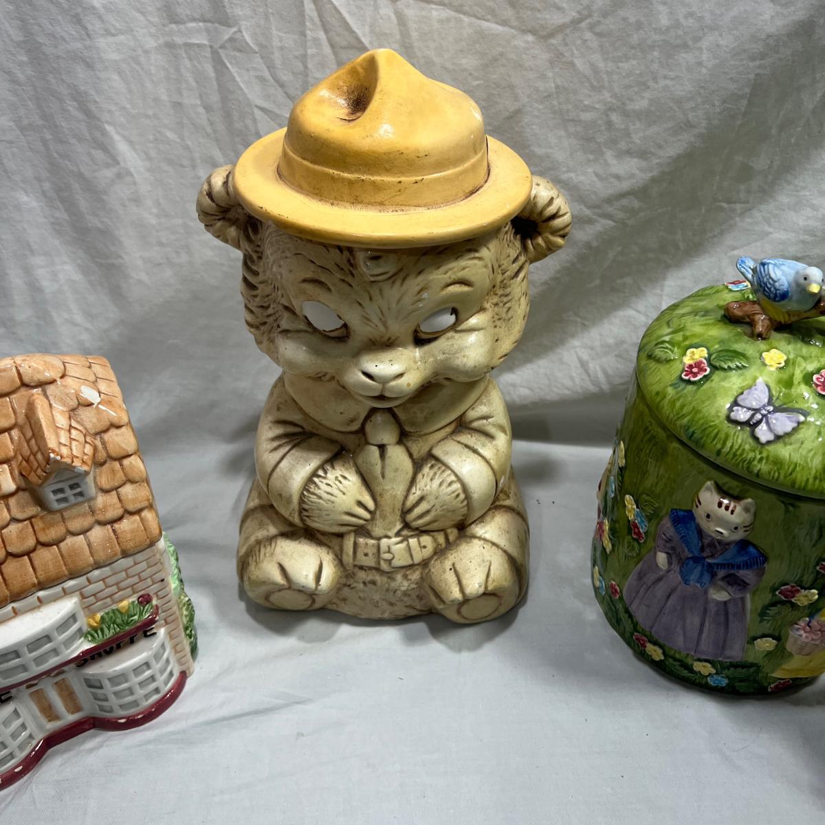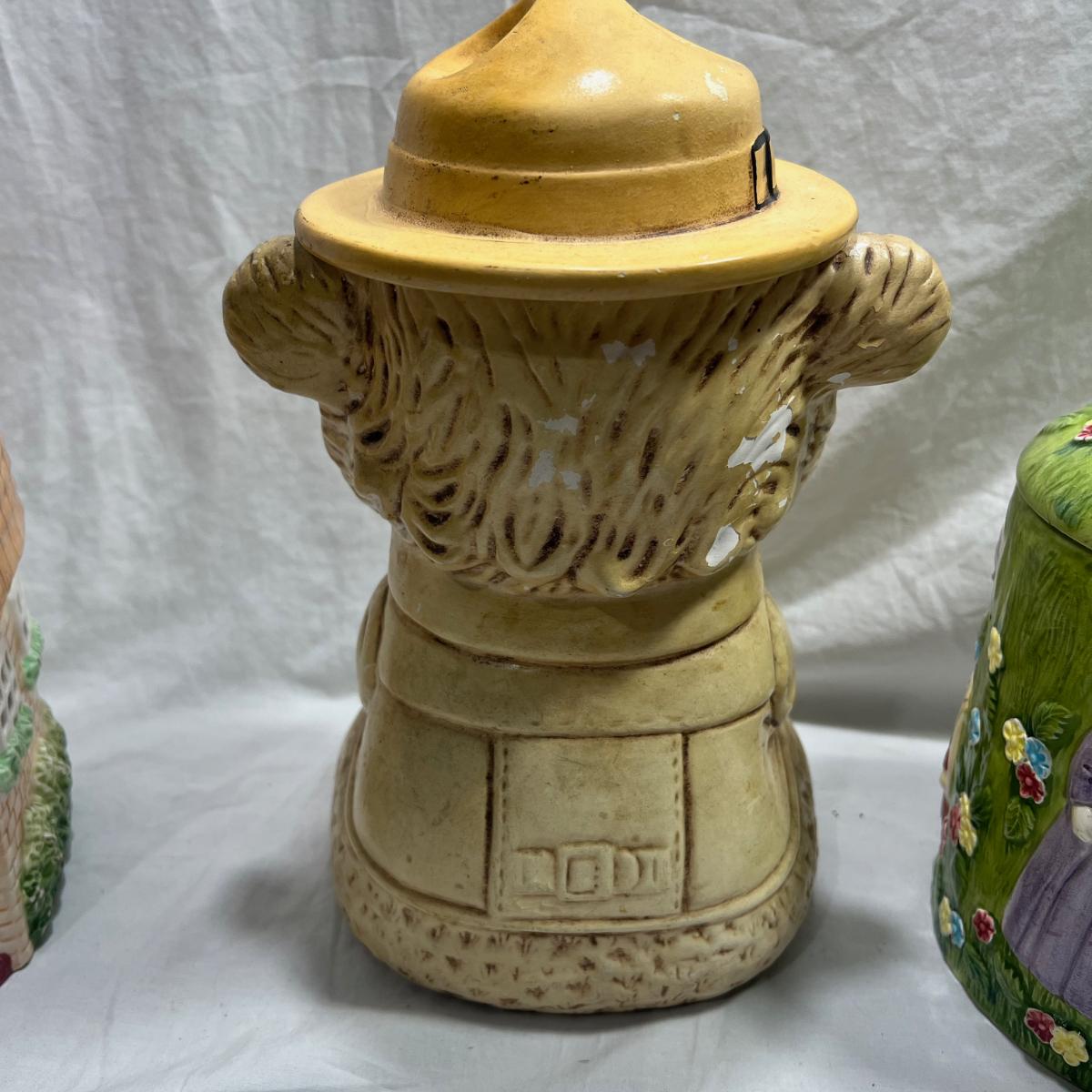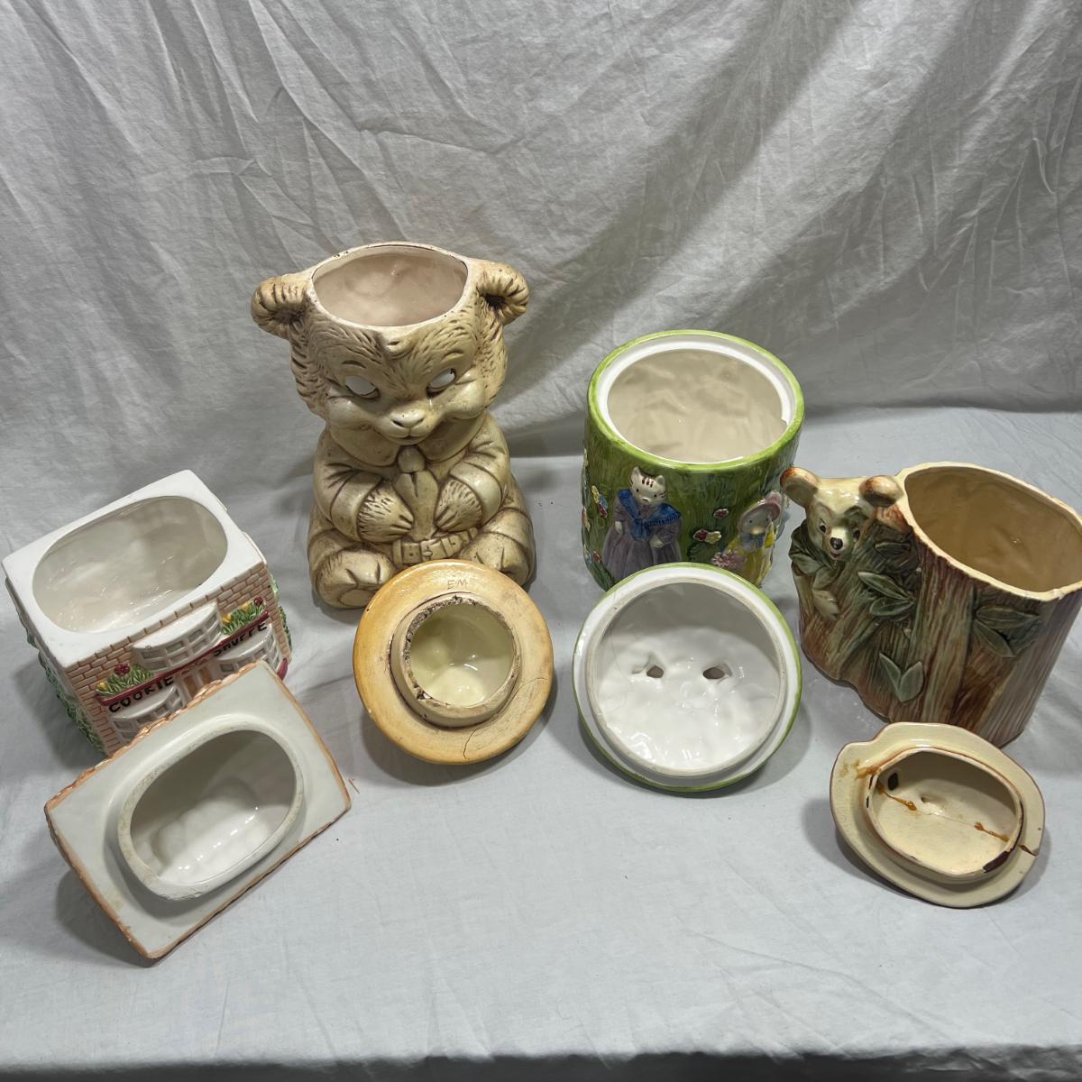 Vintage Cookie jars with well loved marks, some paint chips, cracks, and other signs of being well loved. Would be great for repurposing like planter pots or other fun ideas. Items are as is.