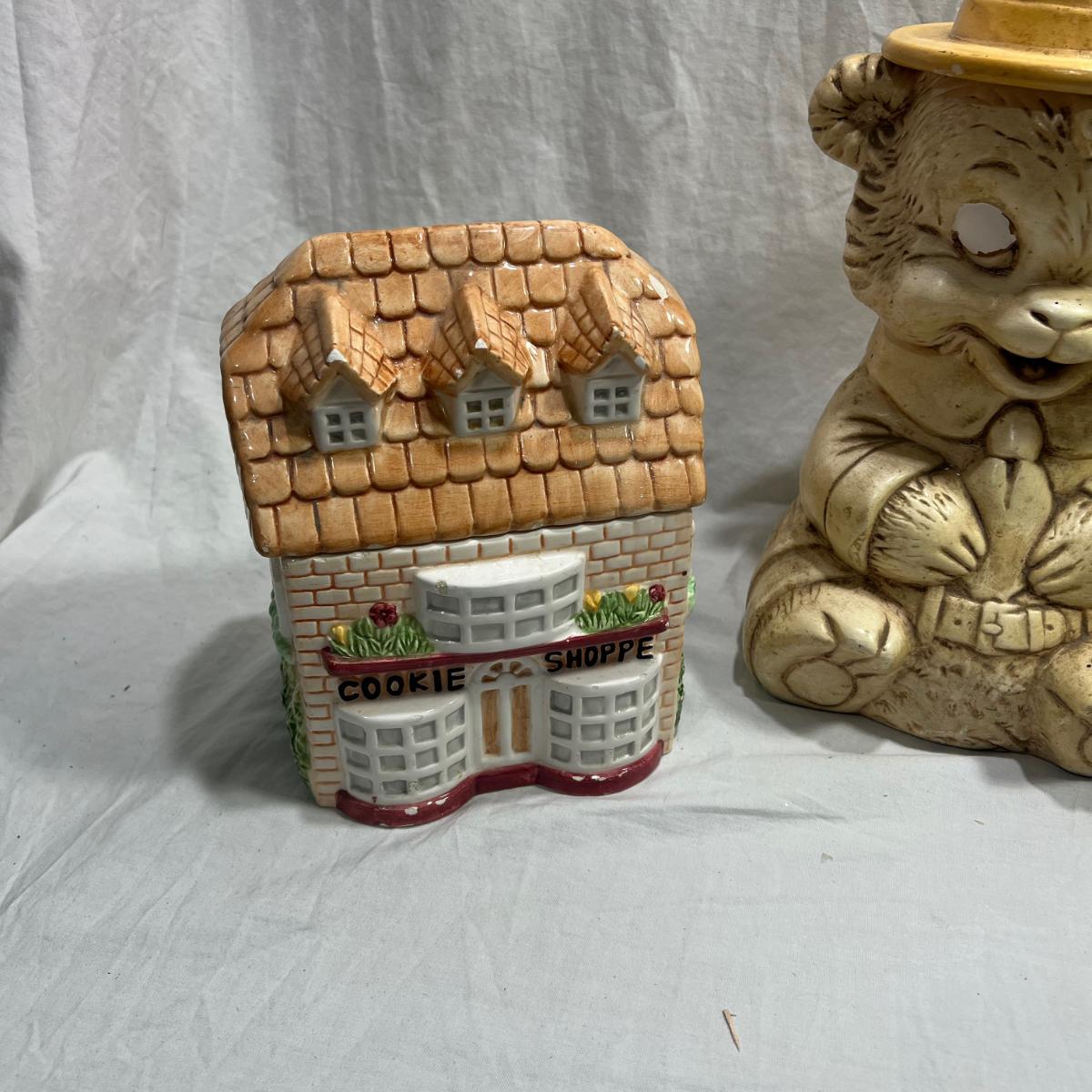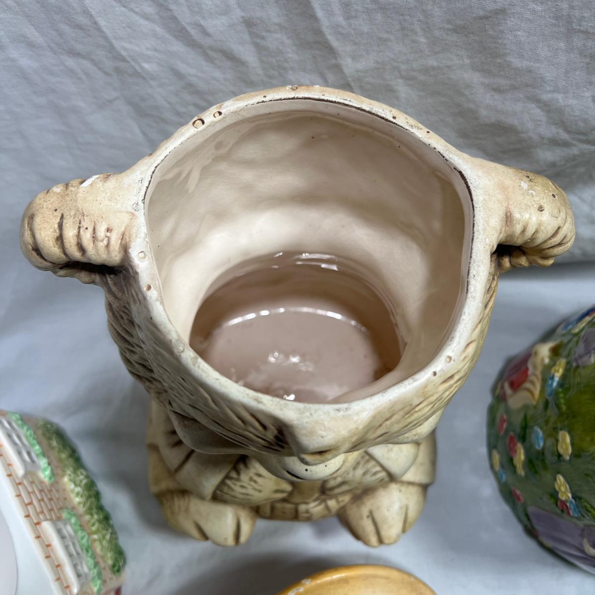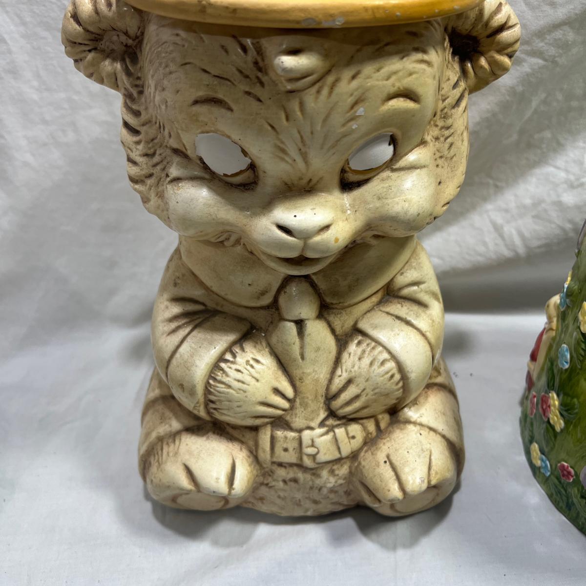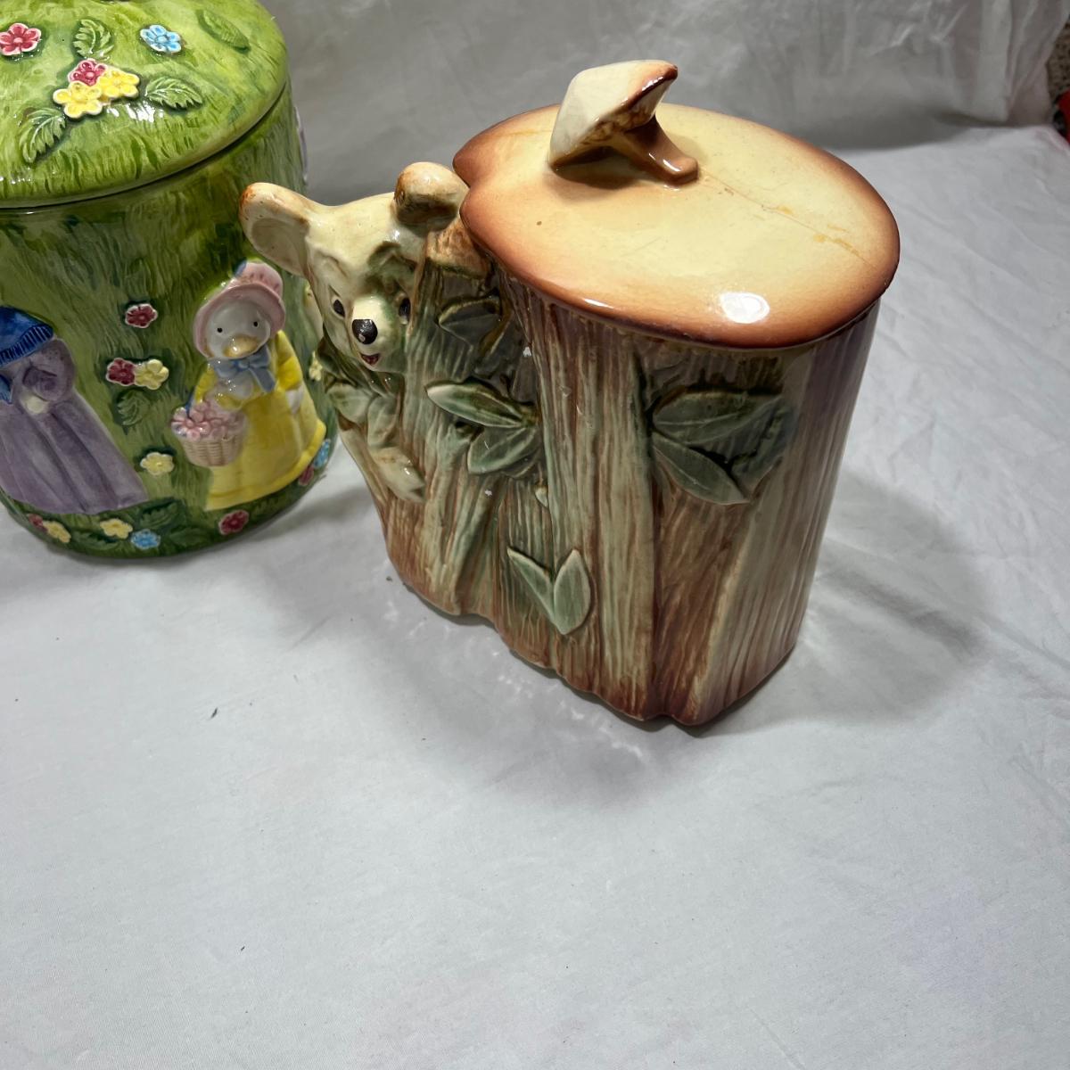 Vintage Cookie jars with well loved marks, some paint chips, cracks, and other signs of being well loved. Would be great for repurposing like planter pots or other fun ideas. Items are as is.