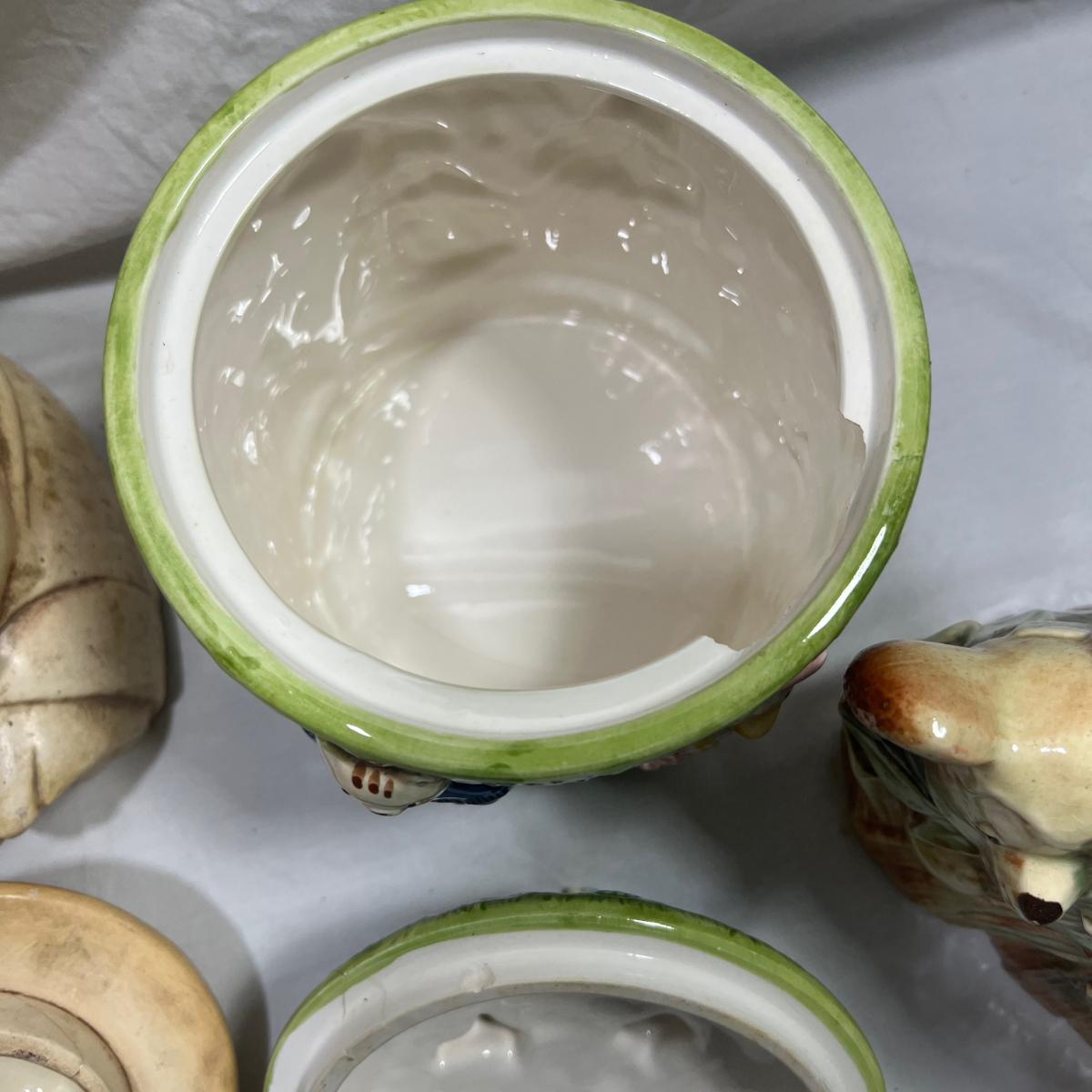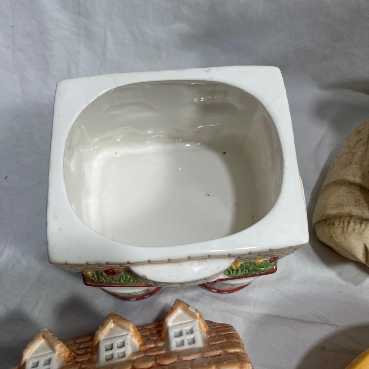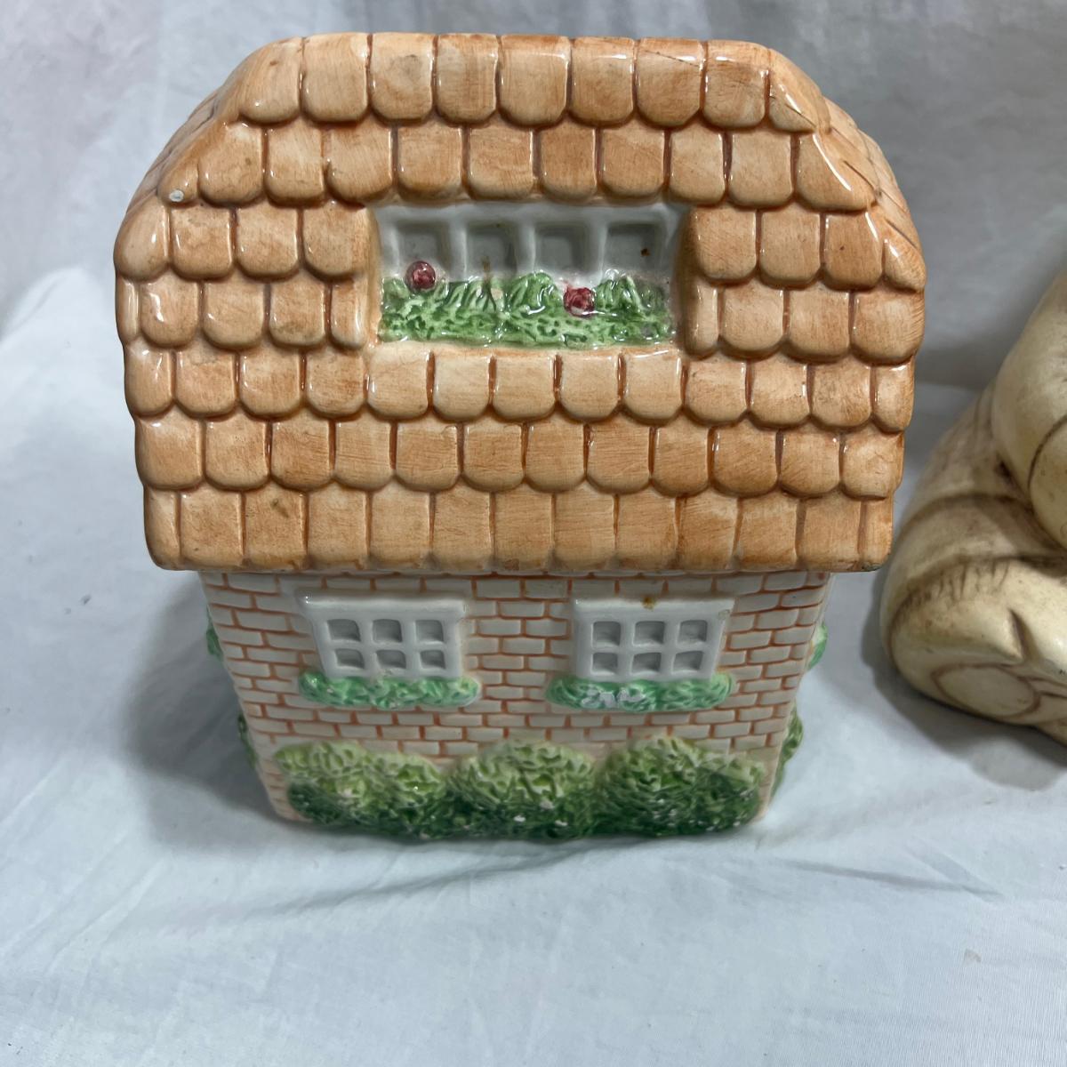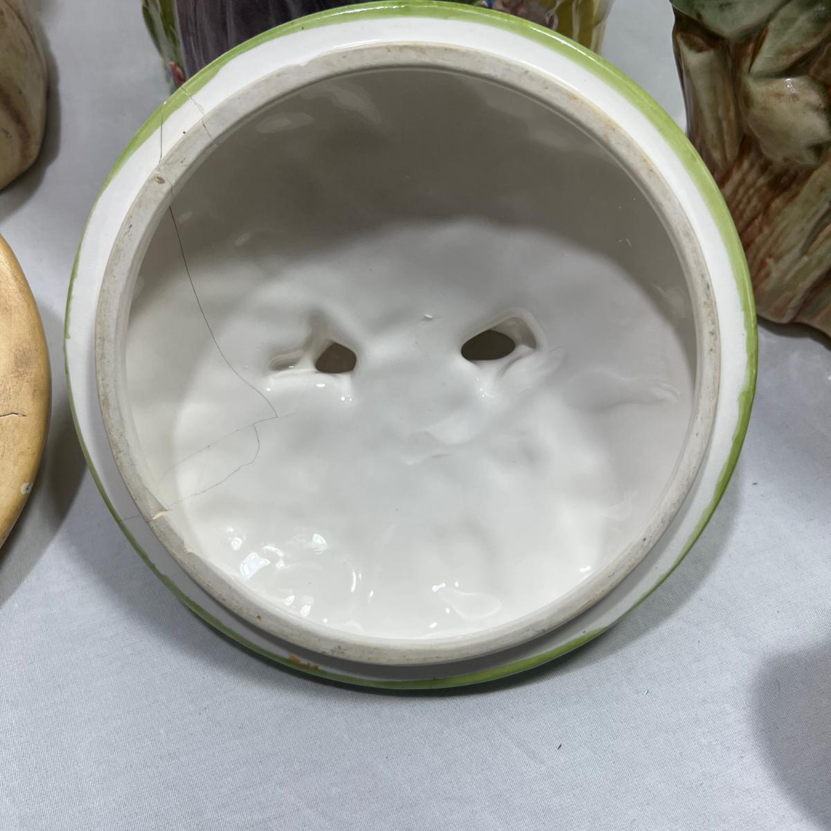 Vintage Cookie jars with well loved marks, some paint chips, cracks, and other signs of being well loved. Would be great for repurposing like planter pots or other fun ideas. Items are as is.