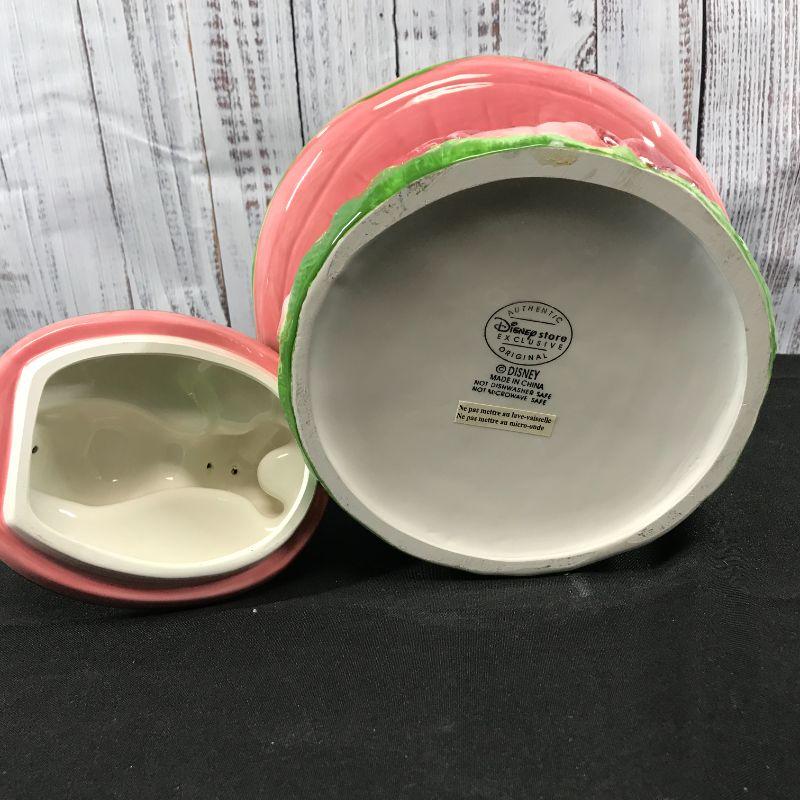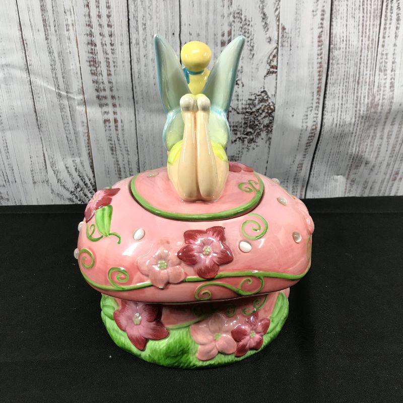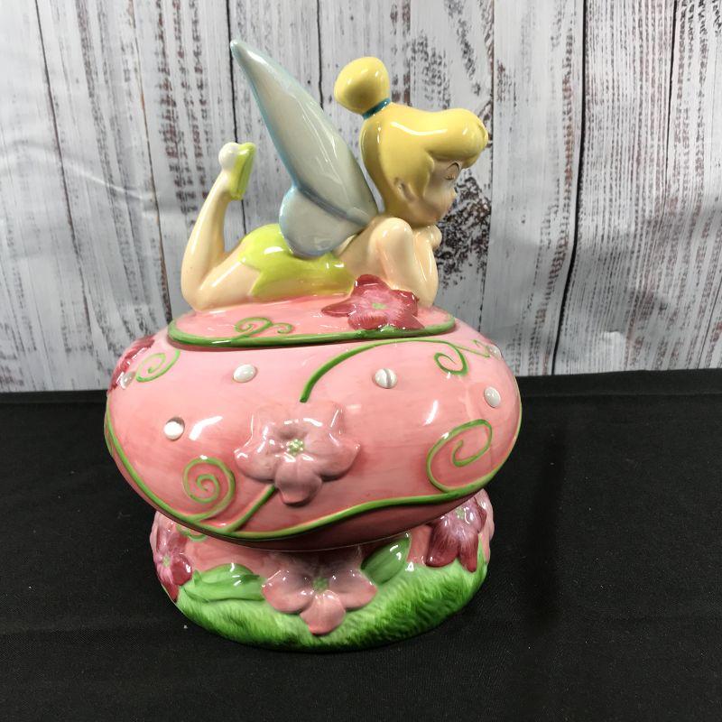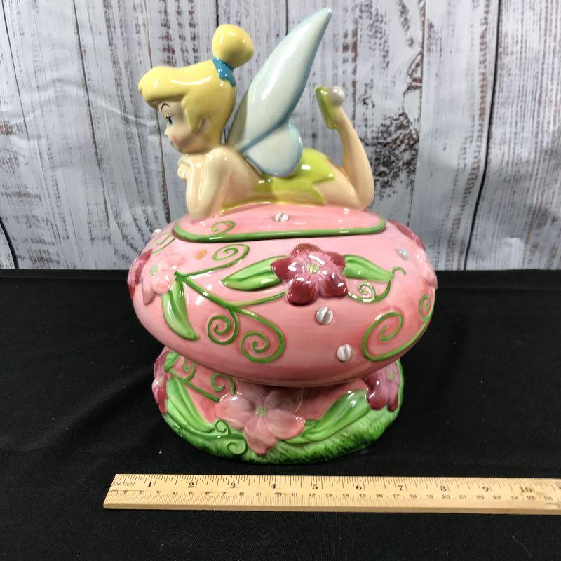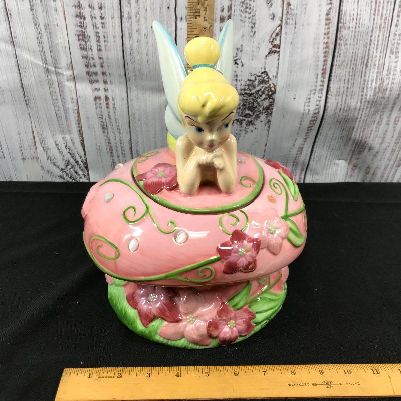 A Disney Store exclusive, Peter Pan's Tinkerbell ceramic cookie jar. Tinkerbell is atop a pink floral mushroom. Good condition. About 12" size. #020-00238