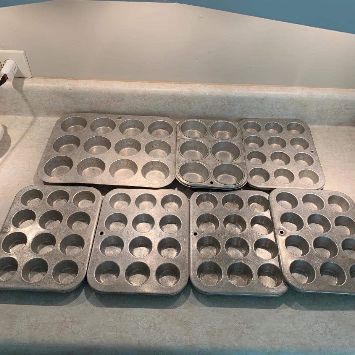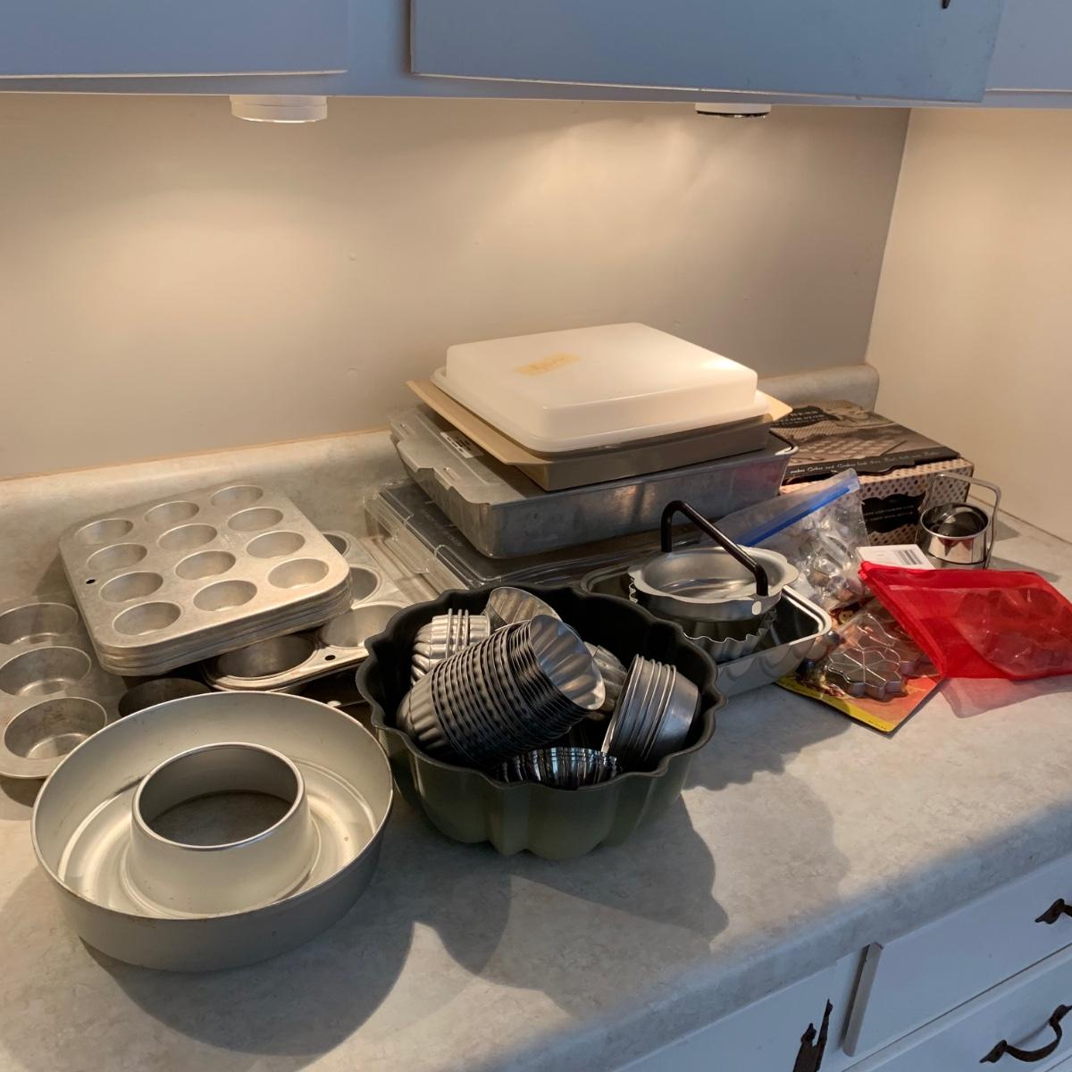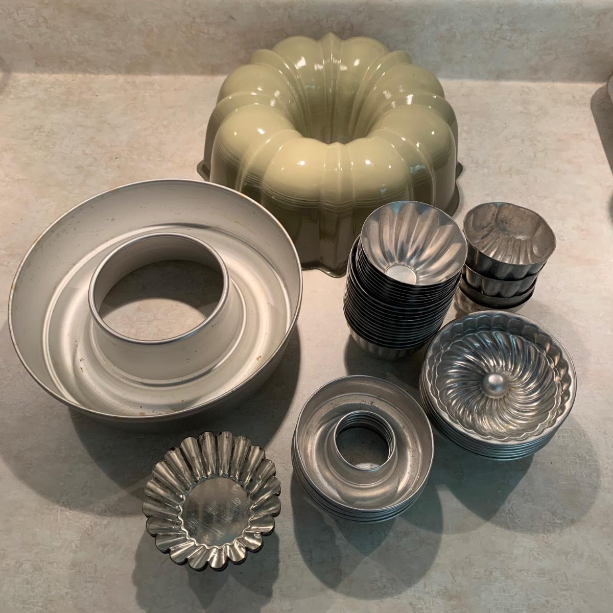 This lot is full of items used for making, decorating, and transporting cookies, cakes, muffins, and more! There is a Sears brand “Cooke Press & Cake Decorator 19 Piece Aluminum Set”. It is used, but appears to be in very good condition. A few holiday themed cookie cutters are included in the lot. There are seven cupcake/muffin tins, five of which are for mini muffins. There are a few different cake molds, including two Bundt cake pans. There are 20+ small molds for mini cakes or jello treats. Also included are two 9x13 aluminum baking pans and one deviled egg carrying Tupperware. Local pickup only.
