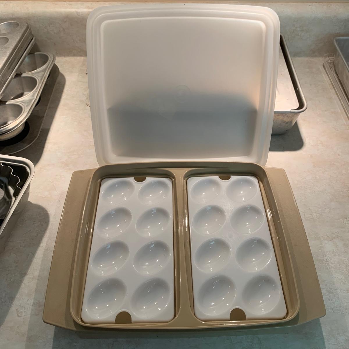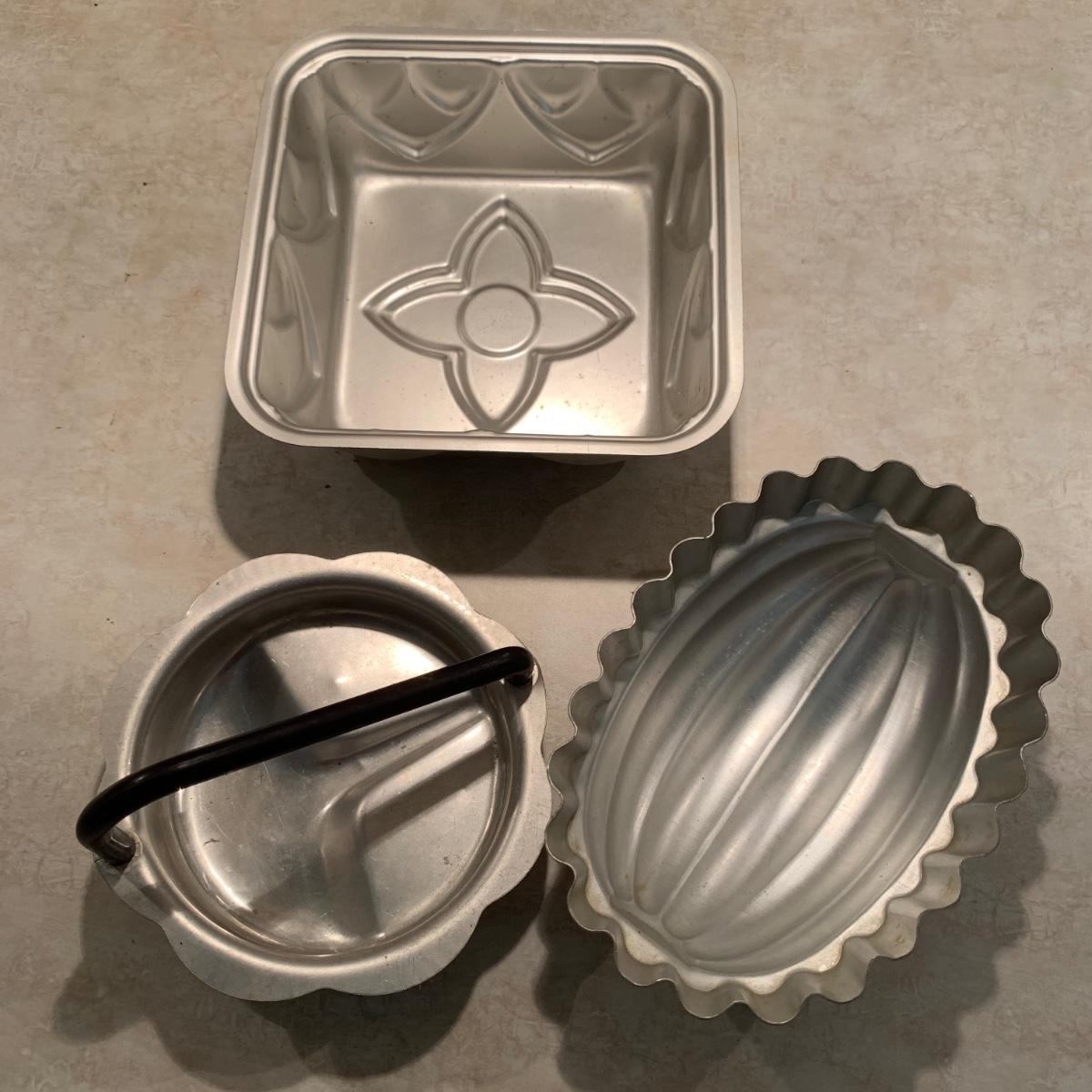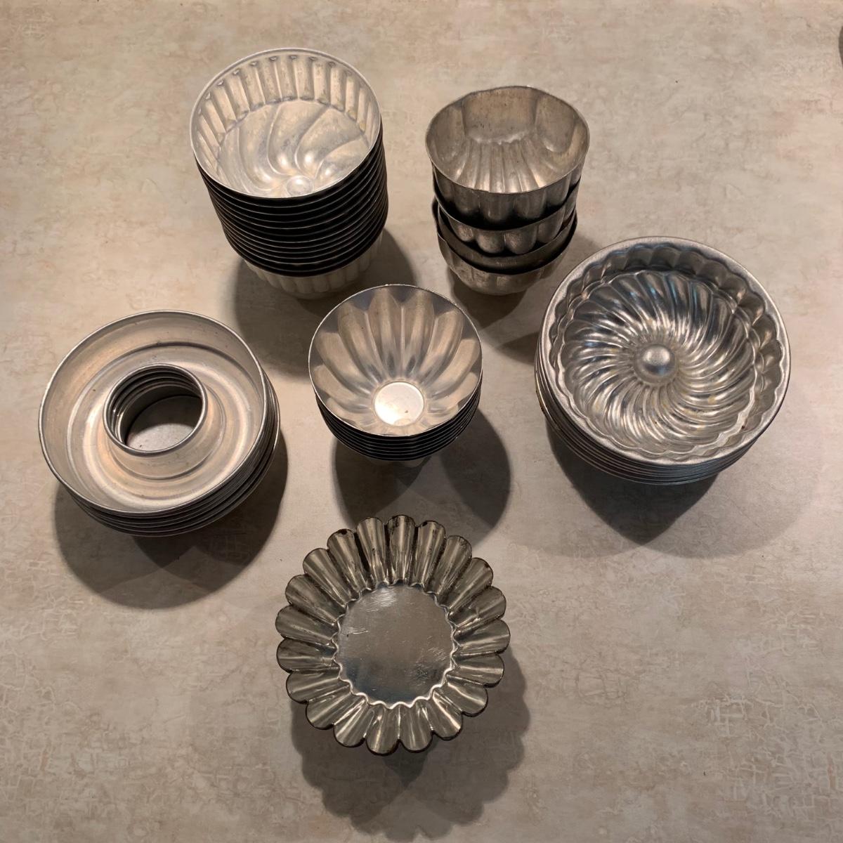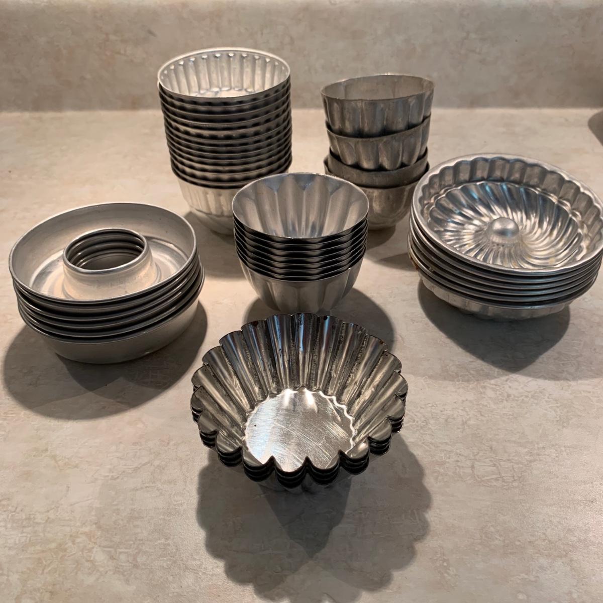 This lot is full of items used for making, decorating, and transporting cookies, cakes, muffins, and more! There is a Sears brand “Cooke Press & Cake Decorator 19 Piece Aluminum Set”. It is used, but appears to be in very good condition. A few holiday themed cookie cutters are included in the lot. There are seven cupcake/muffin tins, five of which are for mini muffins. There are a few different cake molds, including two Bundt cake pans. There are 20+ small molds for mini cakes or jello treats. Also included are two 9x13 aluminum baking pans and one deviled egg carrying Tupperware. Local pickup only.
