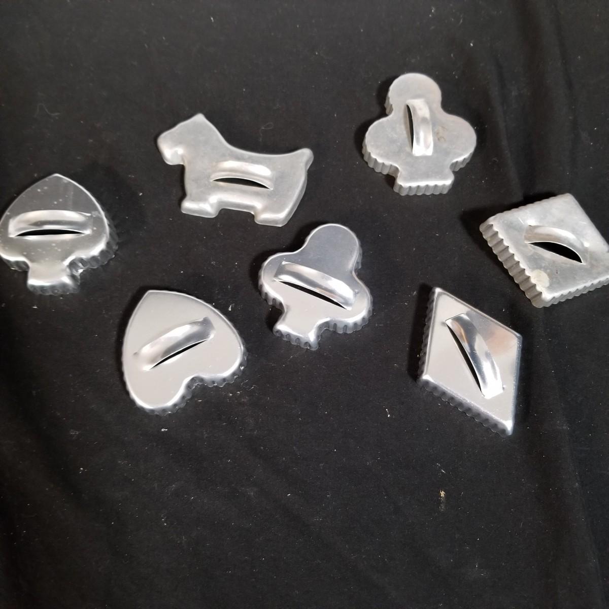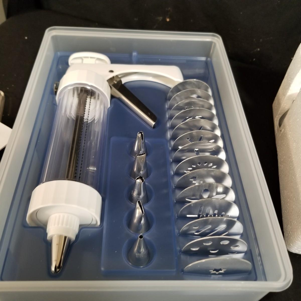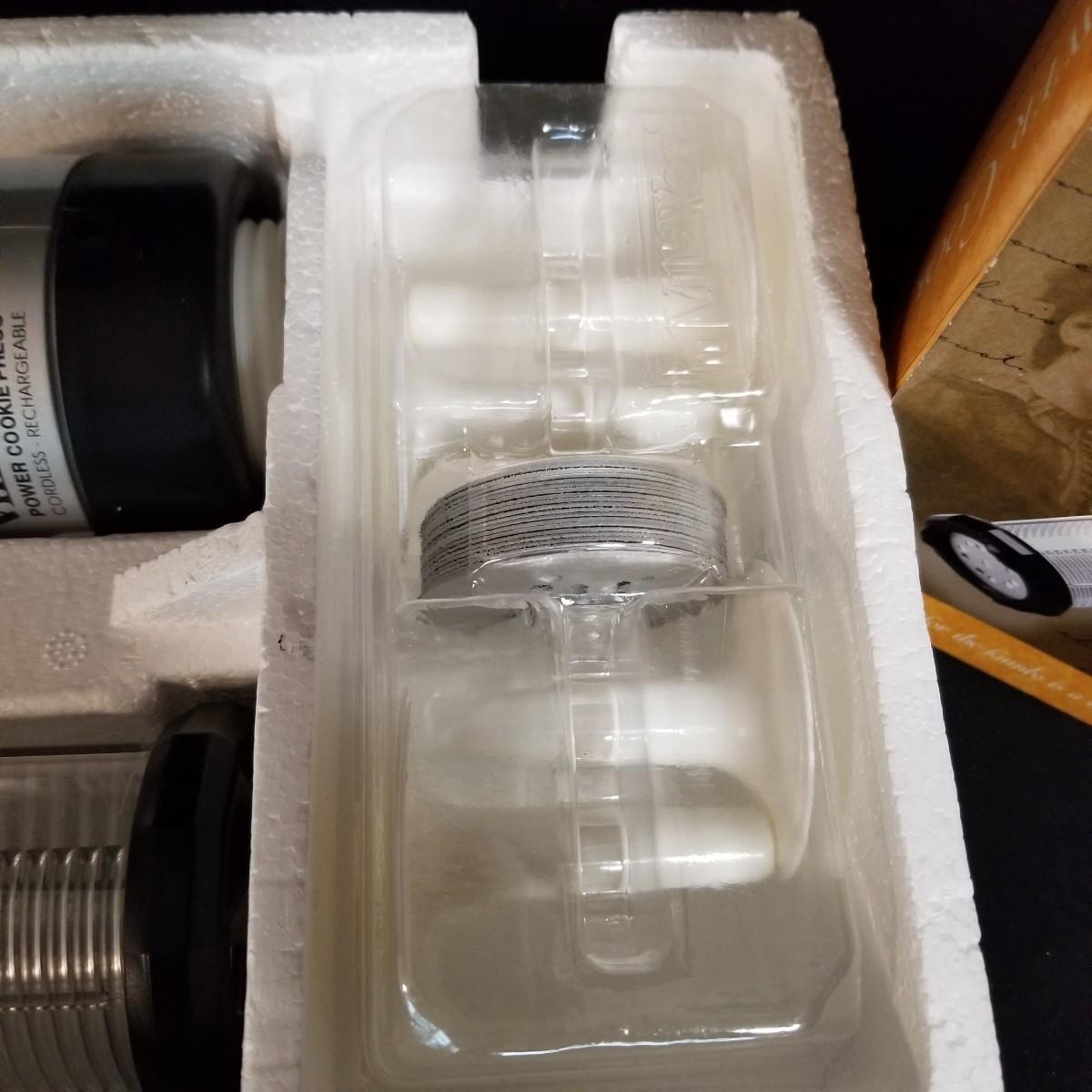 Two different cookie cutter sets, one powered and rechargeable, the other a manual squeeze type. Both items appear to be new in box. Rechargeable unit powered on when plugged in. Also includes a few old style hand cutters, see photos for details. Shipping available.