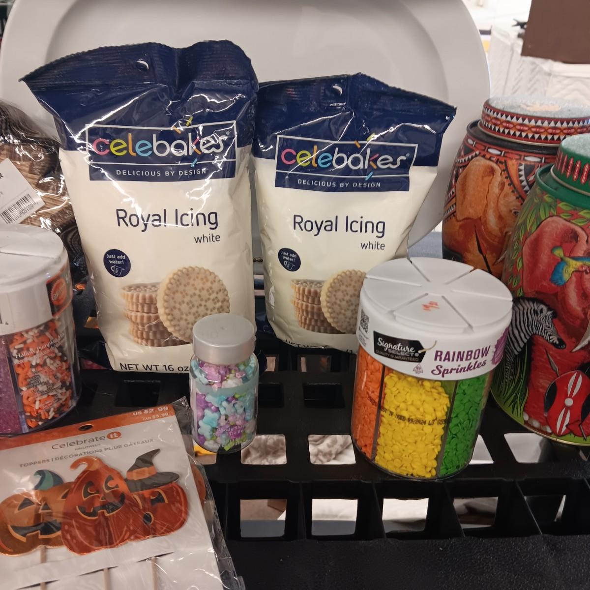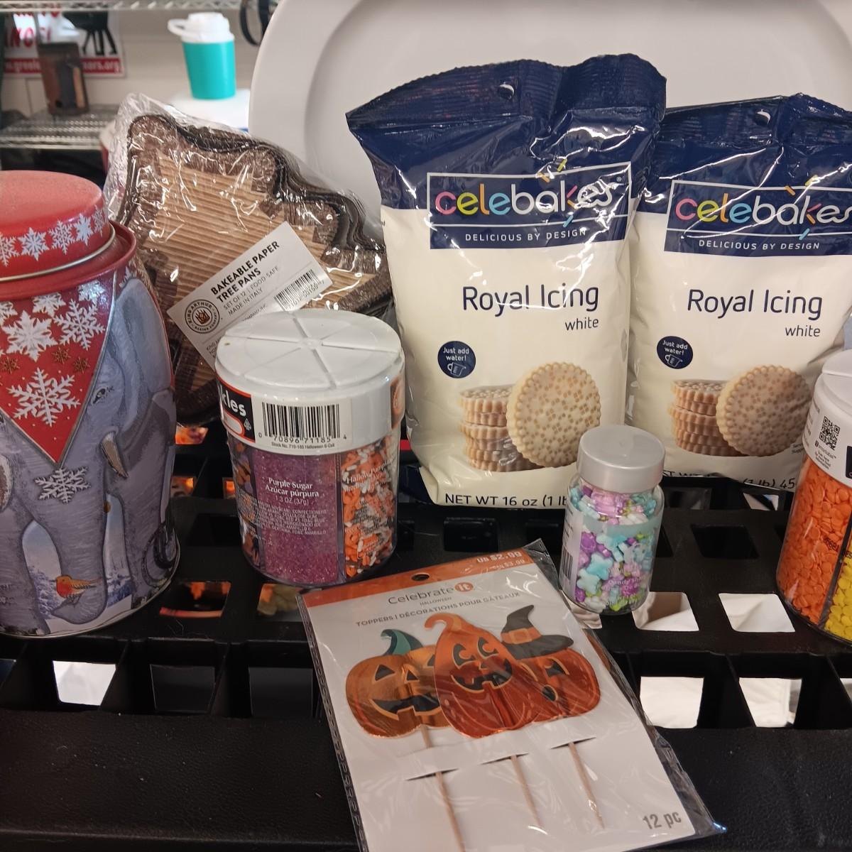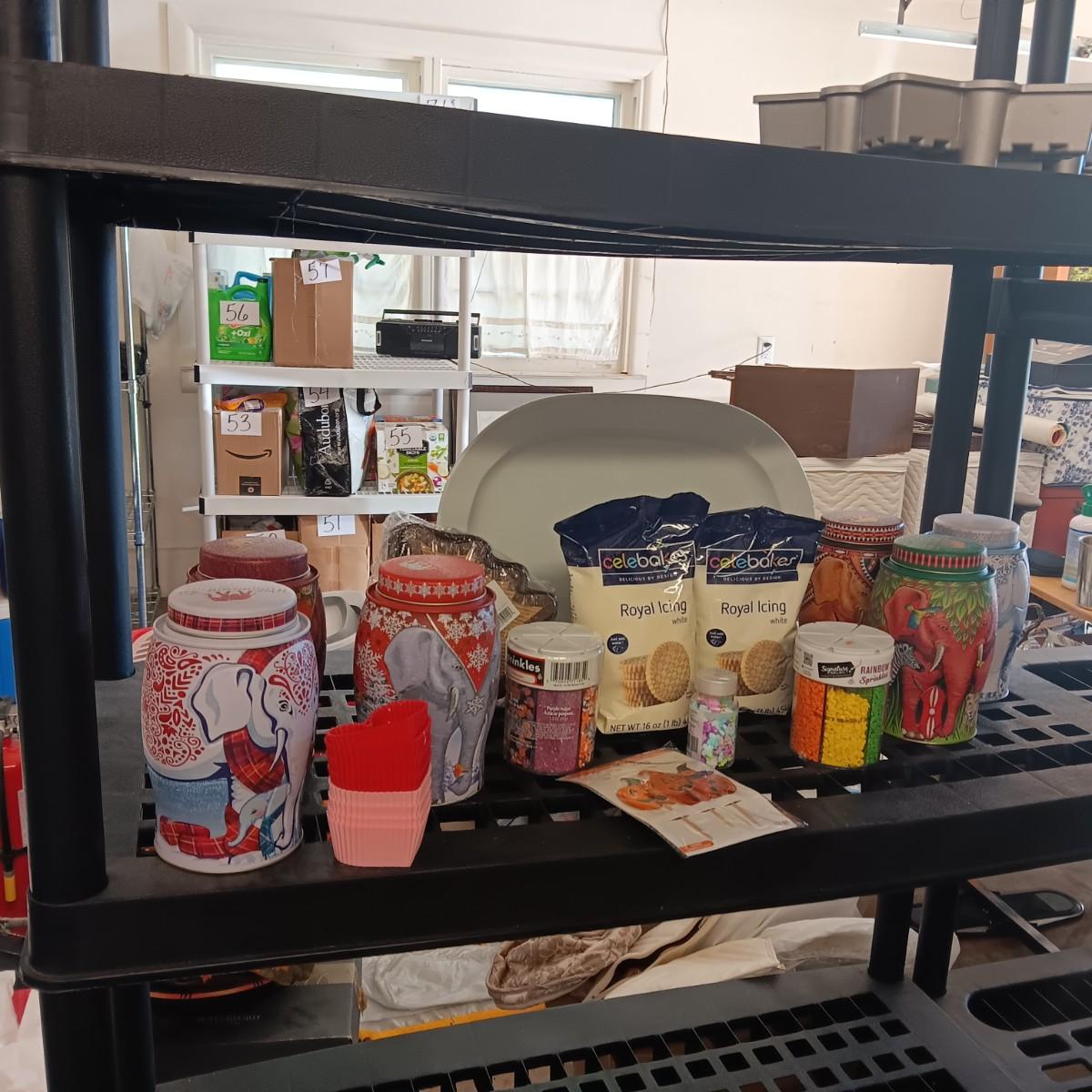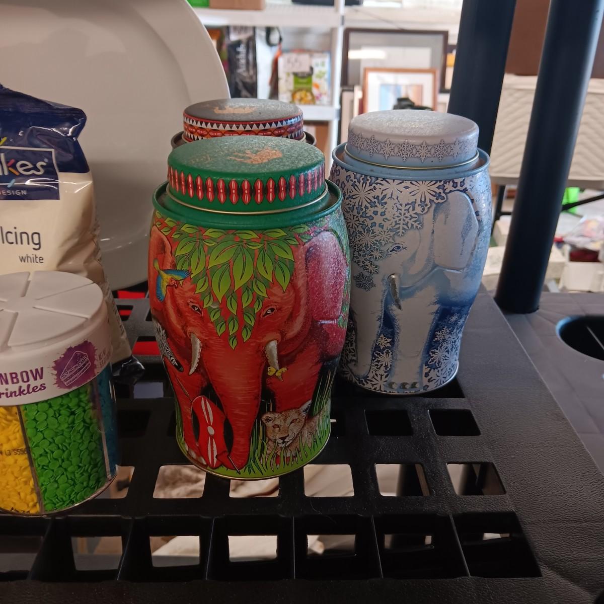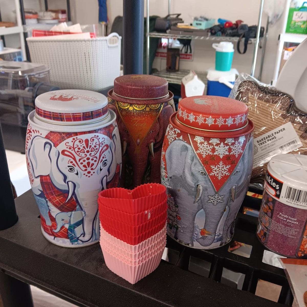 COOKIES AND CUPCAKE BAKING AND DECORATING ITEMS PLUS EMPTY ELEPHANT TINS