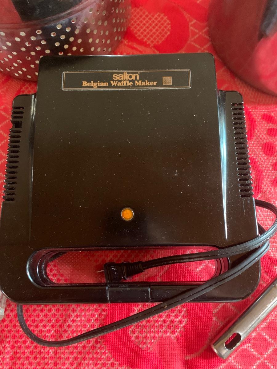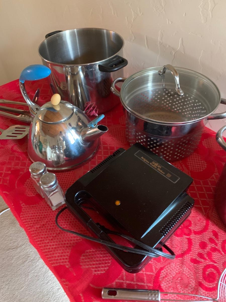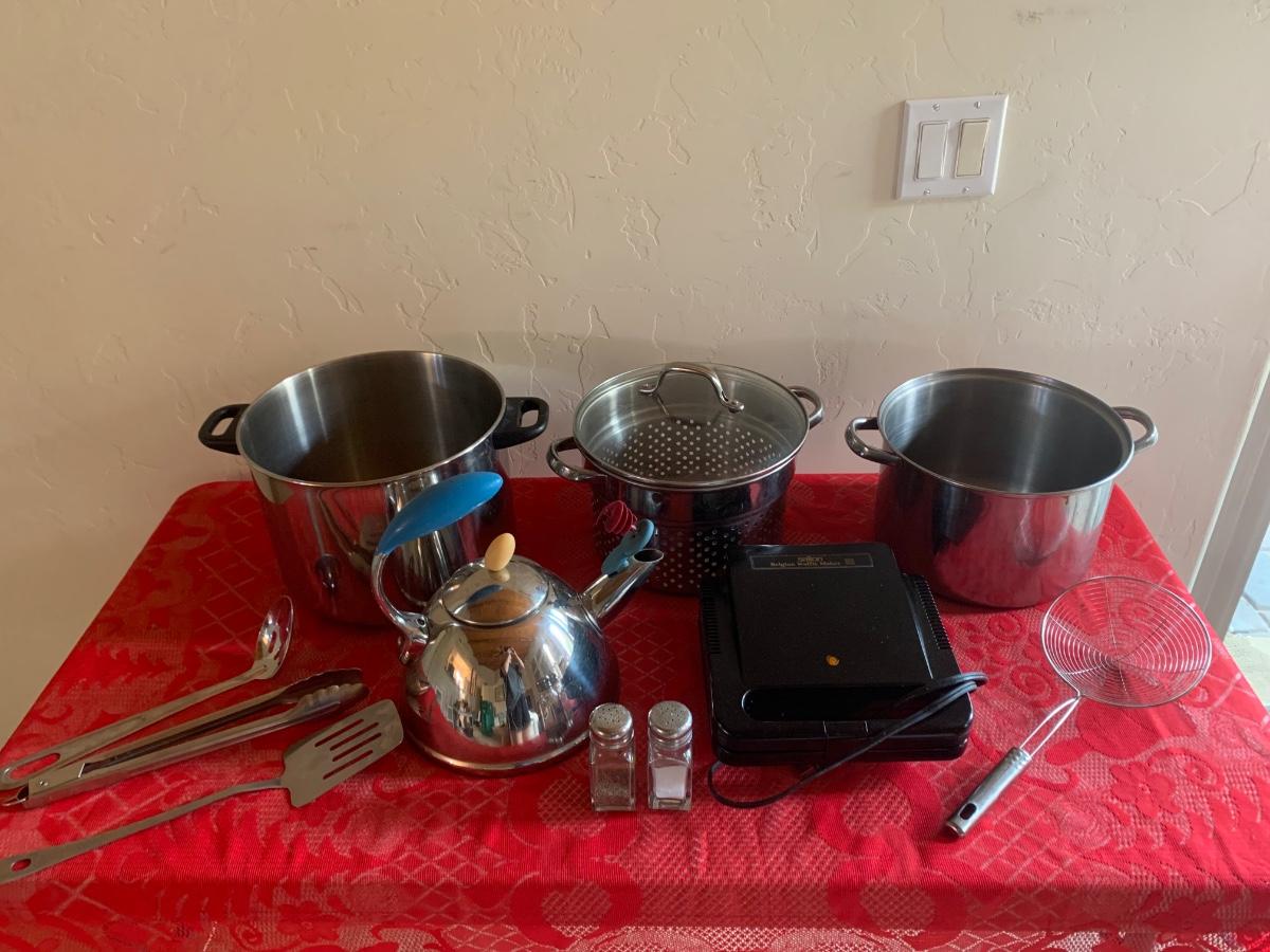 Cooking accessories including two large pots, cooking utensils, kettle, waffle maker, salt and pepper shakers and a steamer insert. All in good condition