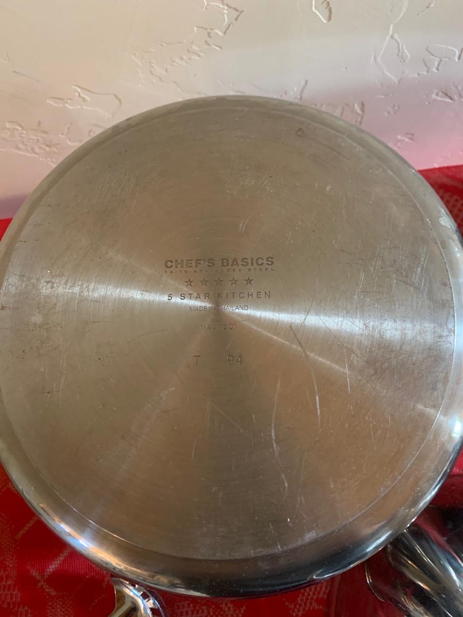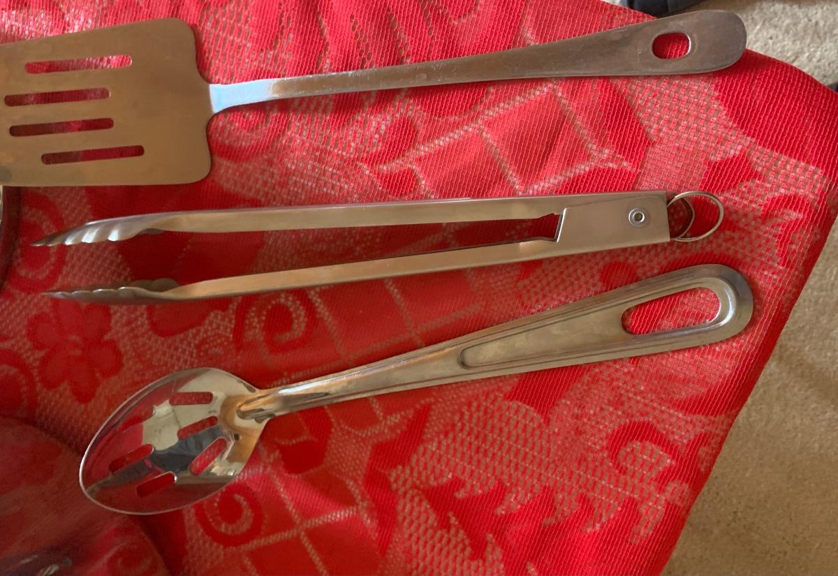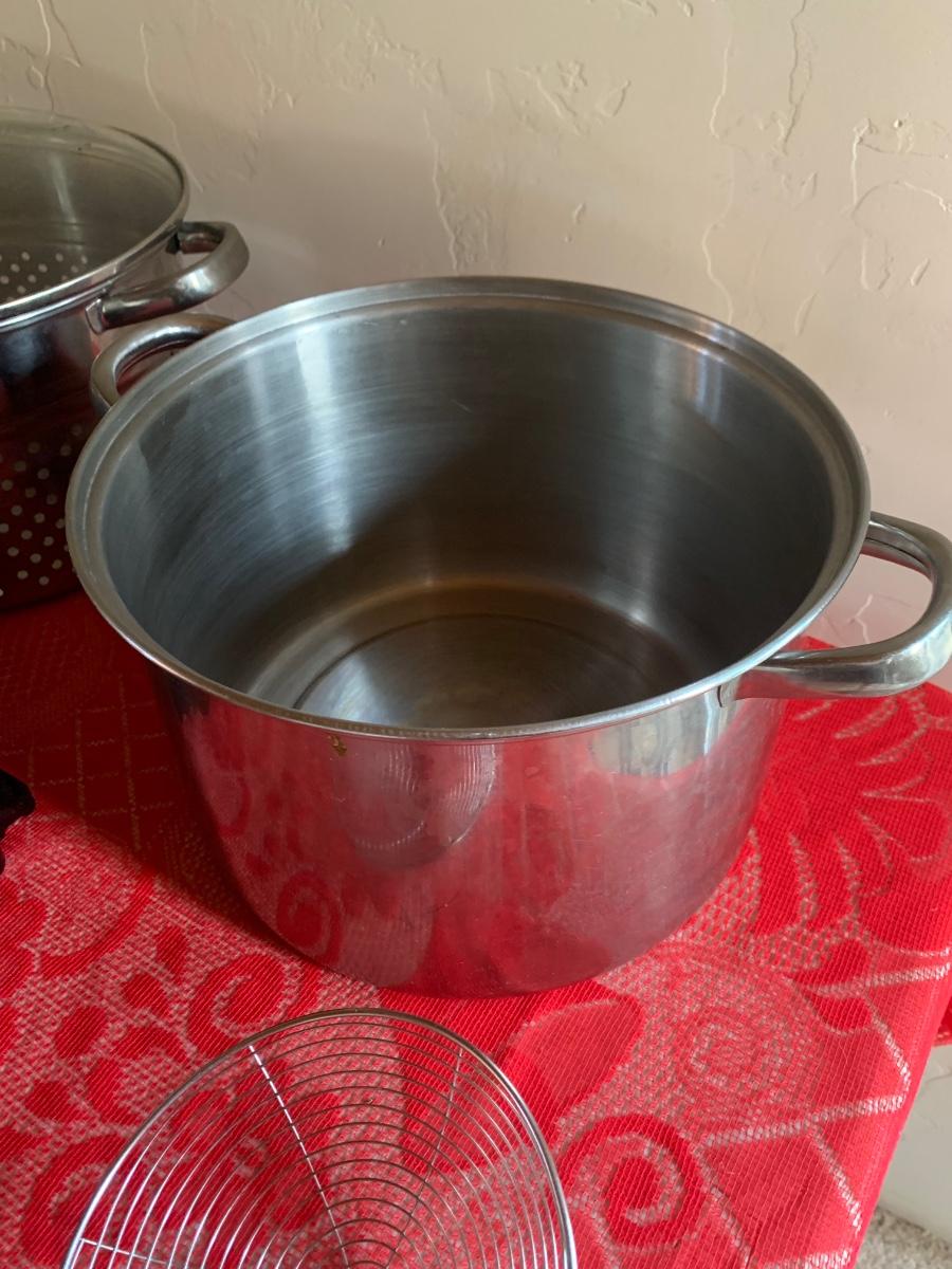 Cooking accessories including two large pots, cooking utensils, kettle, waffle maker, salt and pepper shakers and a steamer insert. All in good condition