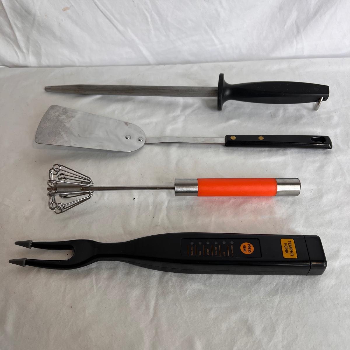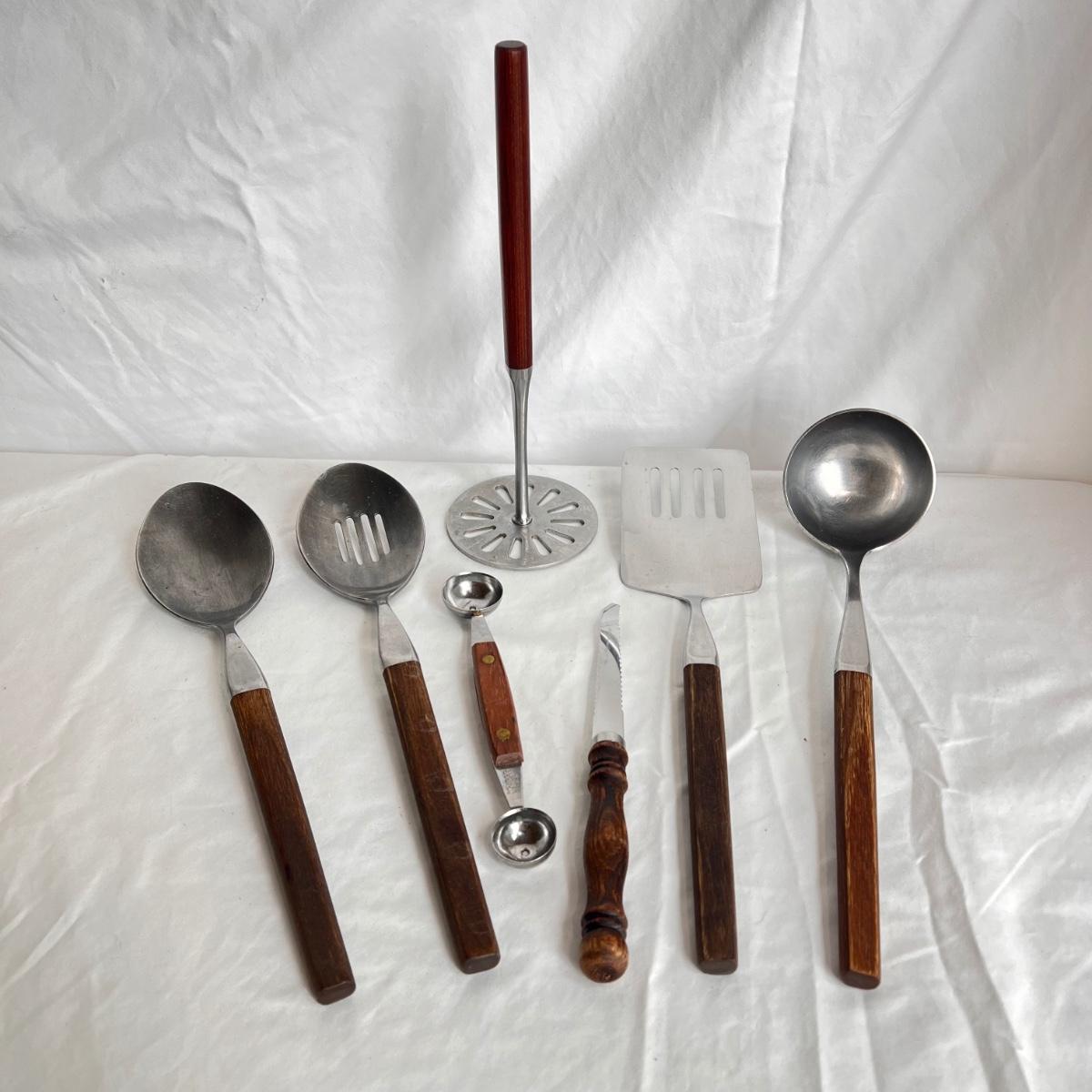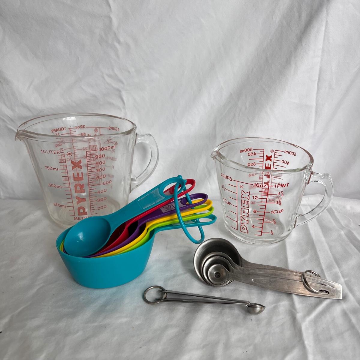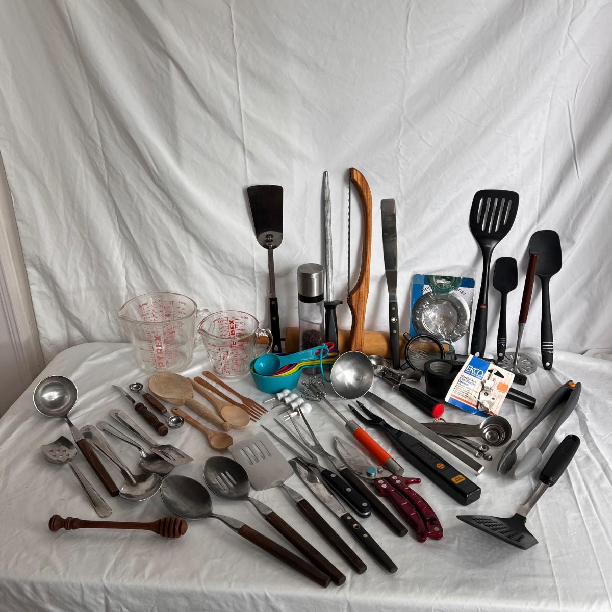 This lot includes two glass Pyrex measuring cups, plastic measuring spoons, metal measuring spoons, wooden utensils, wooden rolling pin, Rowoco and Fiesta stainless steel utensils, Goodcook plastic spatulas, one mesh sink strainer, stainles steel salt and pepper grinder, one Ekco can-bottle opener, one pair of kitchen shears, one Temper Fork, and several other items pictured. The rolling pin measures 17” x 2”H. Shipping available.