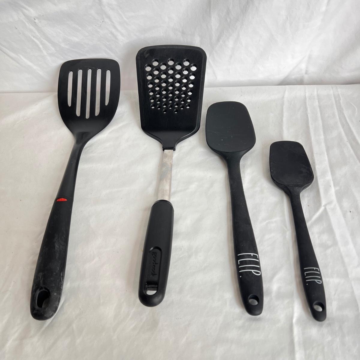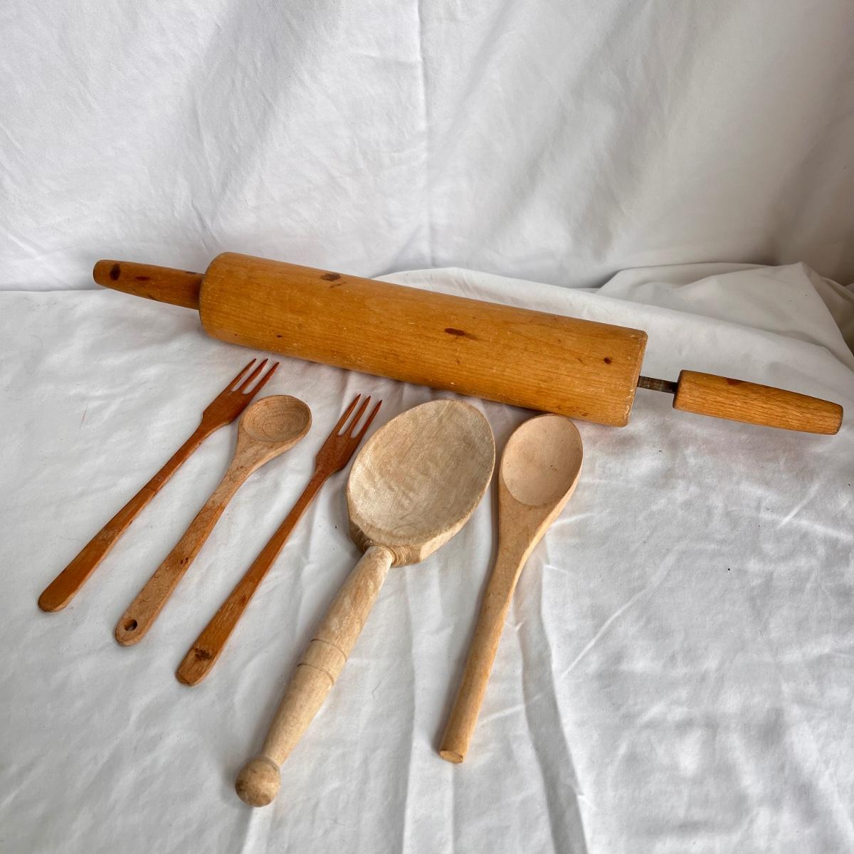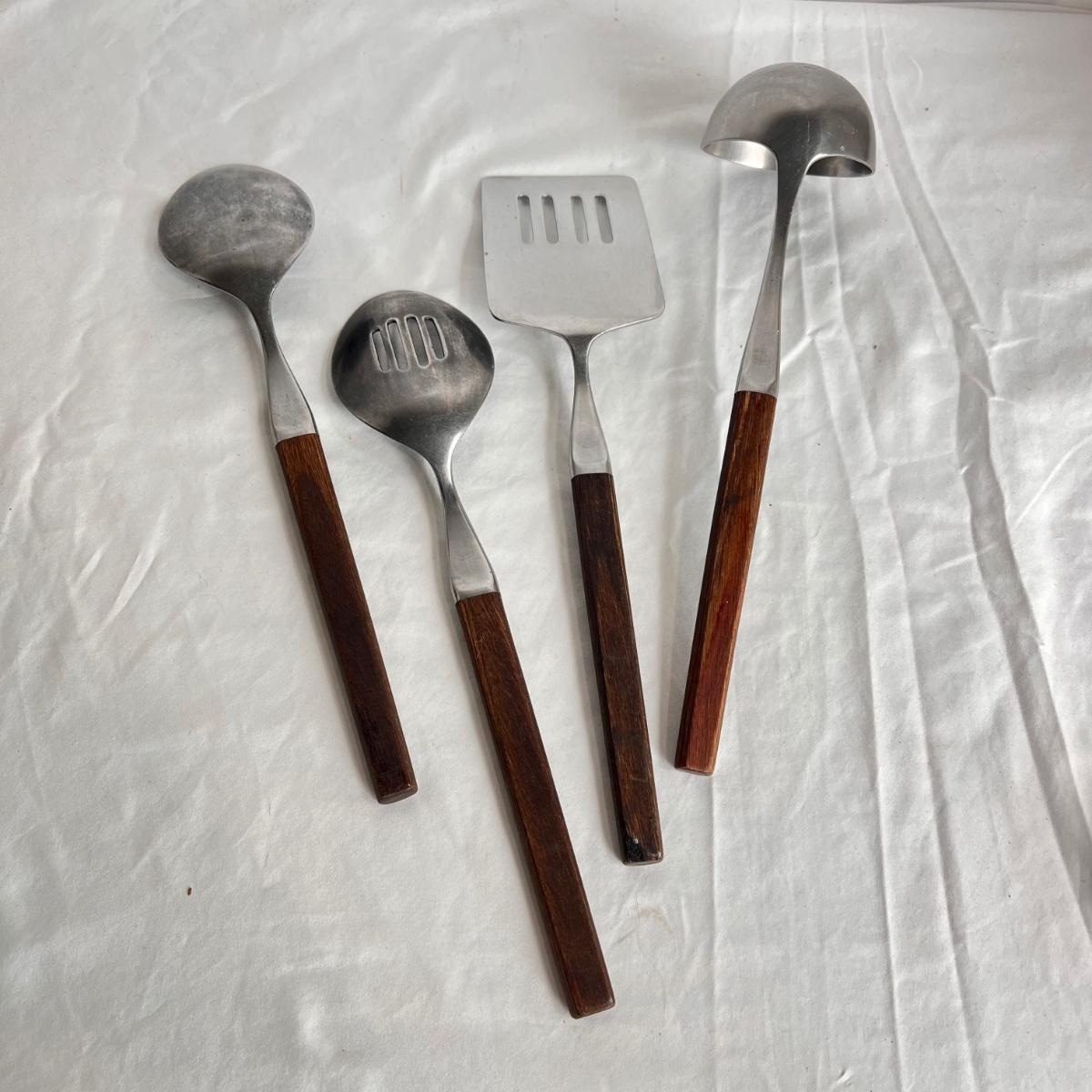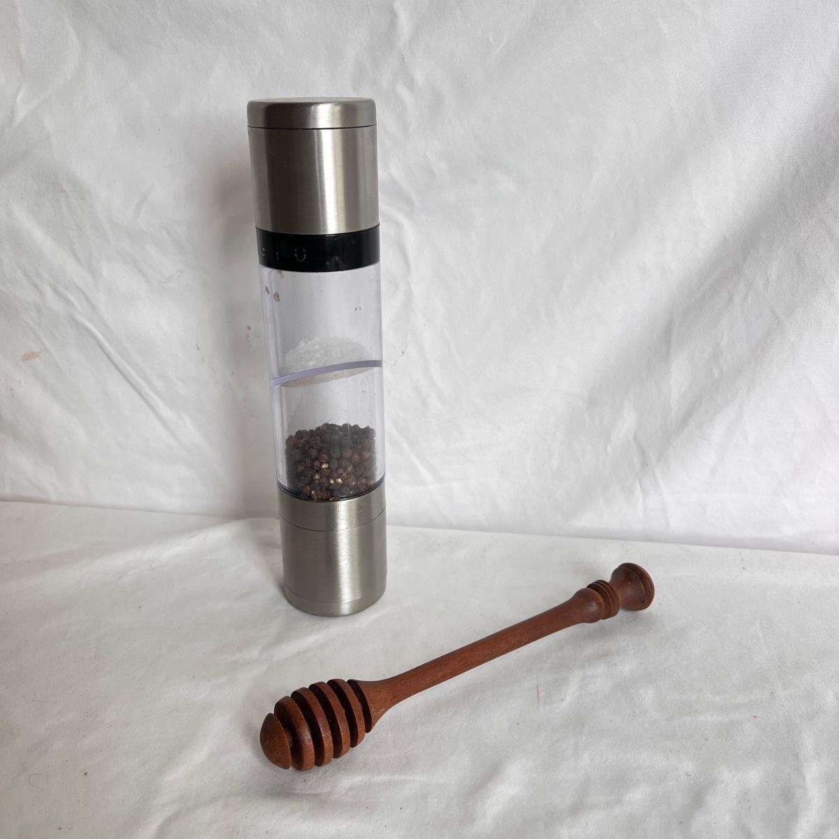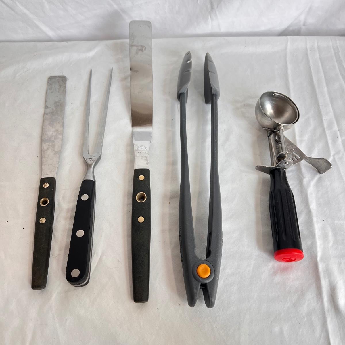 This lot includes two glass Pyrex measuring cups, plastic measuring spoons, metal measuring spoons, wooden utensils, wooden rolling pin, Rowoco and Fiesta stainless steel utensils, Goodcook plastic spatulas, one mesh sink strainer, stainles steel salt and pepper grinder, one Ekco can-bottle opener, one pair of kitchen shears, one Temper Fork, and several other items pictured. The rolling pin measures 17” x 2”H. Shipping available.