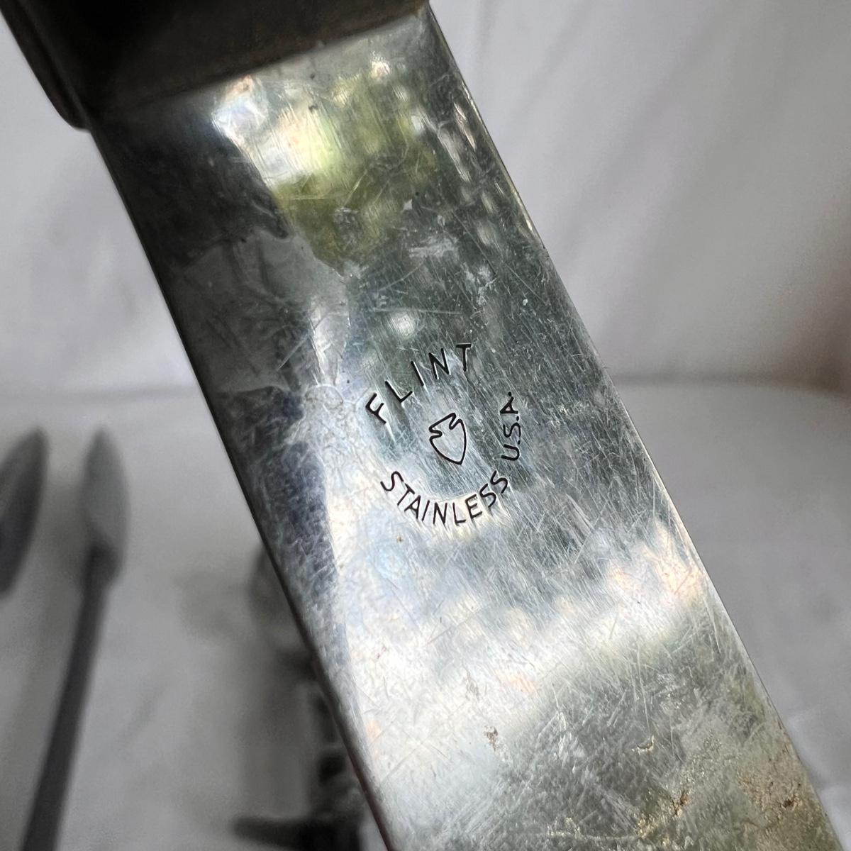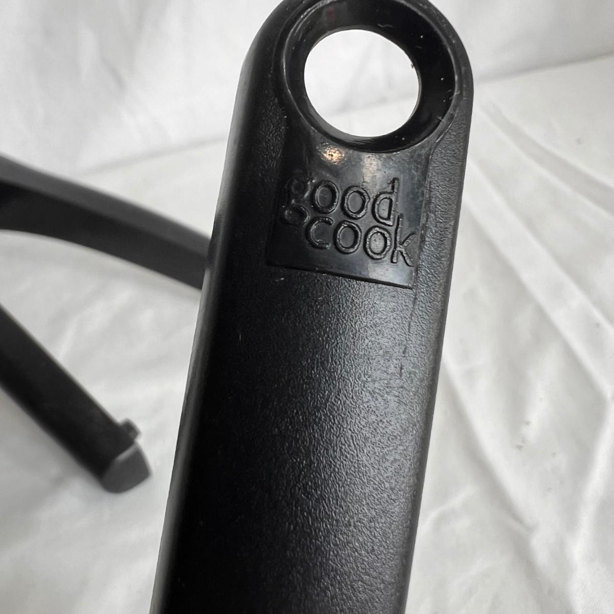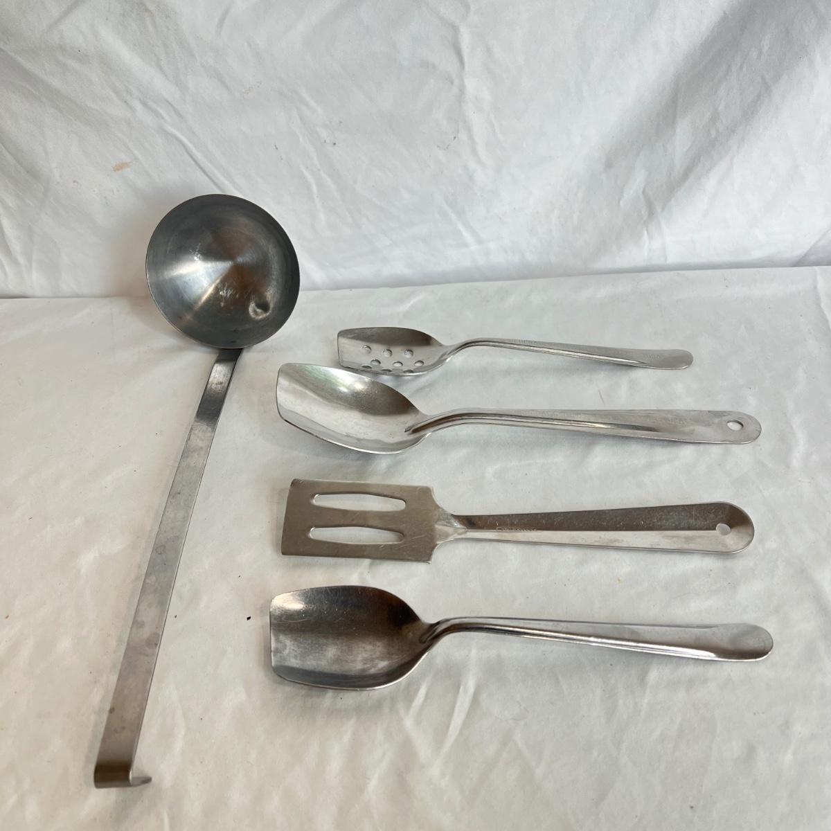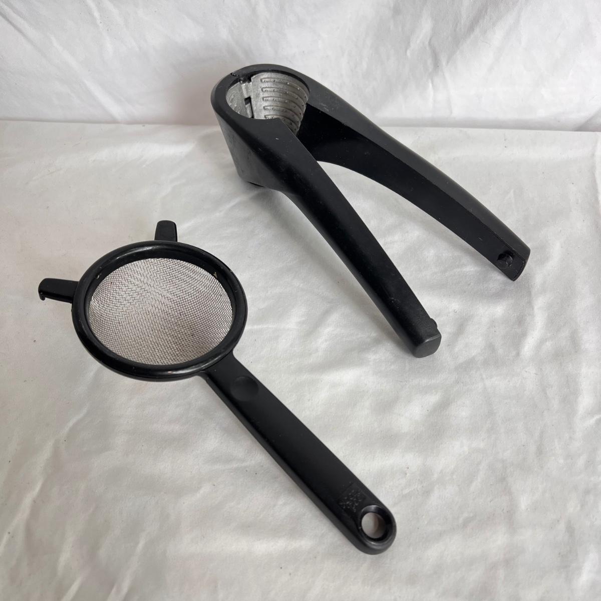 This lot includes two glass Pyrex measuring cups, plastic measuring spoons, metal measuring spoons, wooden utensils, wooden rolling pin, Rowoco and Fiesta stainless steel utensils, Goodcook plastic spatulas, one mesh sink strainer, stainles steel salt and pepper grinder, one Ekco can-bottle opener, one pair of kitchen shears, one Temper Fork, and several other items pictured. The rolling pin measures 17” x 2”H. Shipping available.