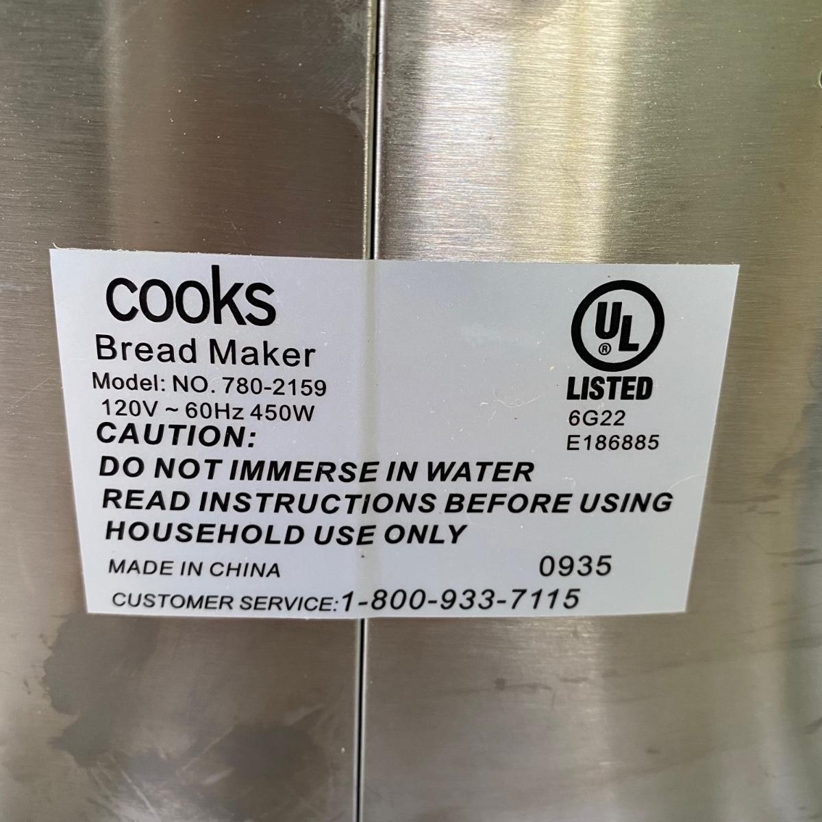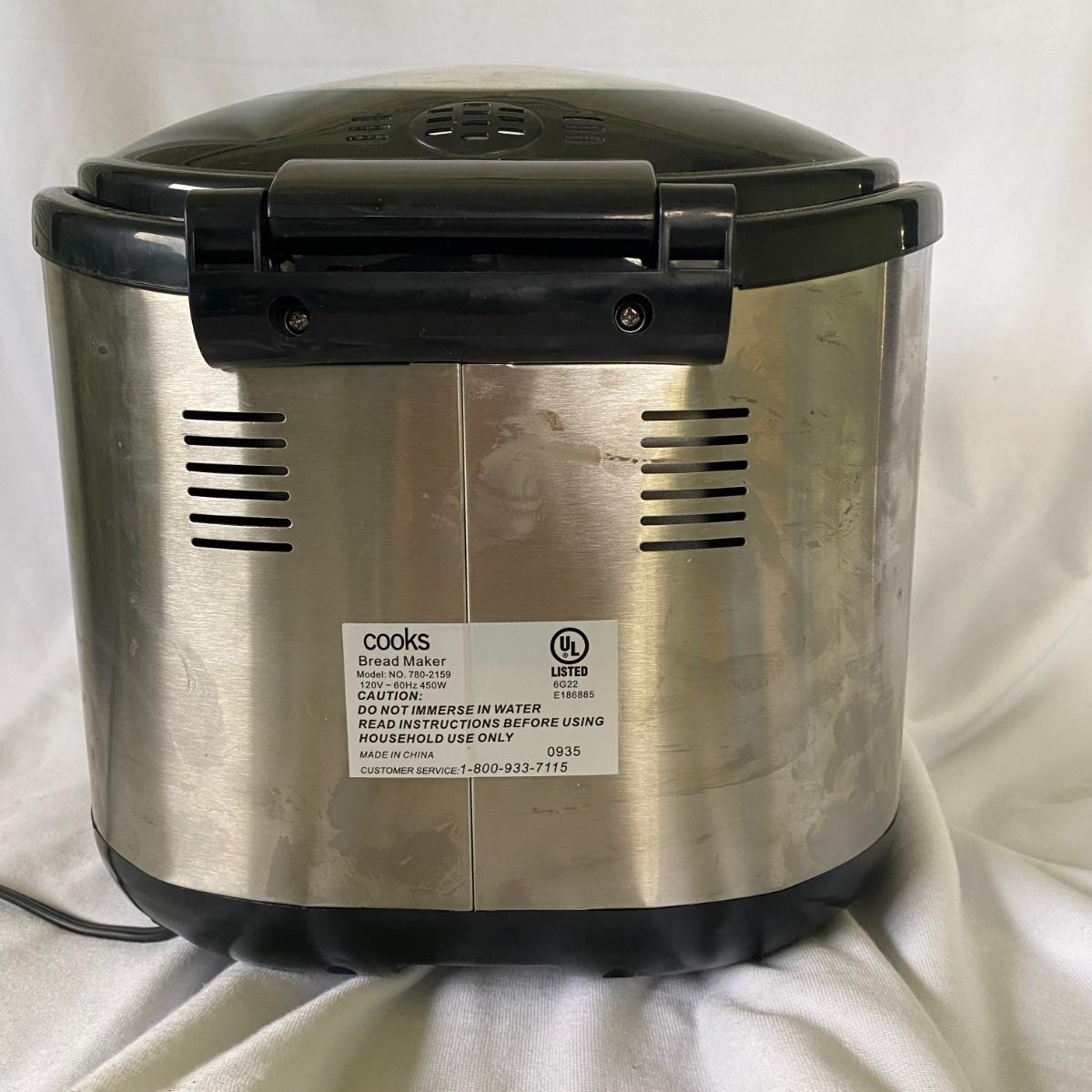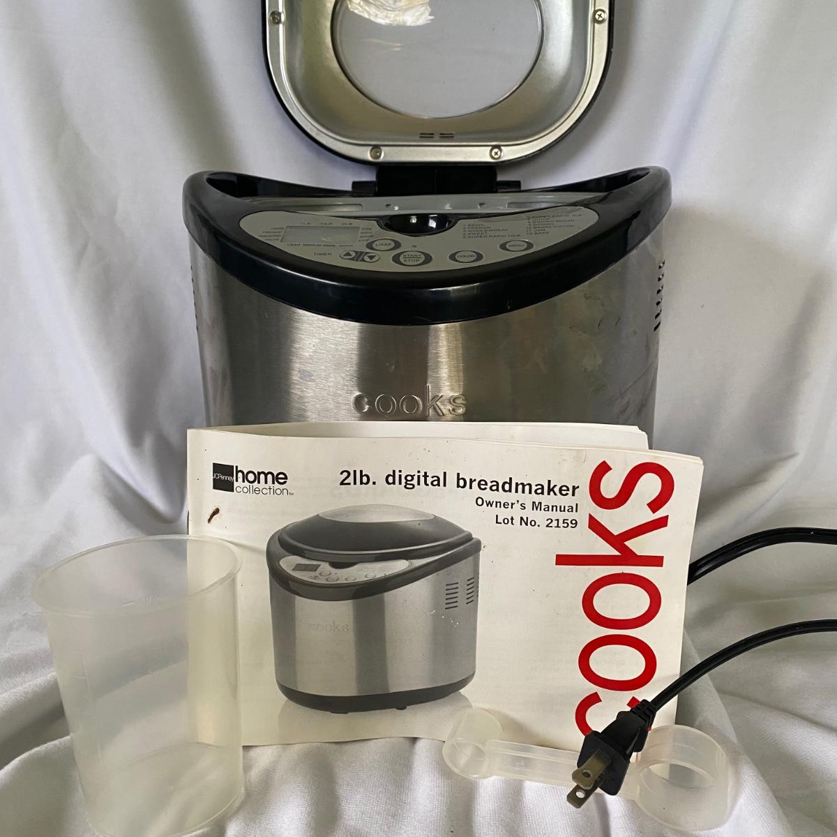 One Cooks Breadmaker, includes two types of measuring cups, and the owners manual. In great working condition, hardly needs cleaned and one Pretso Bread Slicing Guide.