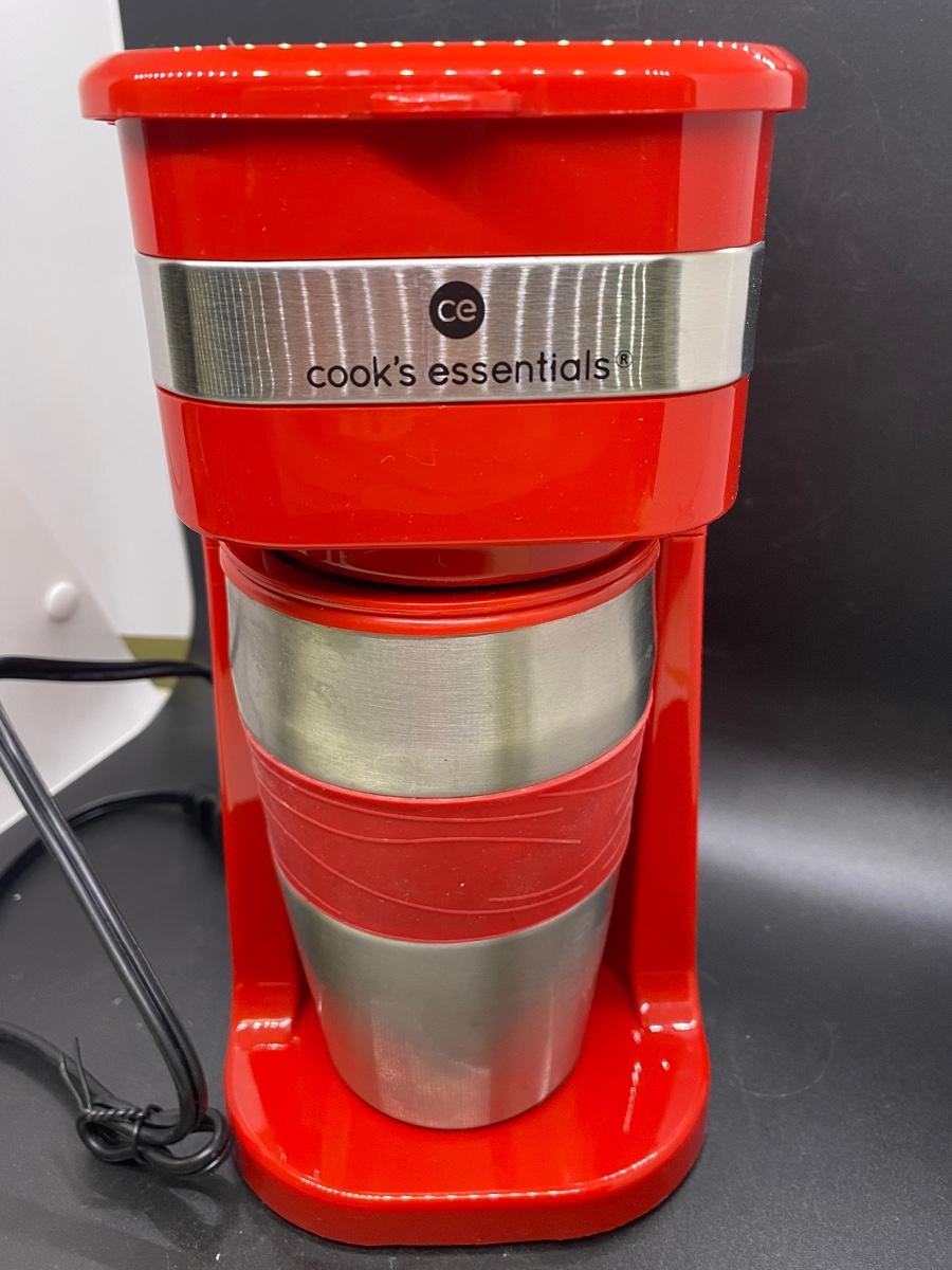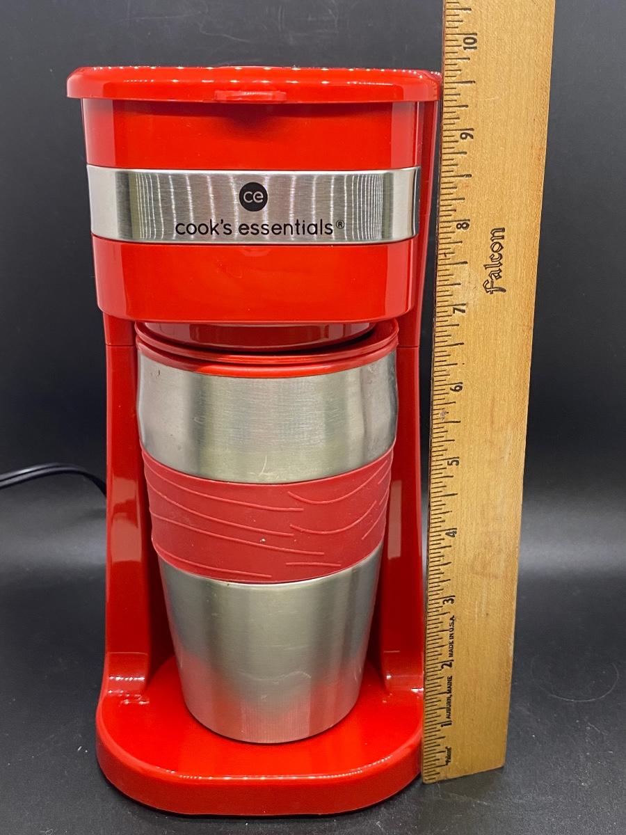 Cook's Essentials Single-Serve Coffee Maker with Tumbler, there is no significant damage to the coffee maker and is in good condition. Has not been tested, check pictures for more details and for sizing.