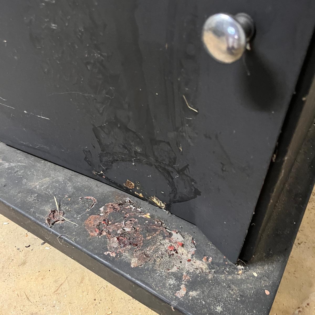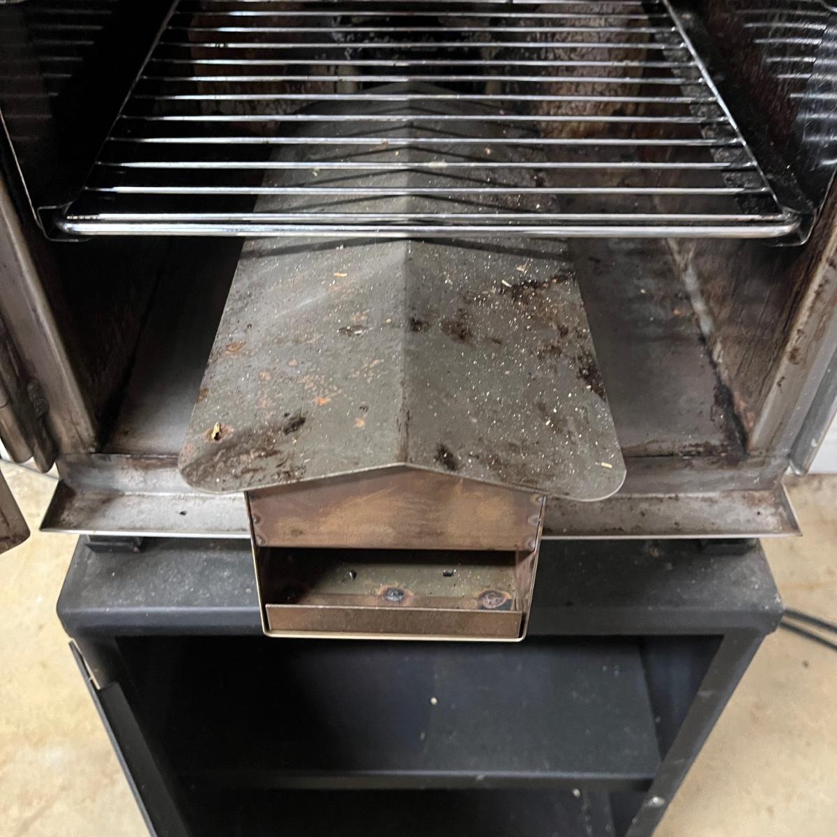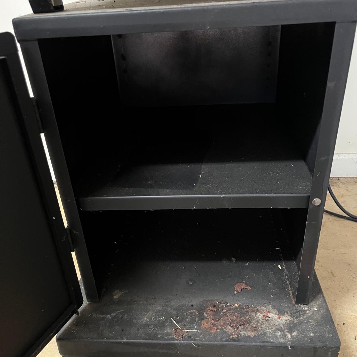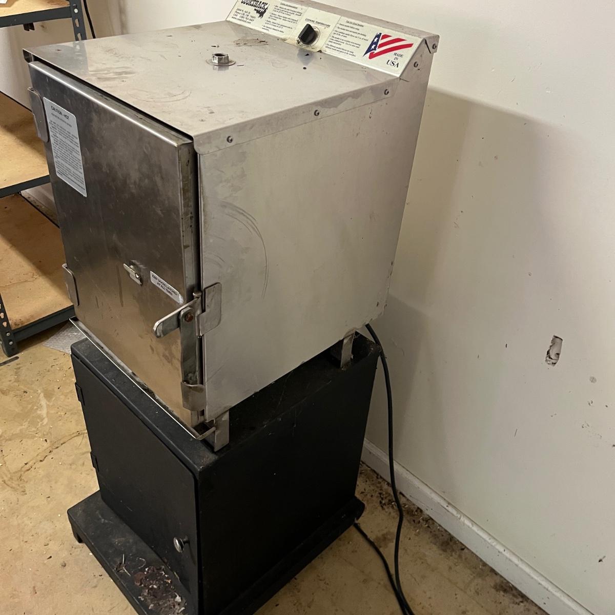 Lot includes an electric Cookshack smoker with stand underneath. Smoker and stand measure 17” x 19” x 45”H. Item was not tested. Also includes book on Smoking meat and thermometer. Bottom of stand has dent in door, see pictures.