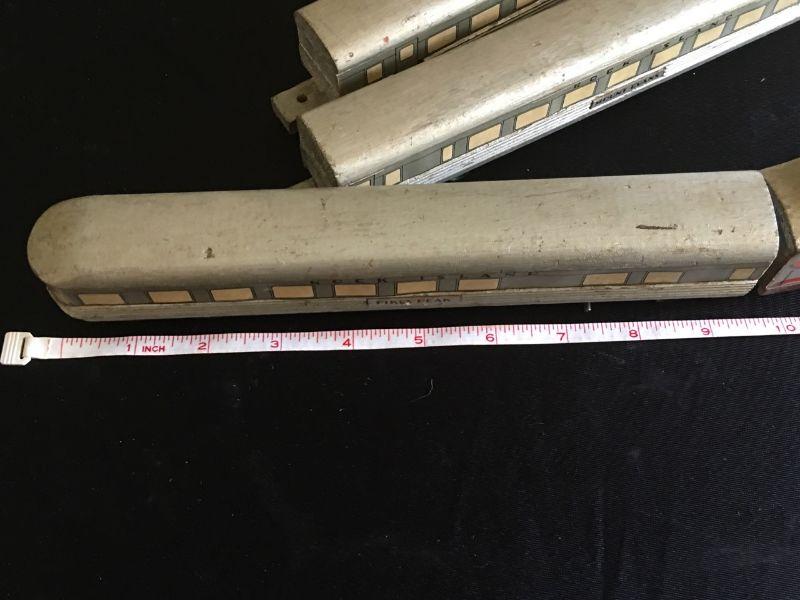 Rare wooden Rocket Train Art Deco style. Very cool! 4 pieces. Silver painted wooden train. Front engine train, 2 middle cars and the caboose. There are some wheels missing. See photos.