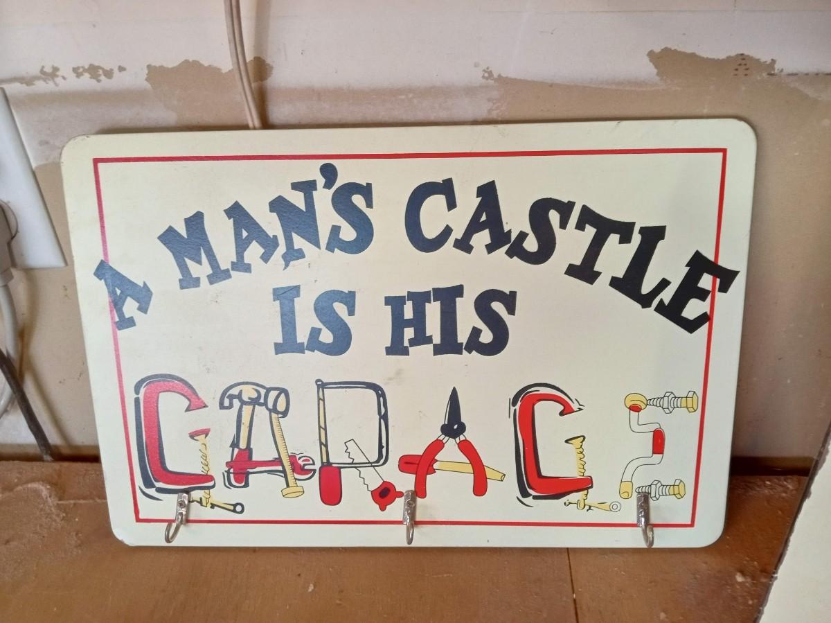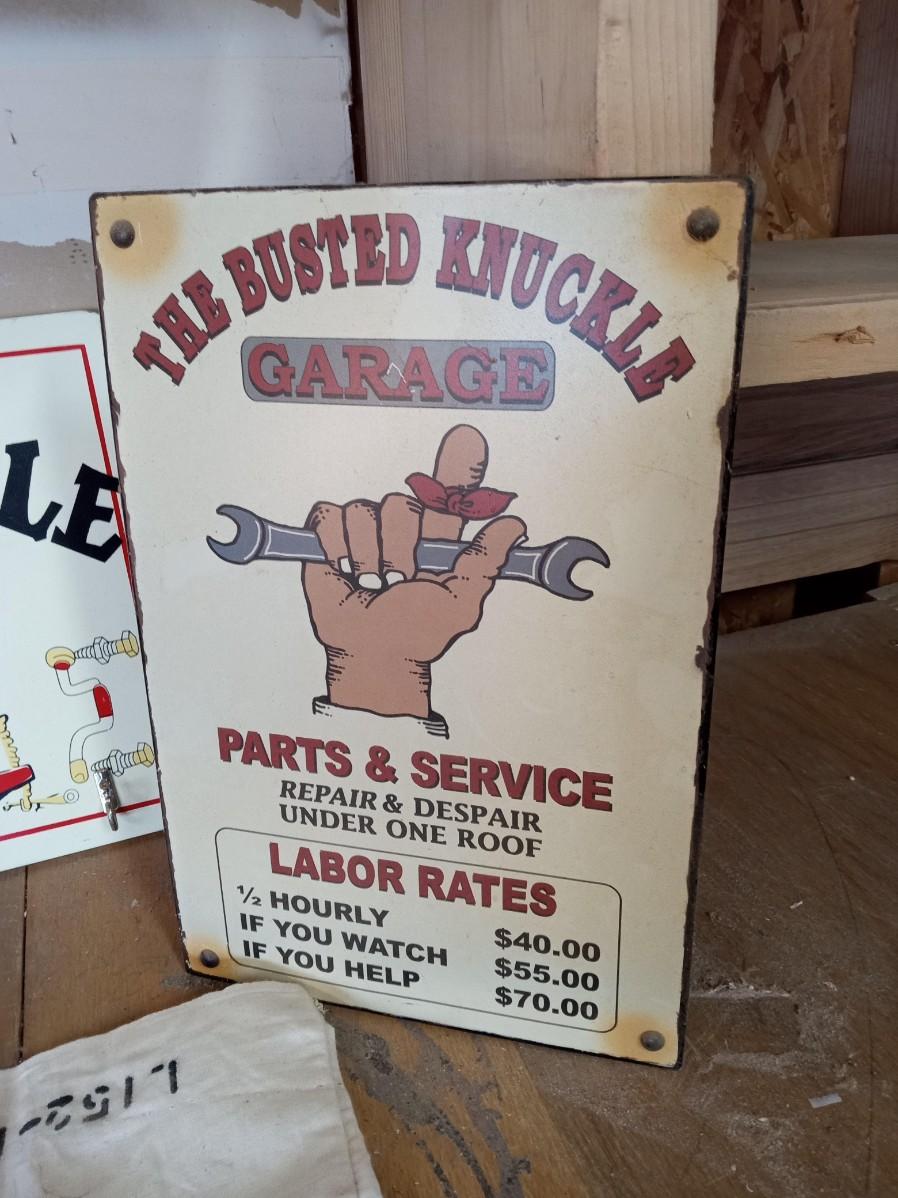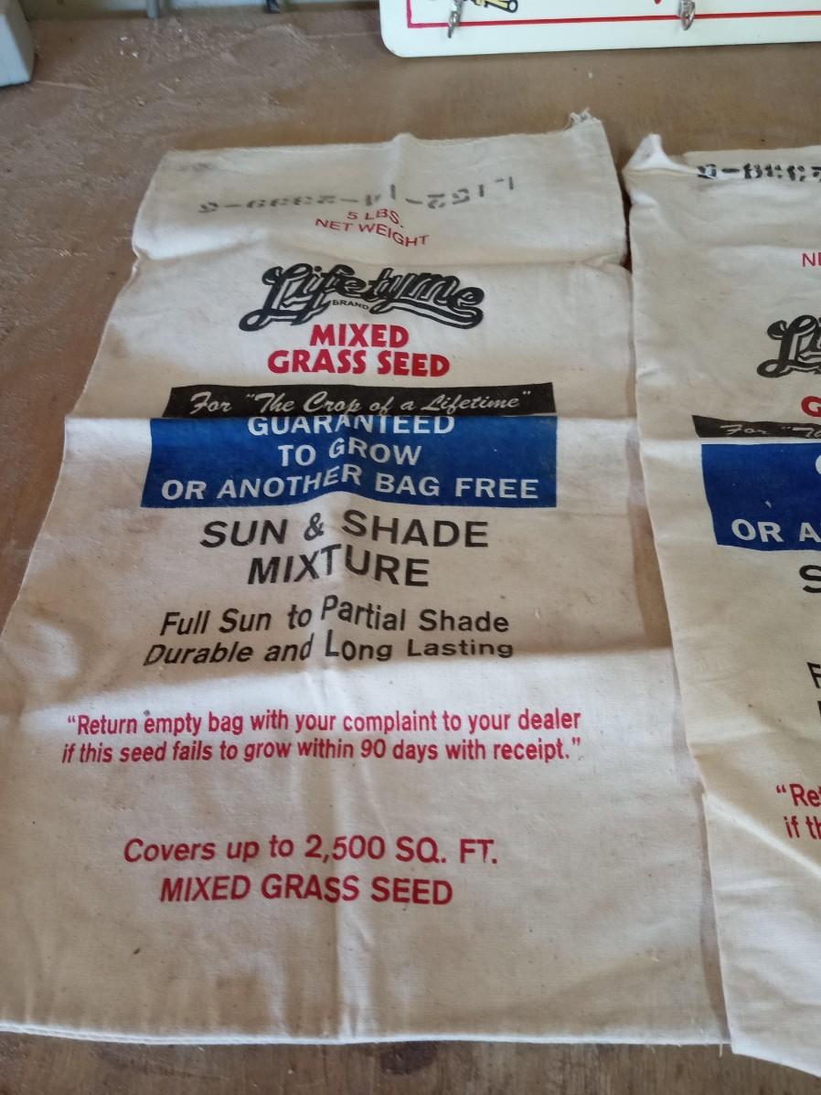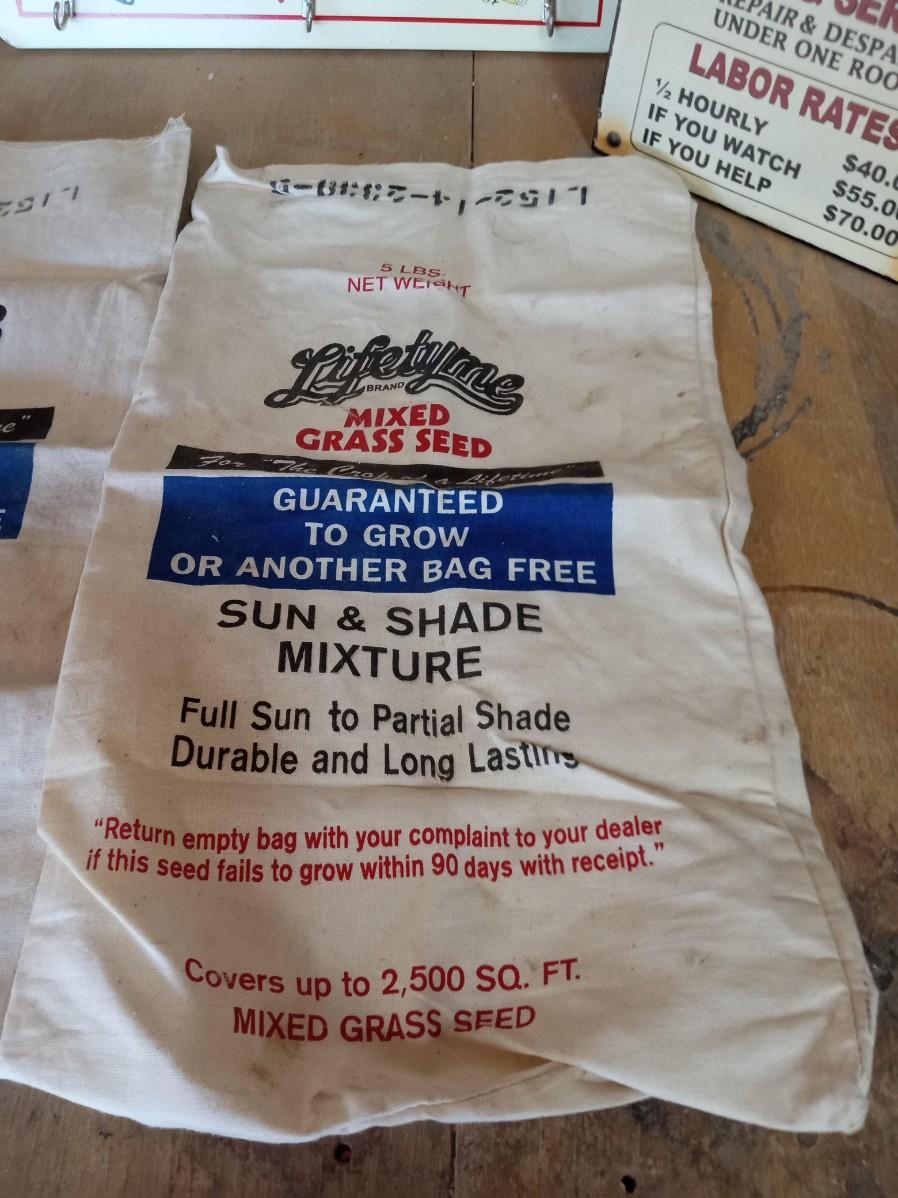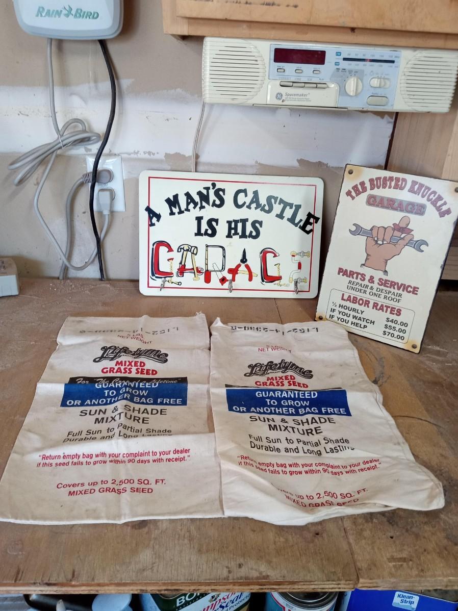 2 VERY COOL GARAGE SIGNS AND 2 EMPTY LIFETYME MIXED GRASS SEED SACKS.