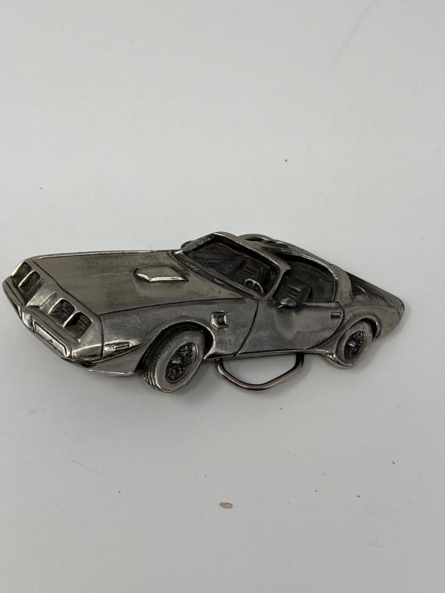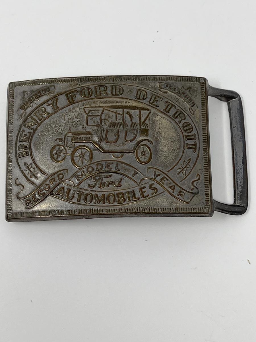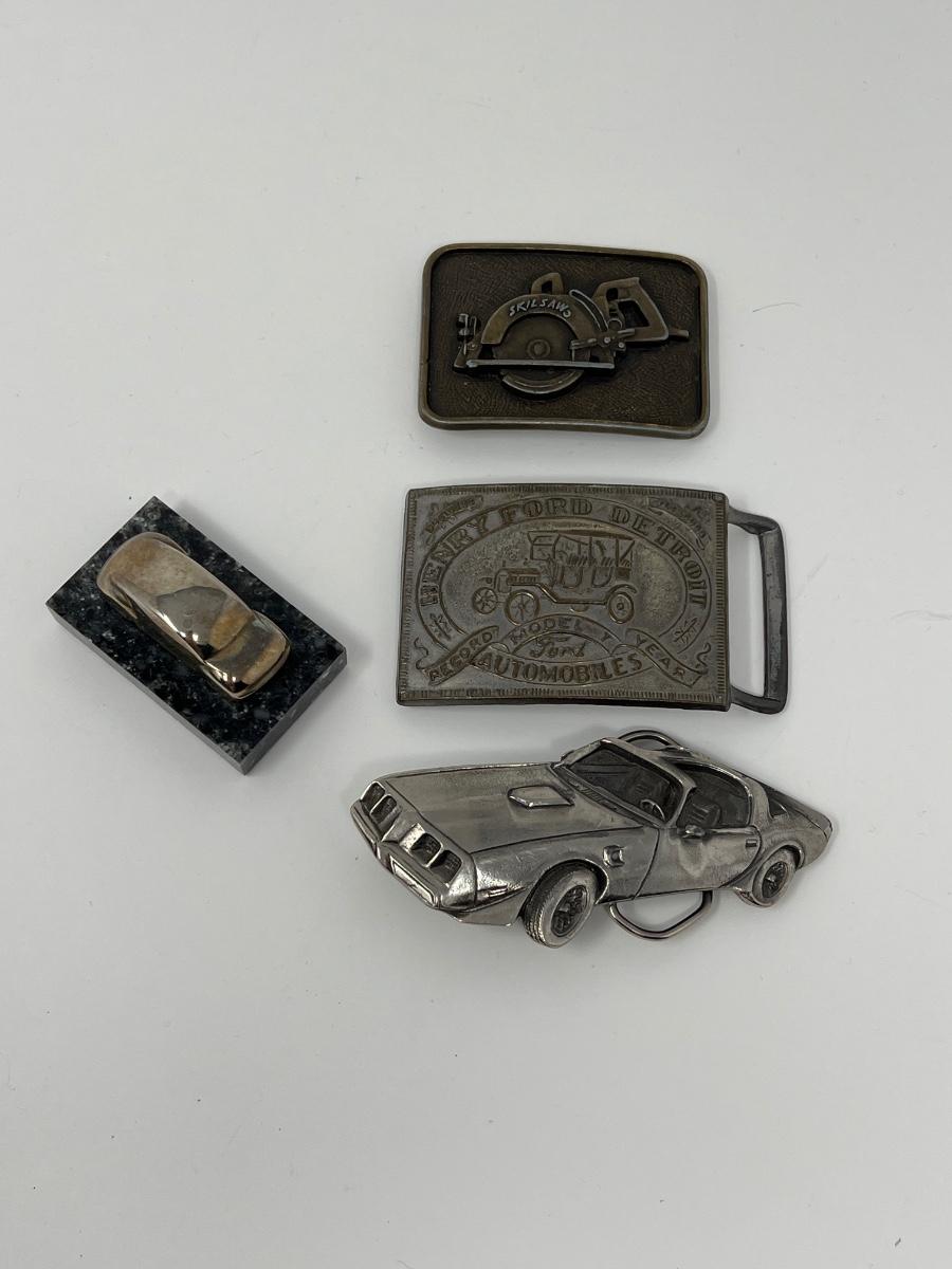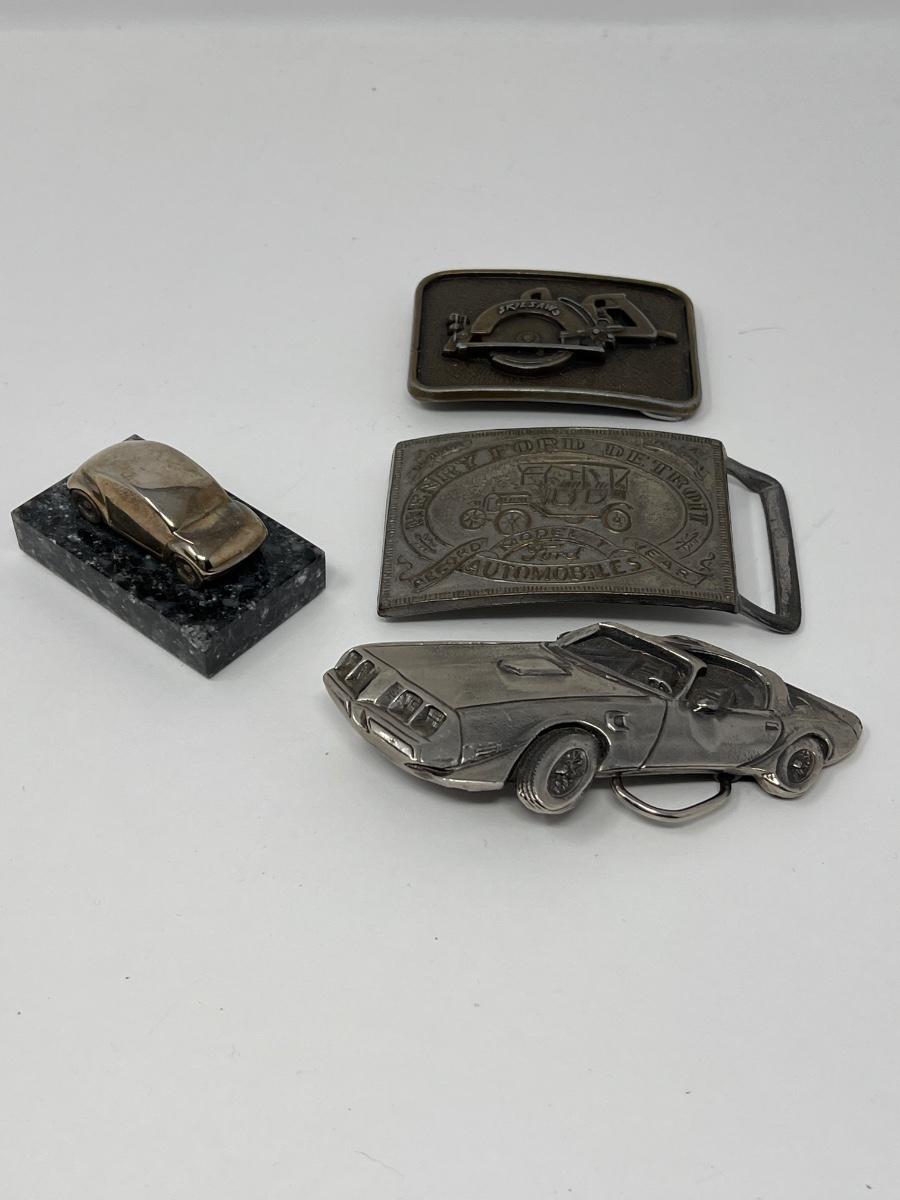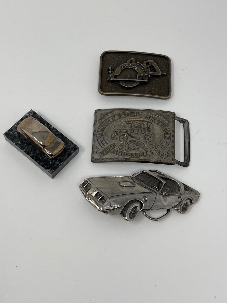 Three 4” long metal belt buckles - Skilsaw, Model T, race car and small silver plated 2” collectible car.