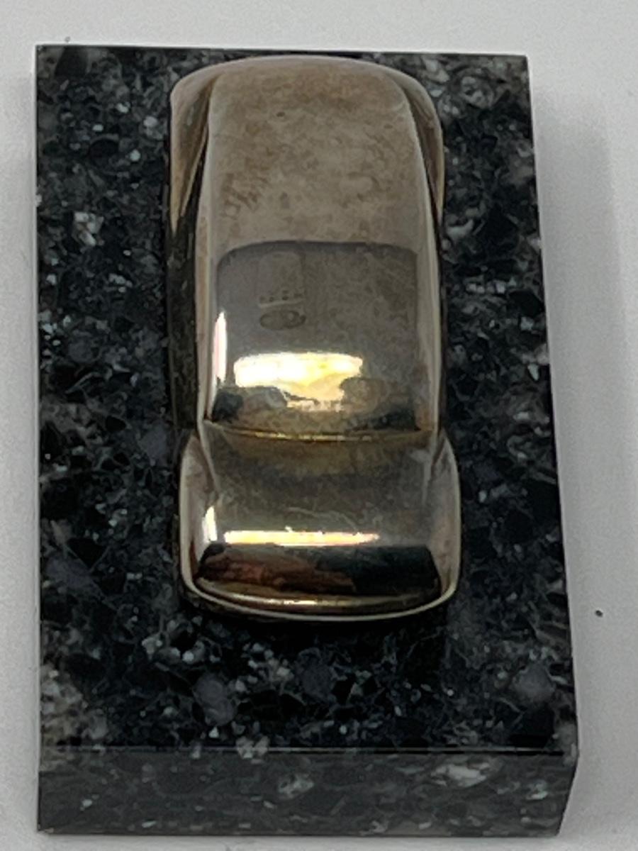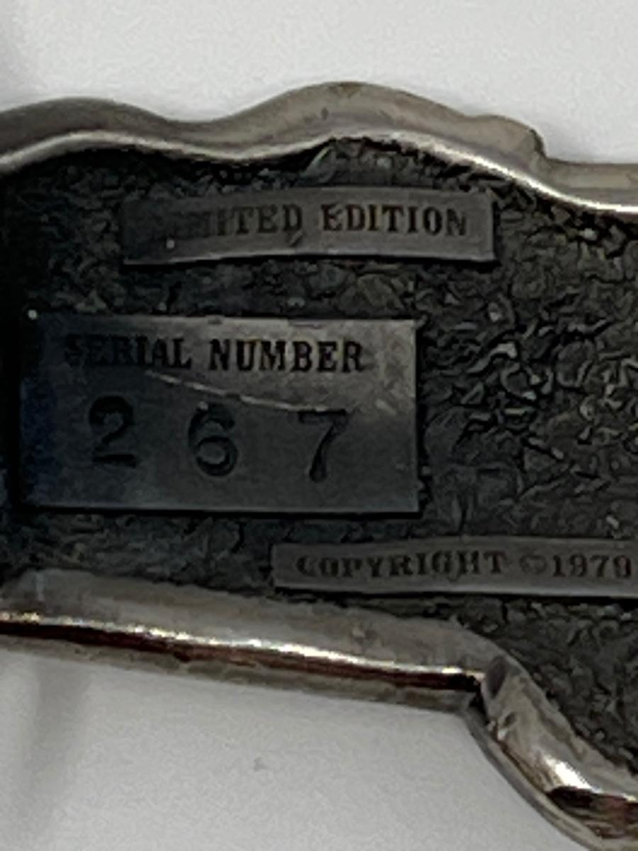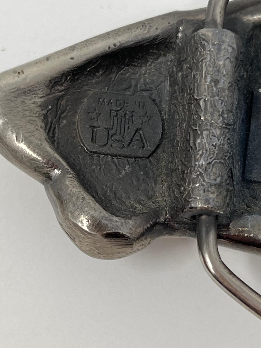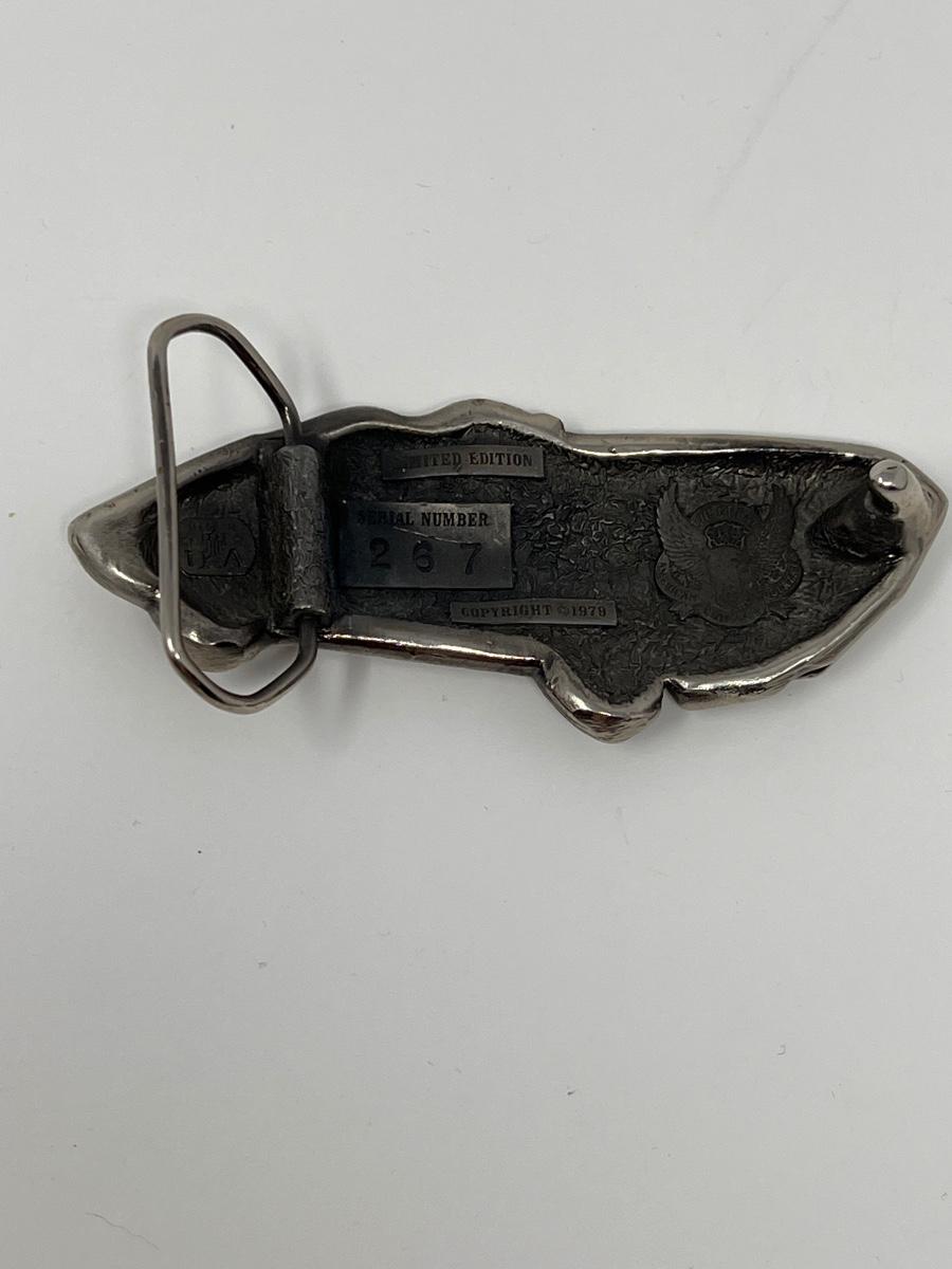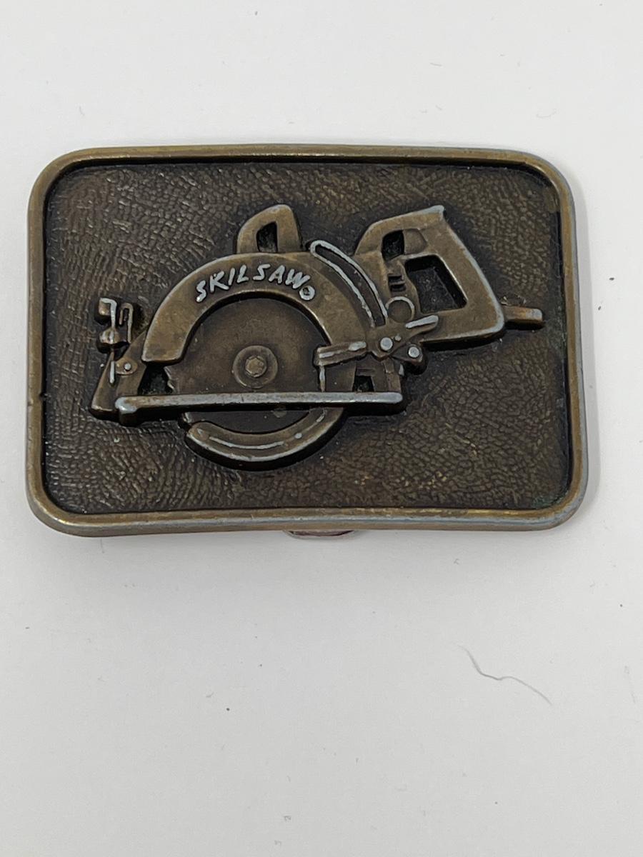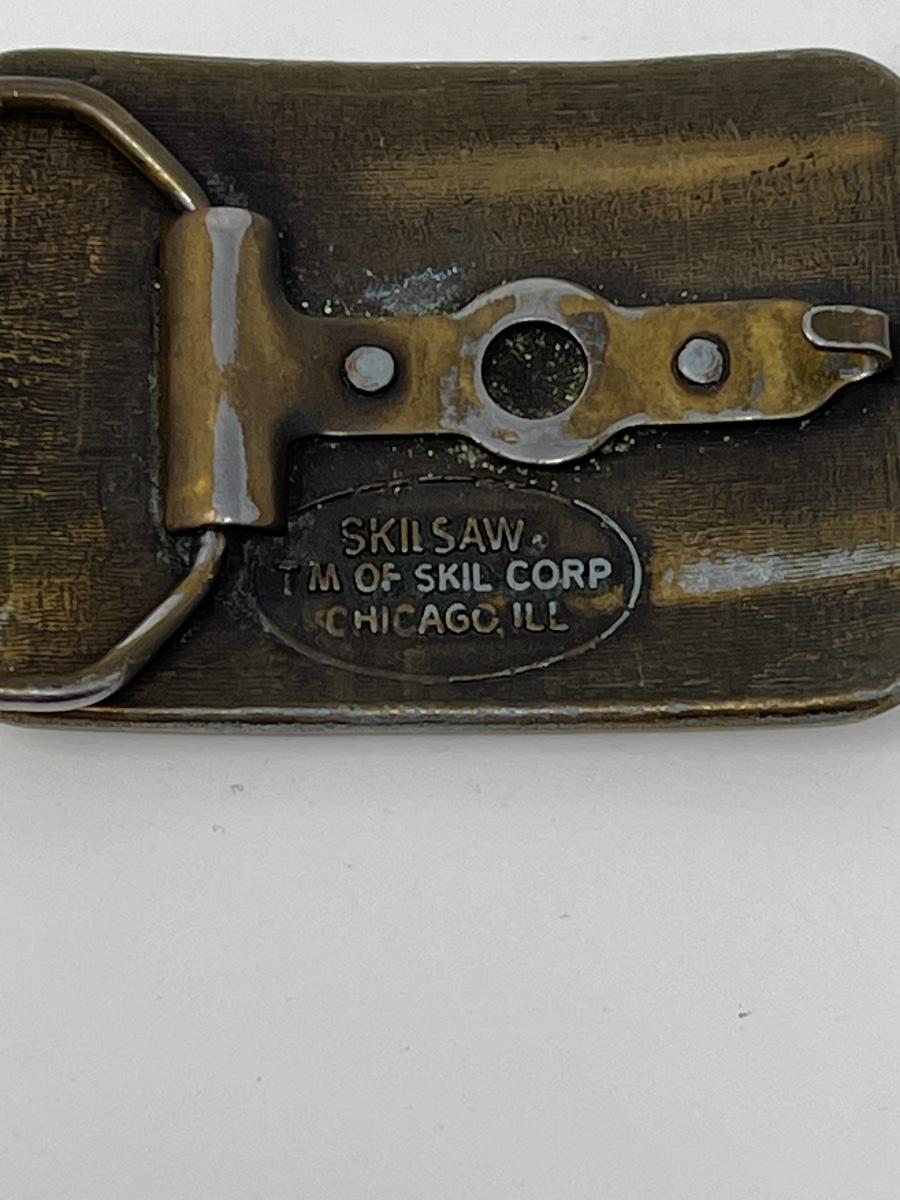 Three 4” long metal belt buckles - Skilsaw, Model T, race car and small silver plated 2” collectible car.