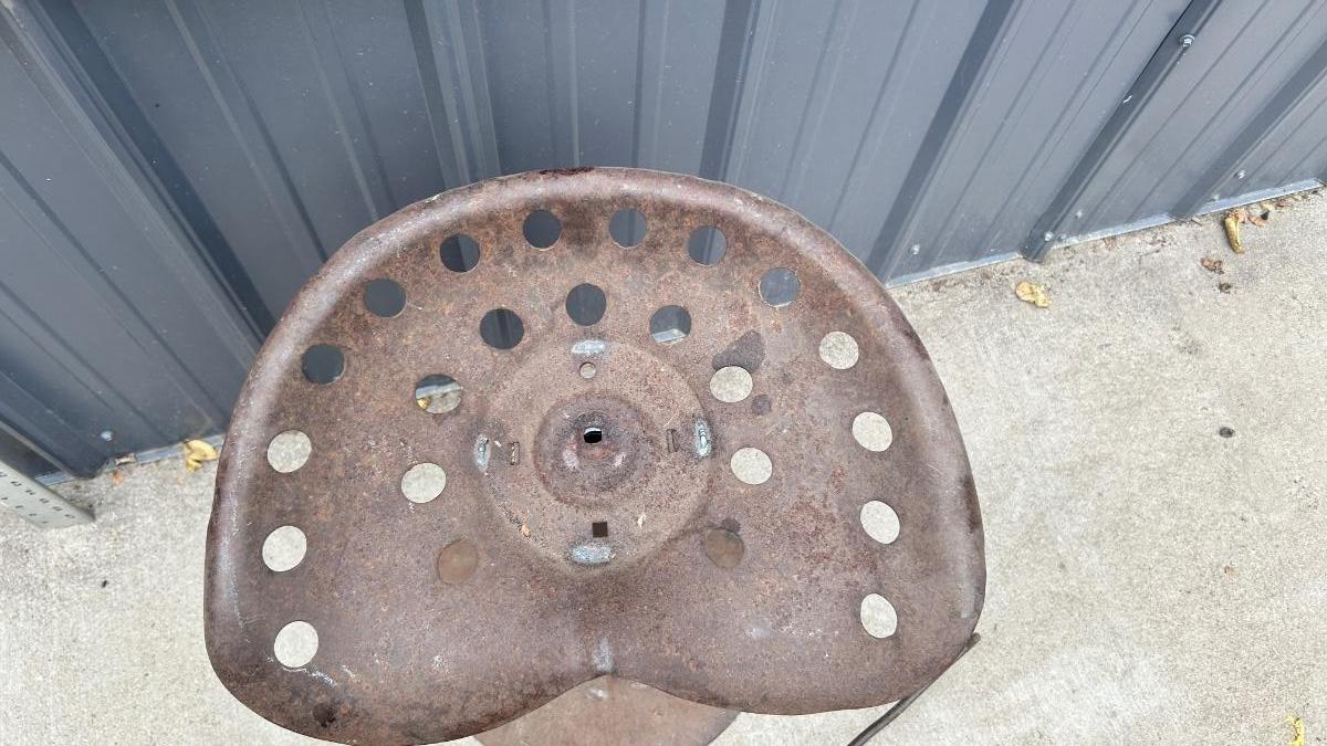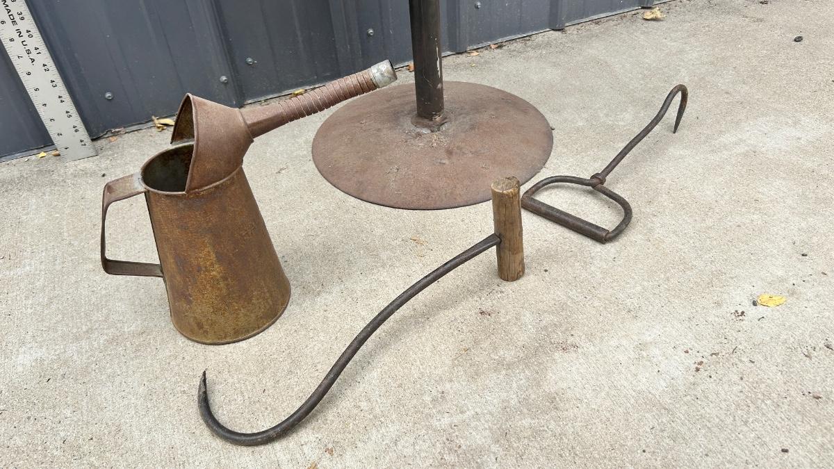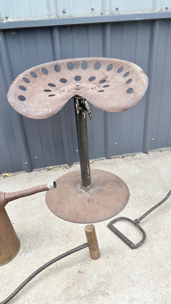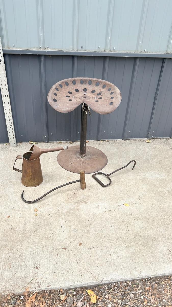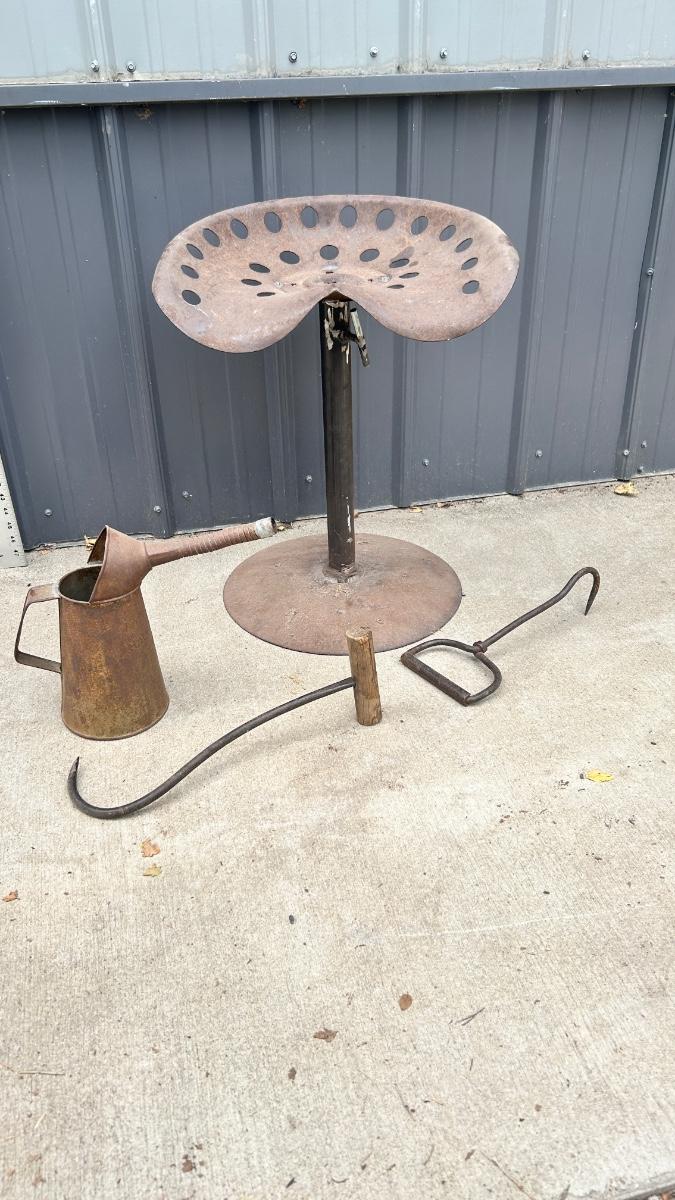 COOL OLD TRACTOR SEAT CHAIR, OIL CAN, & HAY HOOKS