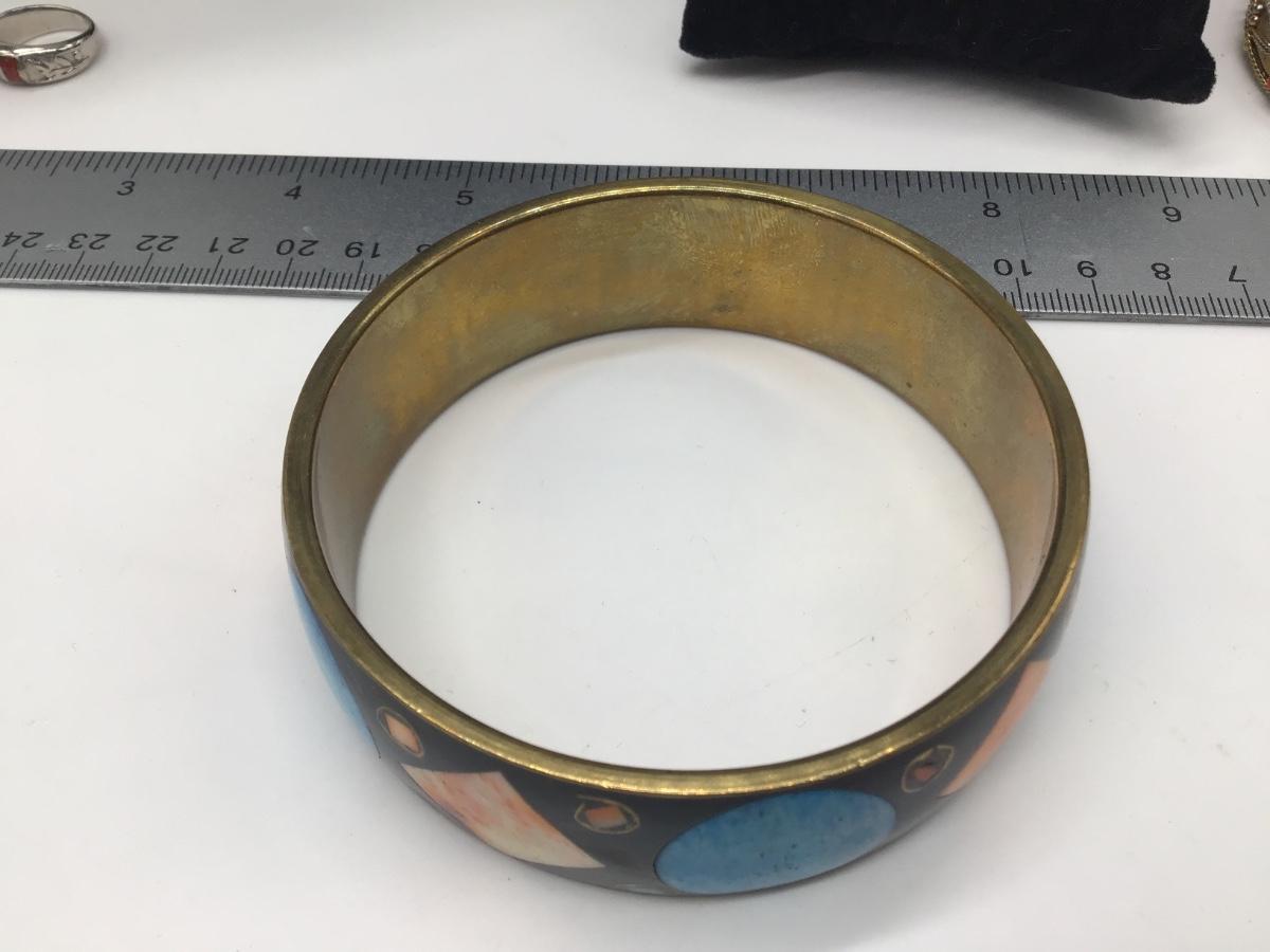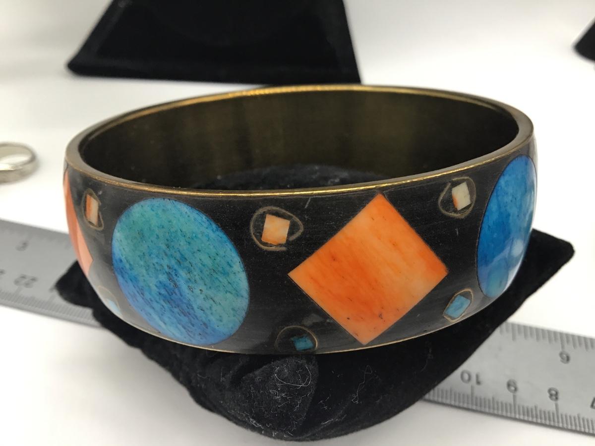 Cool Turquoise Blue Orange Black Inlay Roung Brass Gold Bangle Bracelet