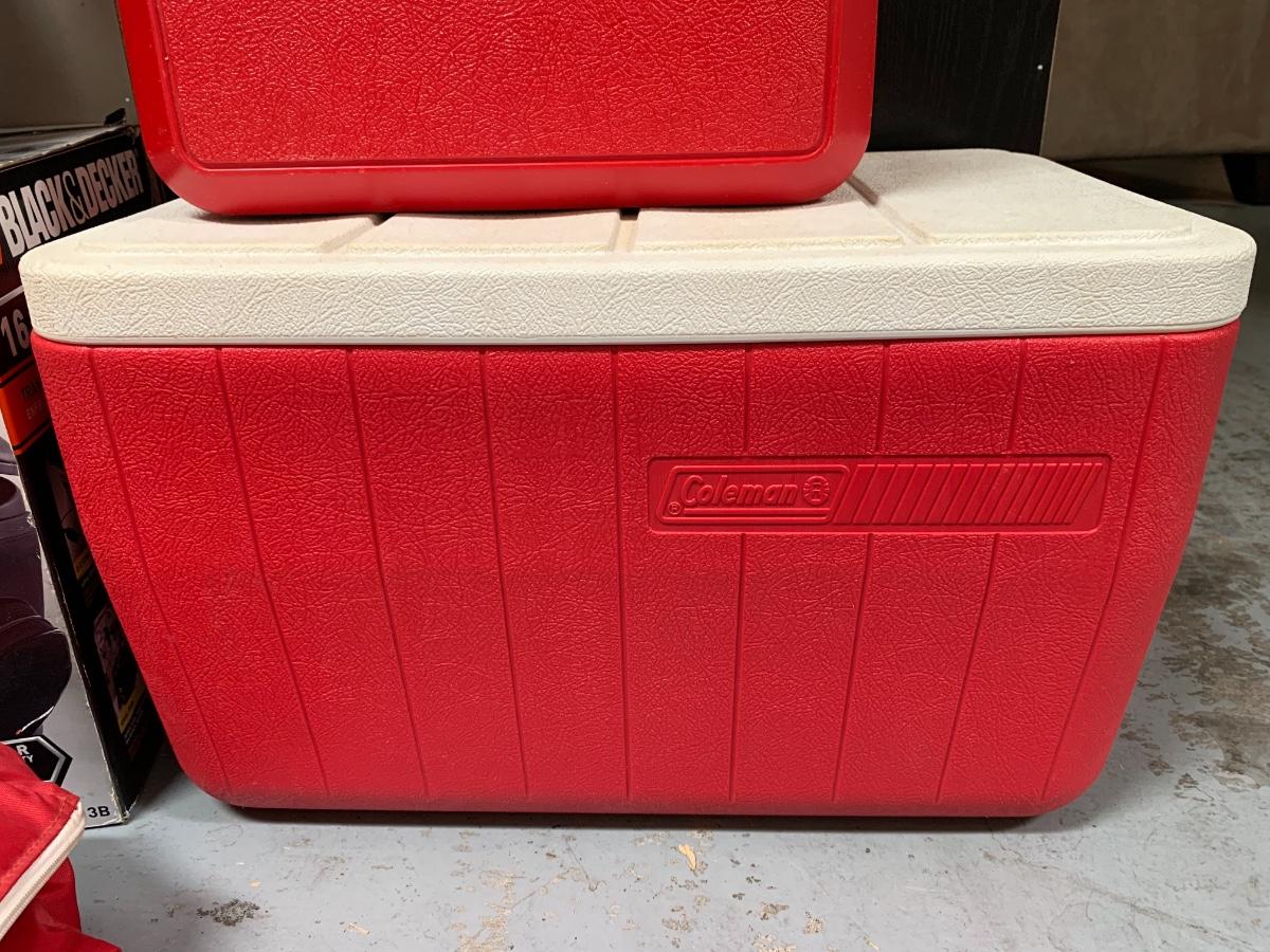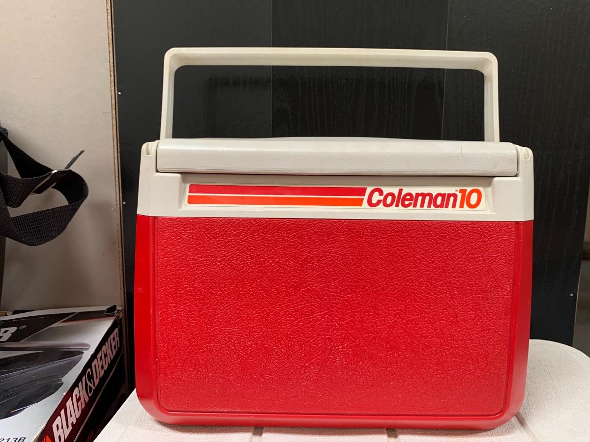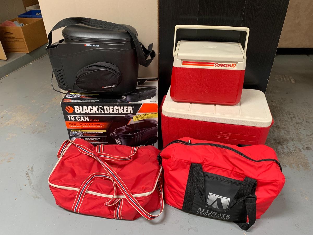 Includes a 16 can Black n Decker travel cooler and warmer, Coleman 10 small cooler with handle. Colman larger red cooler with side handles. A Totes brand retro soft side cooler bag and an advertising cooler bag.