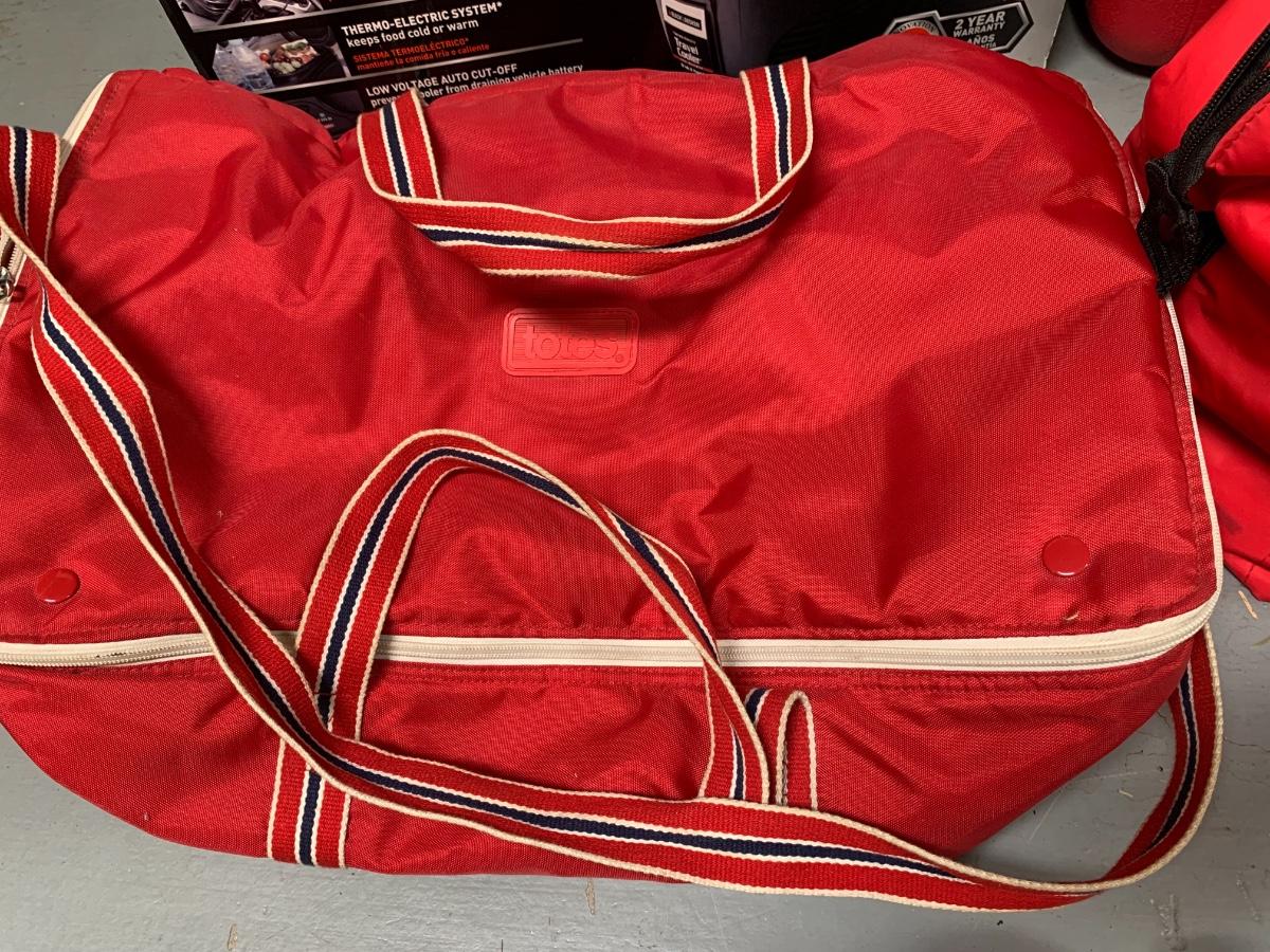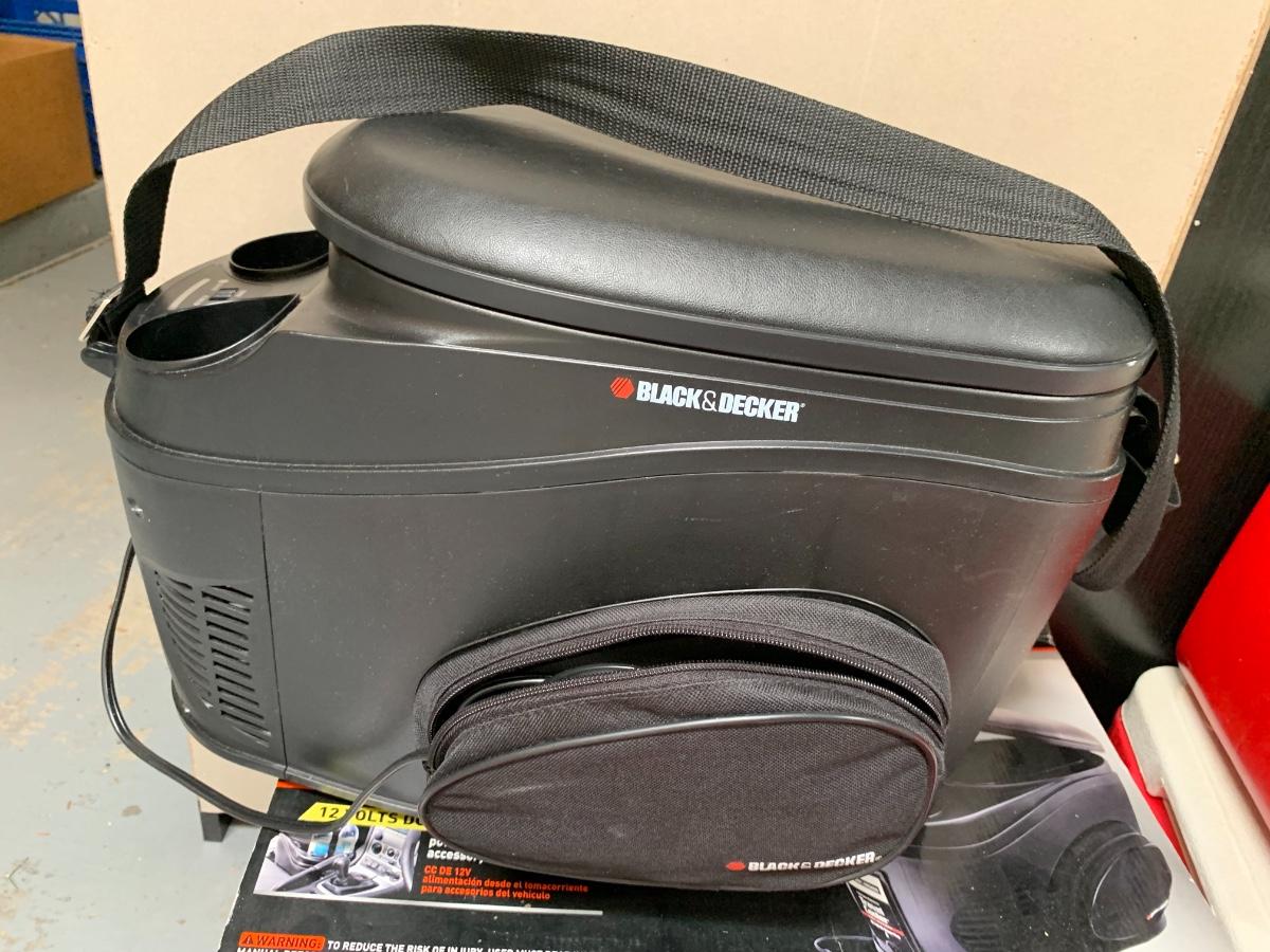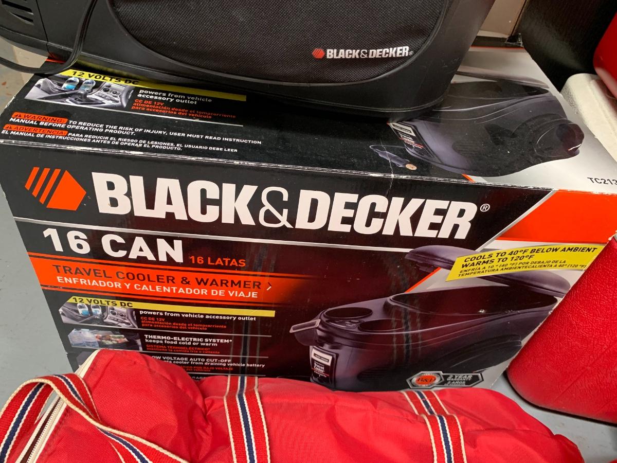 Includes a 16 can Black n Decker travel cooler and warmer, Coleman 10 small cooler with handle. Colman larger red cooler with side handles. A Totes brand retro soft side cooler bag and an advertising cooler bag.