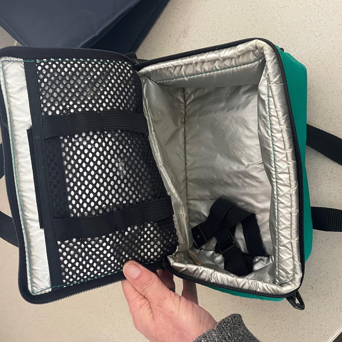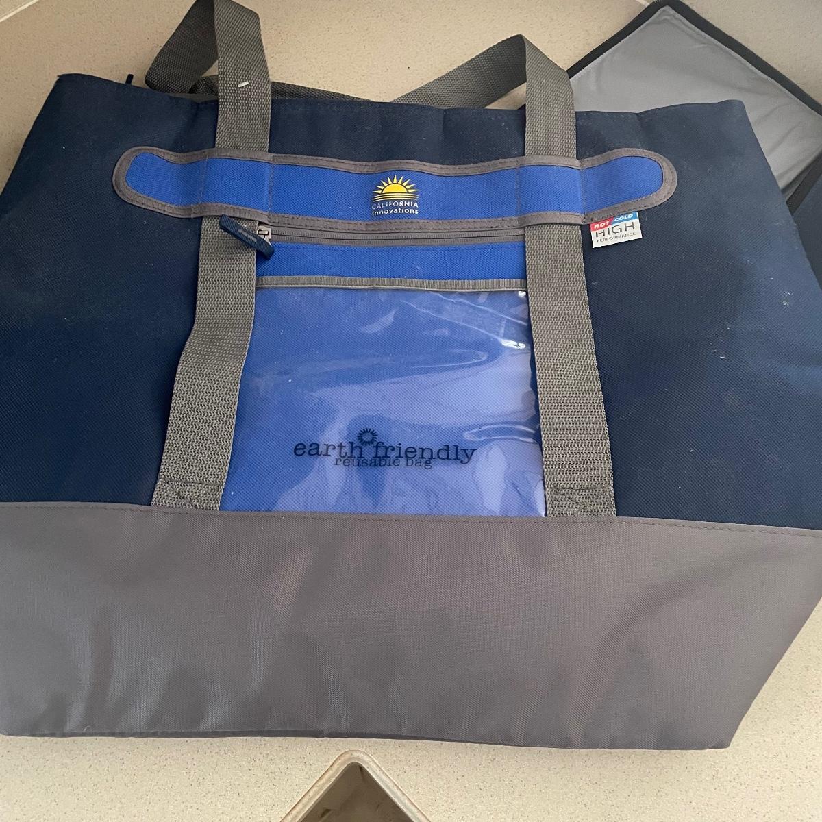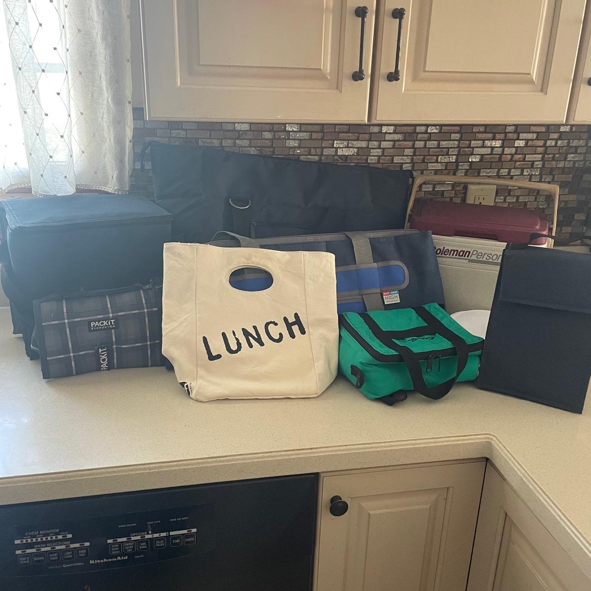 Multiple lunch bags in this lot that includes freeze and go style bags as well as insulated ones. The small cooler is a Coleman. Also included are two large hot/cold large tote bags and more.