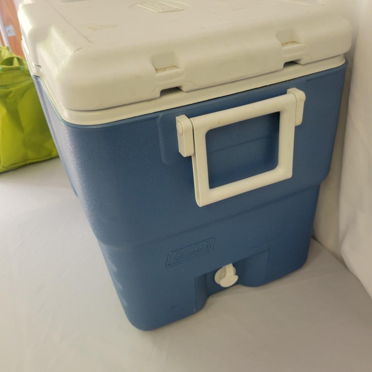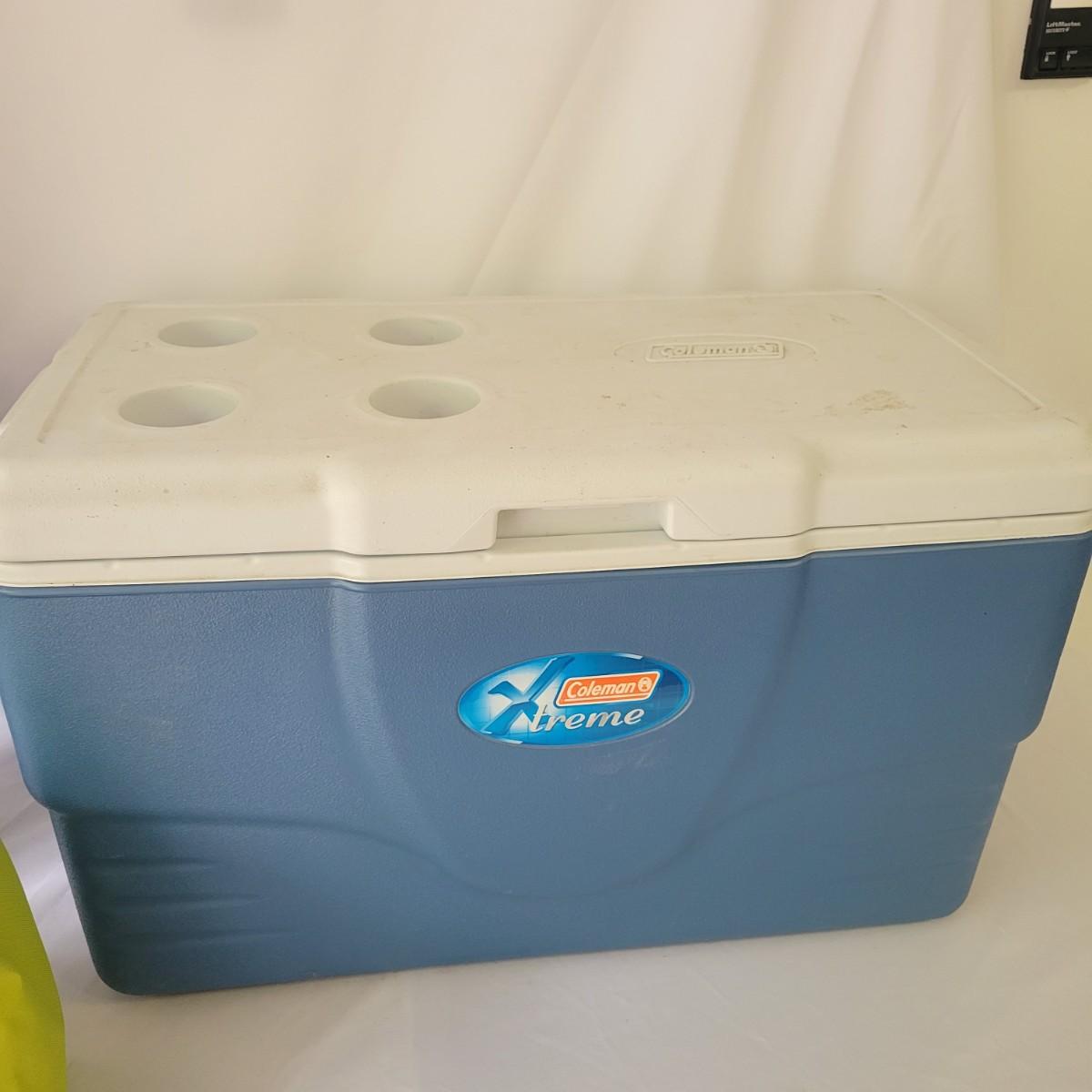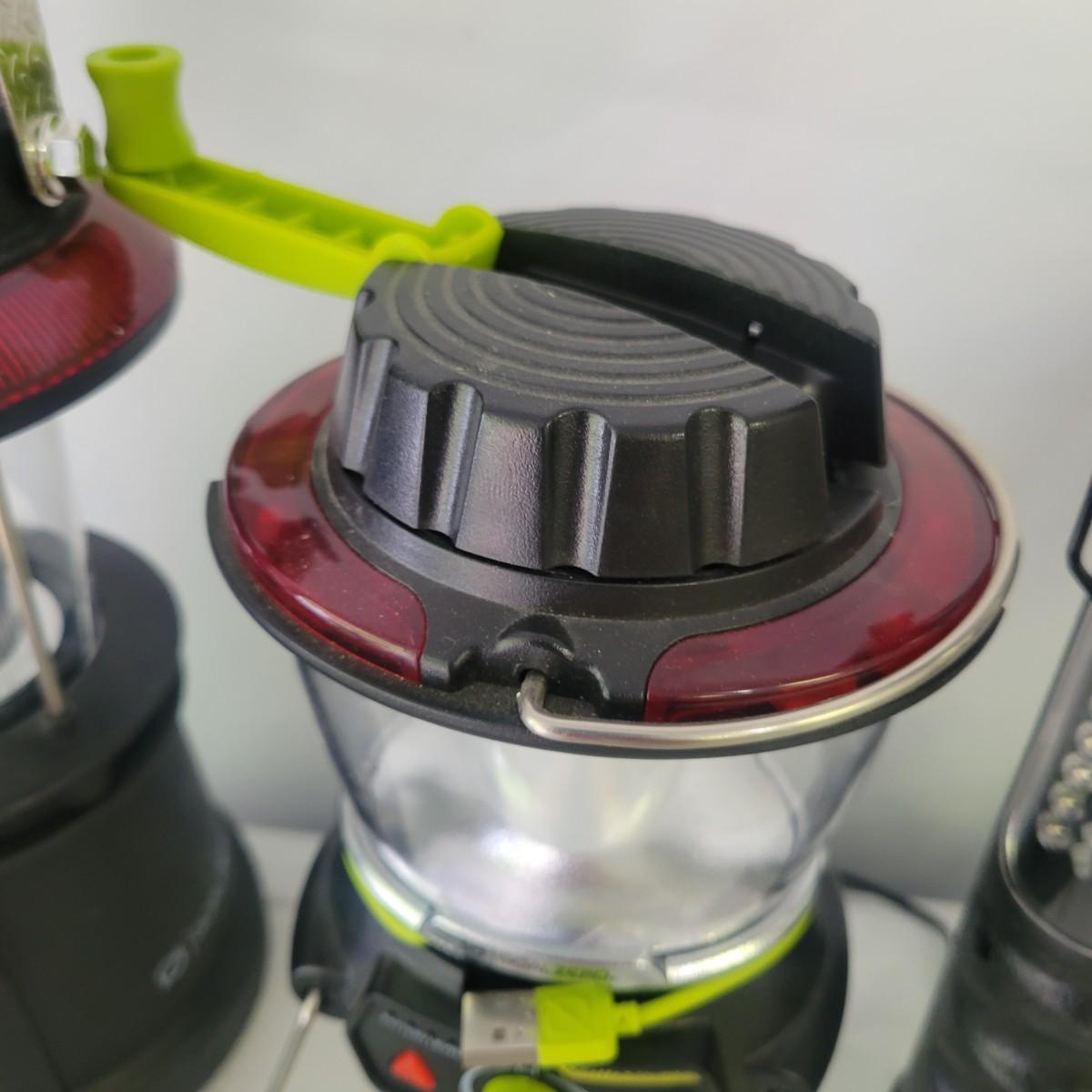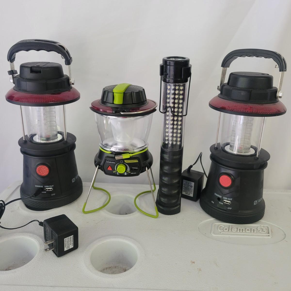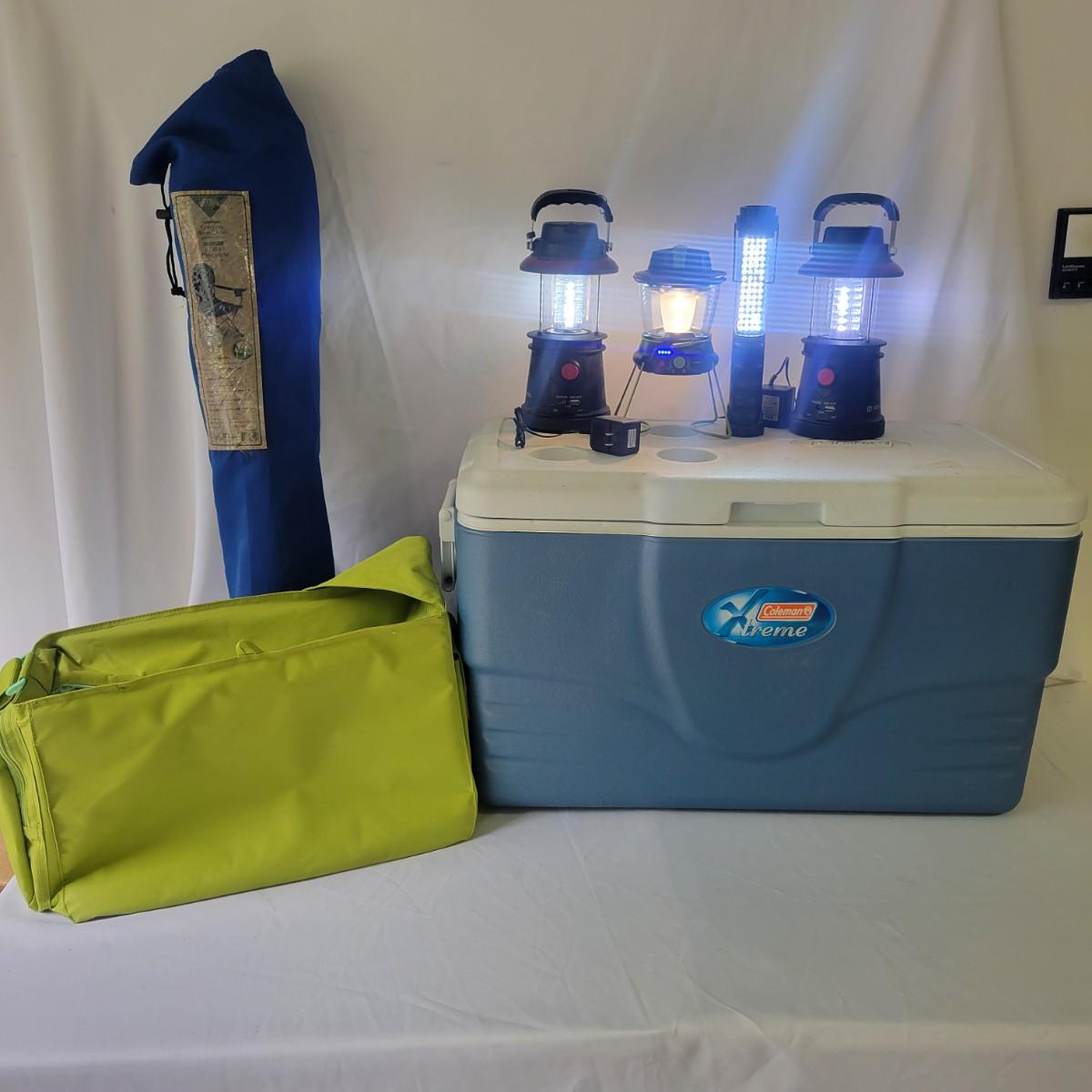An assortment of four emergency lights, a Coleman cooler, a soft sided cooler and a folding chair. The emergency lights feature rechargeable batteries and three if then have hand cranks and USB power discharges with multiple light settings. The Coleman cooler measures approximately 32" x 16" x 18". It also includes a fabric folding chair and a Whole Foods soft sided cooler. Local pickup only