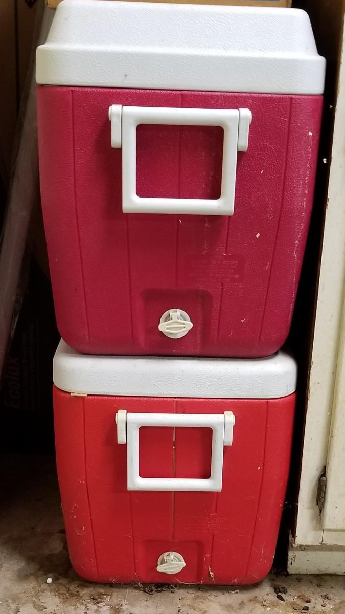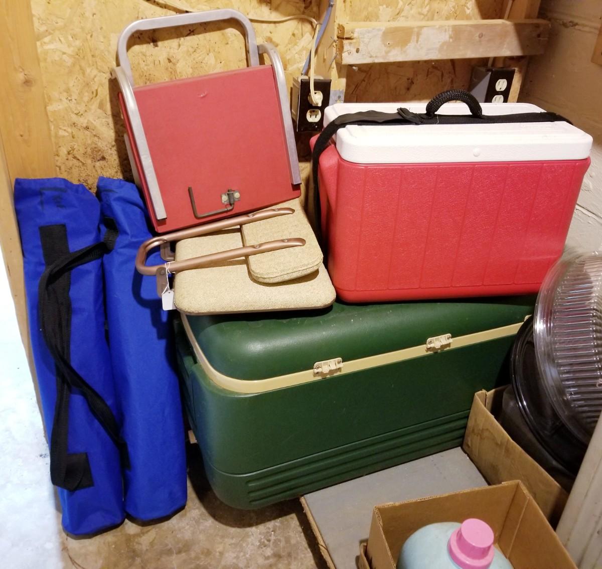4 coolers, 2 stadium seats and 2 camping chairs.