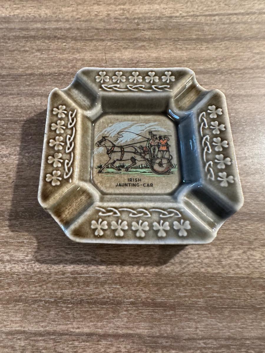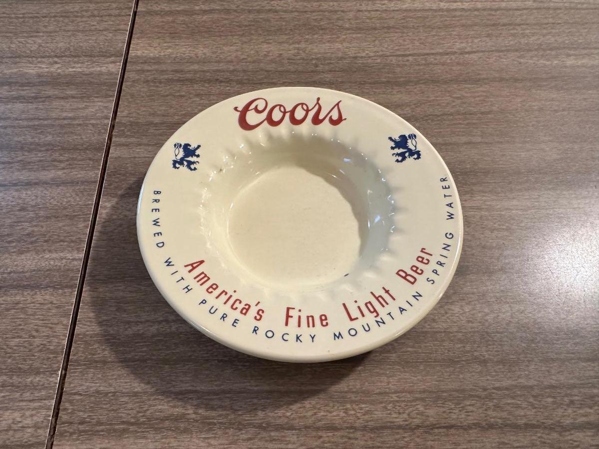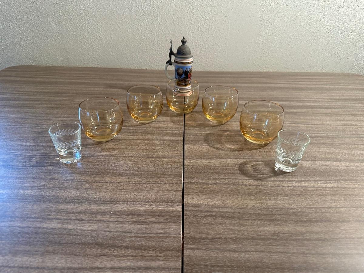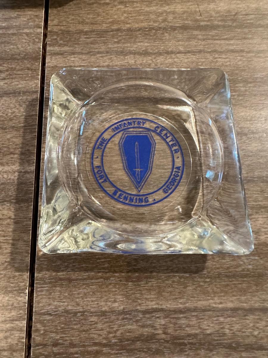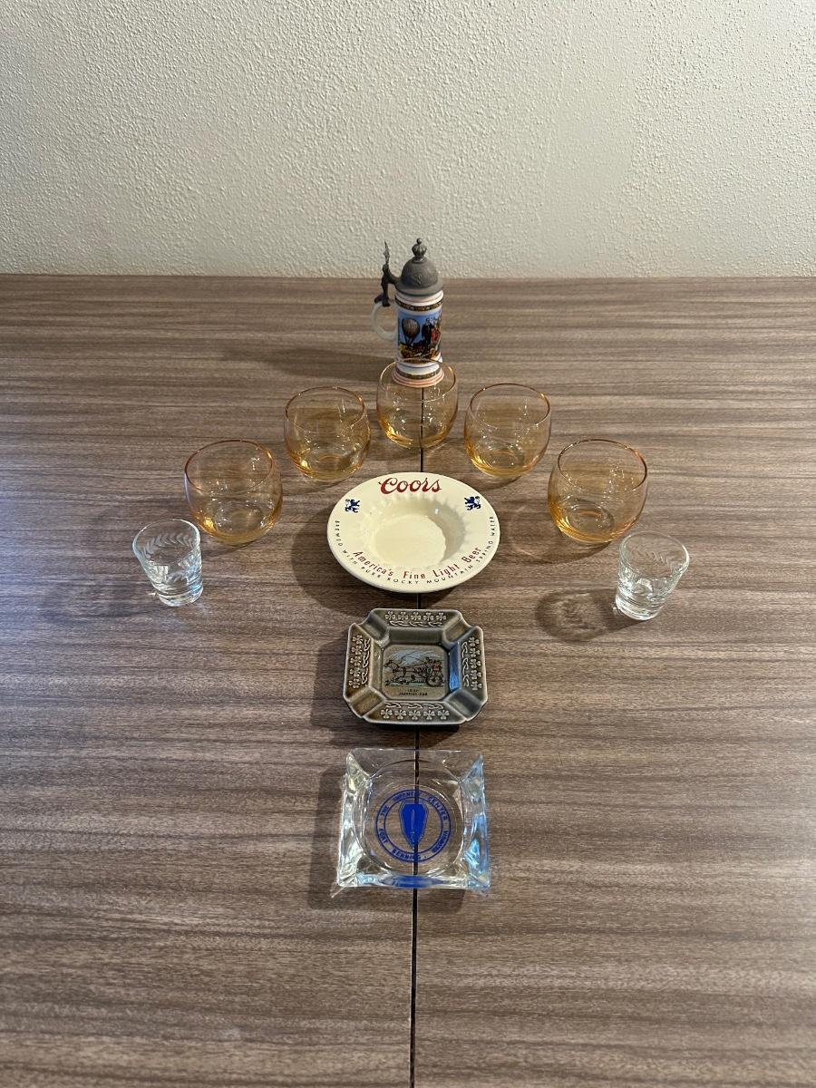COORS, FORT BENNING & IRISH ASHTRAYS, SMALLER STEIN, SHOT GLASSES AND DRINKING GLASES