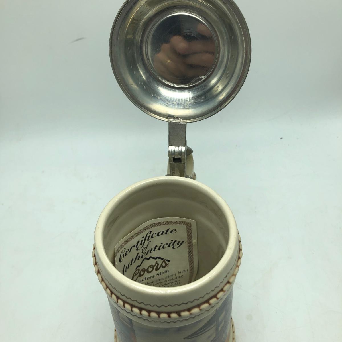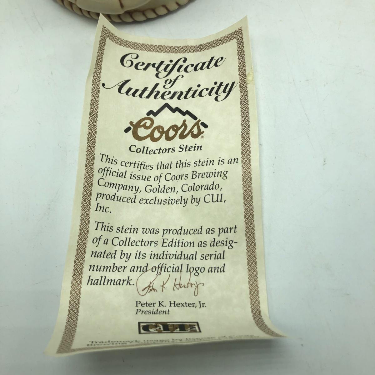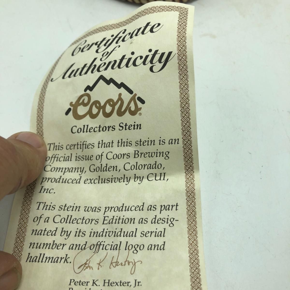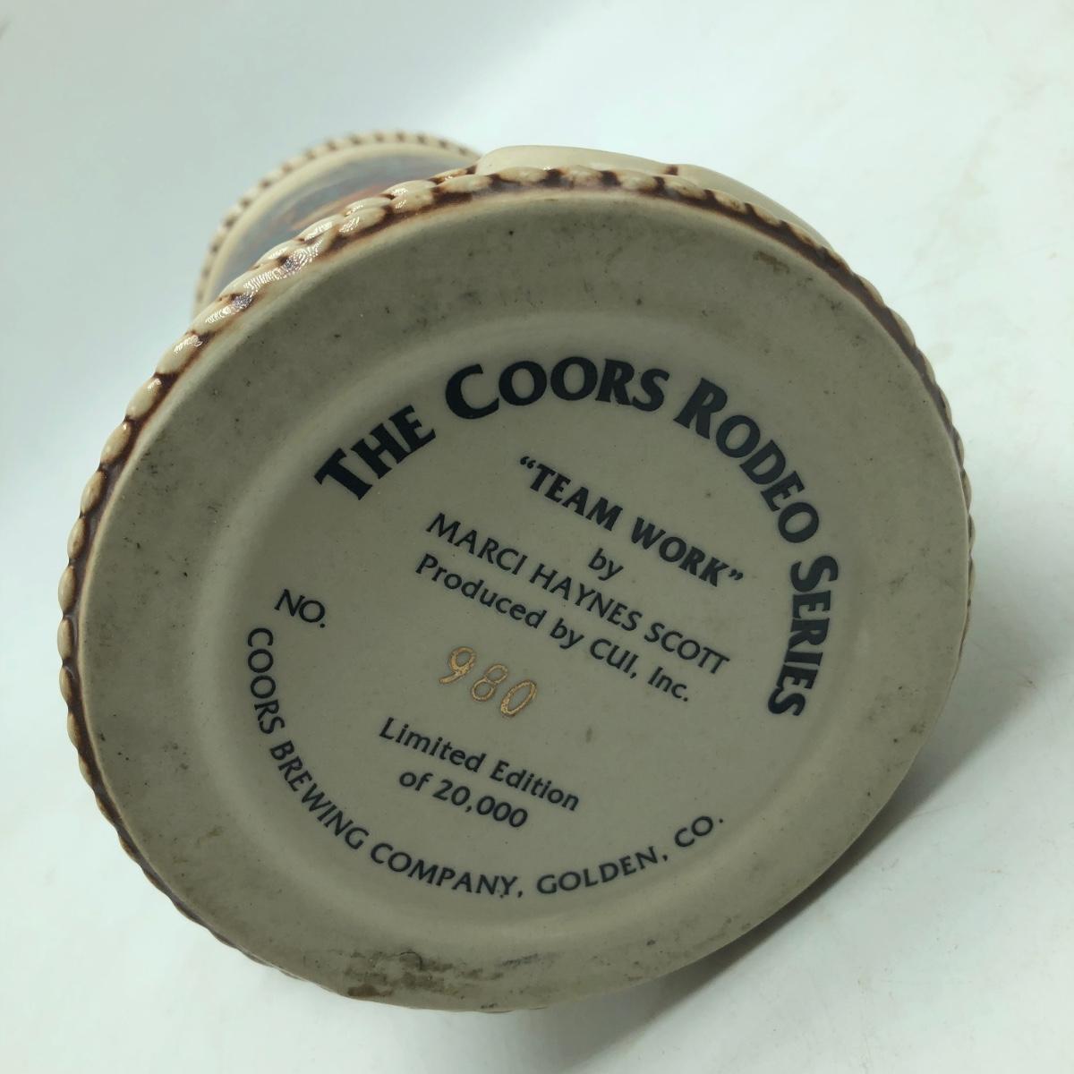 Lot contains three Coors Rodeo Series steins including Bulldogger,Team Work and Jackhammer also includes Coors collector stein. Steins measure 4.25” x 6” x 10”. All steins have COA.