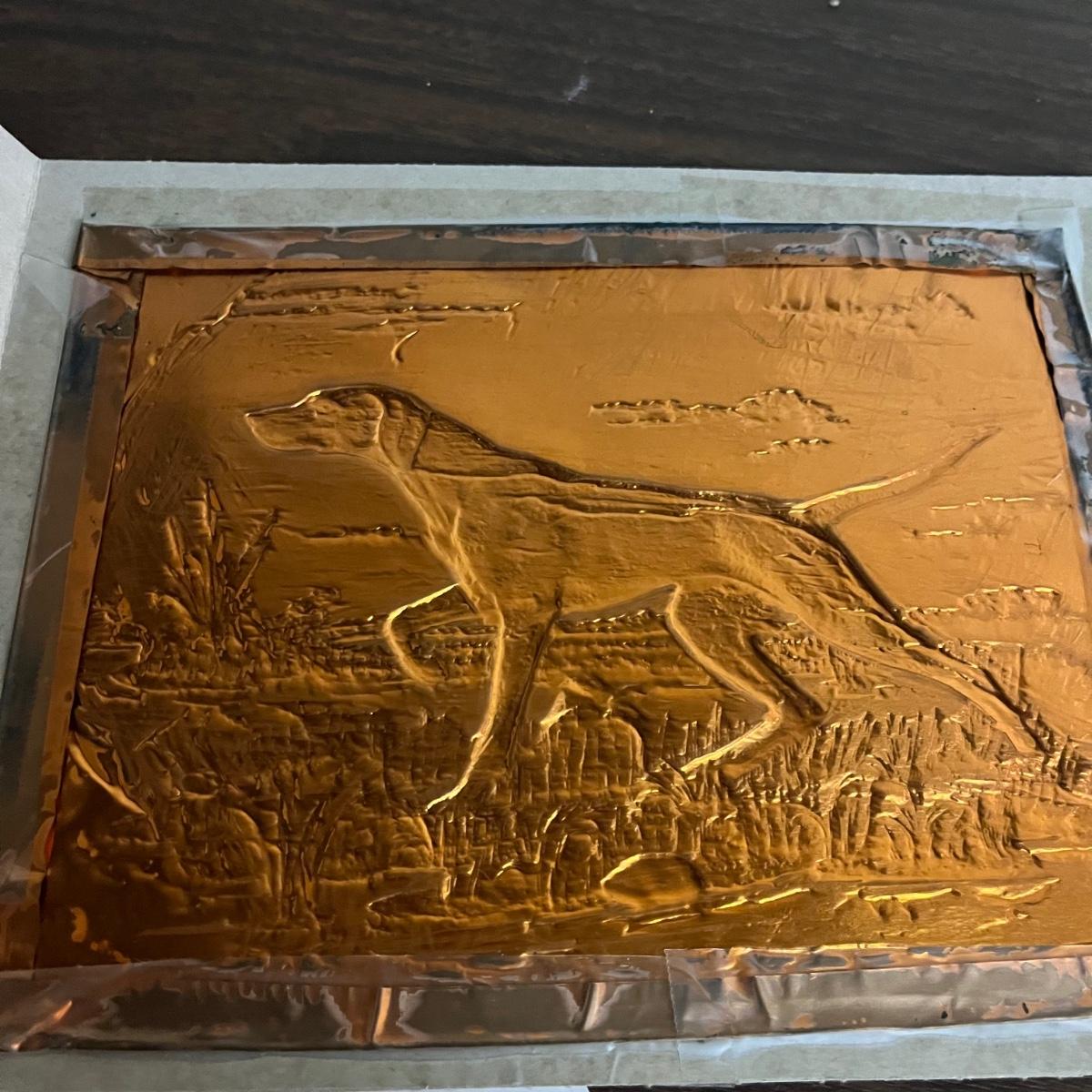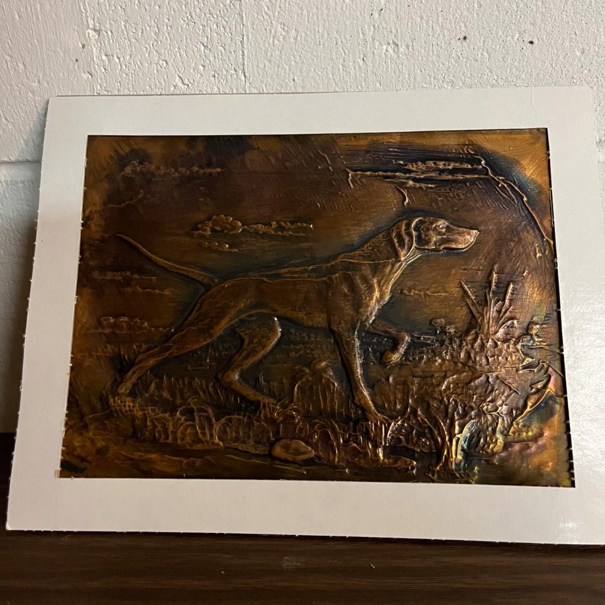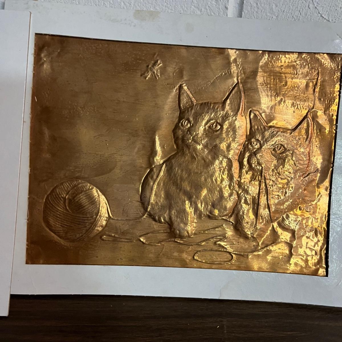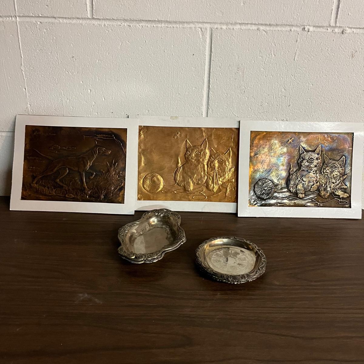 Lot includes two cat pieces of copper embossed Art and one dog piece of embossed copper Art (all with single matte surround) and six silver plated coasters and two unmarked trays. Art measures 6.25” x 8.25”.
