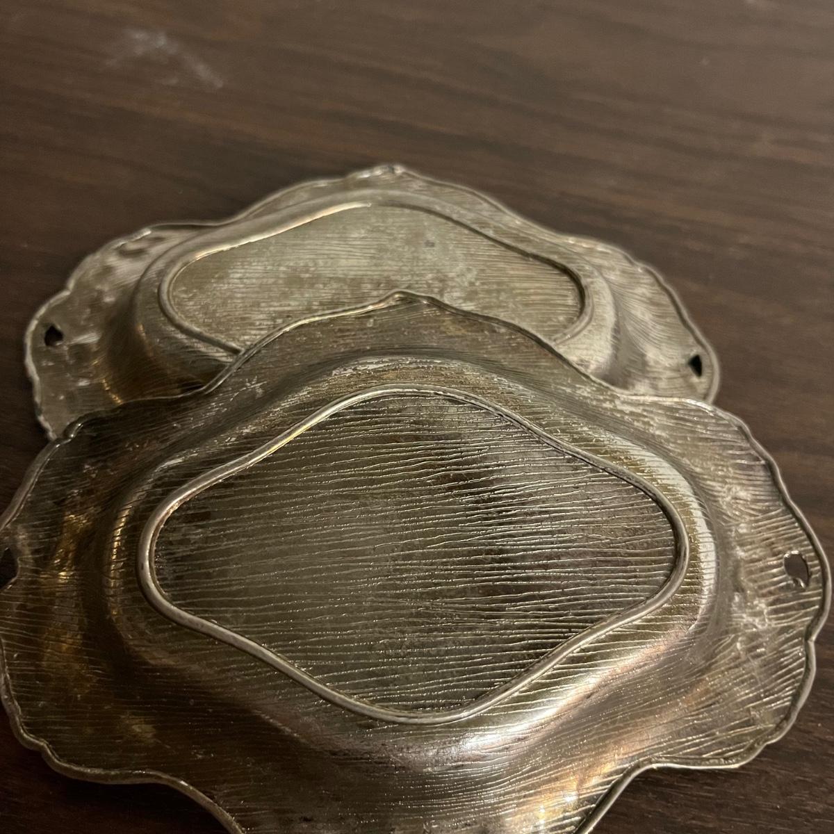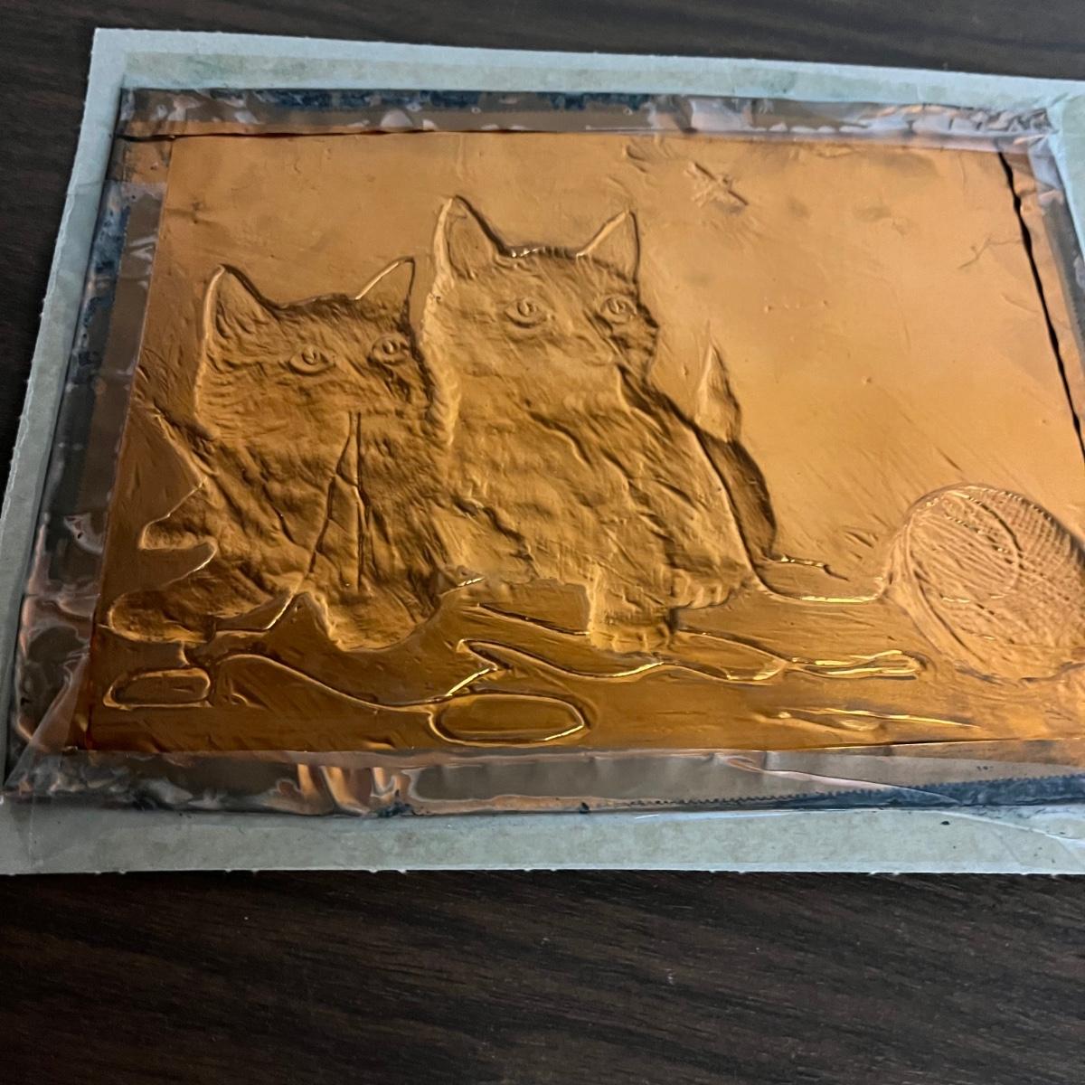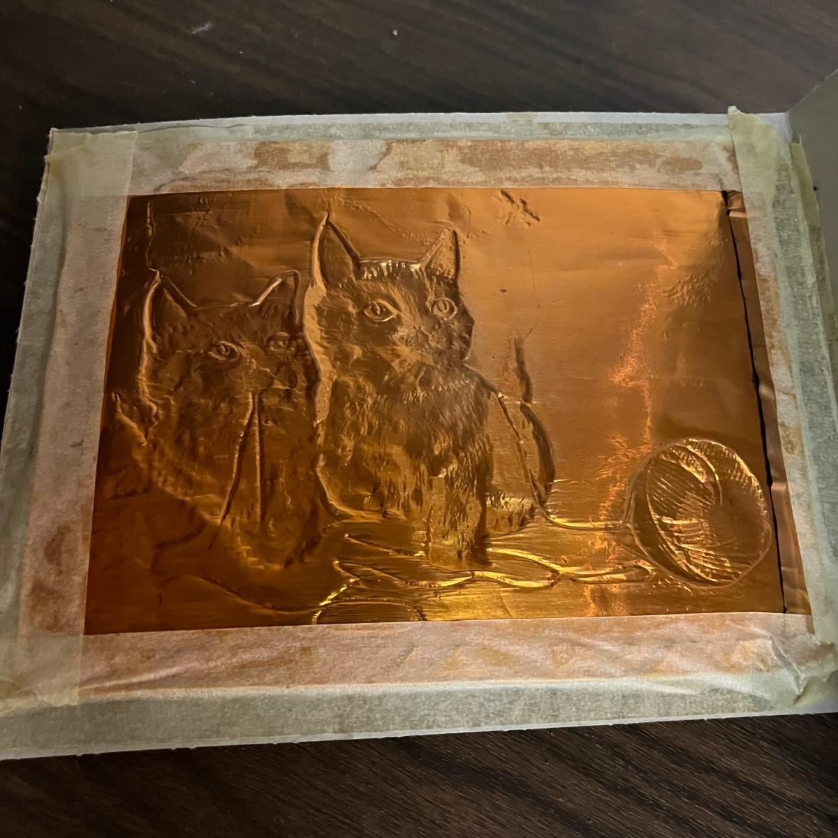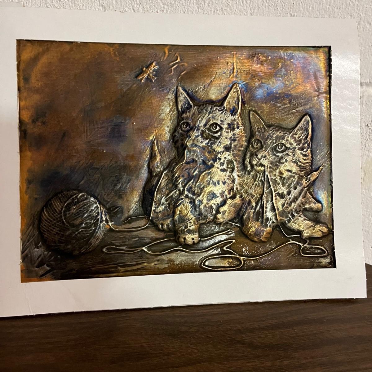 Lot includes two cat pieces of copper embossed Art and one dog piece of embossed copper Art (all with single matte surround) and six silver plated coasters and two unmarked trays. Art measures 6.25” x 8.25”.