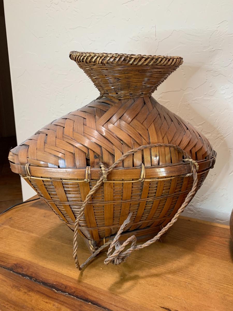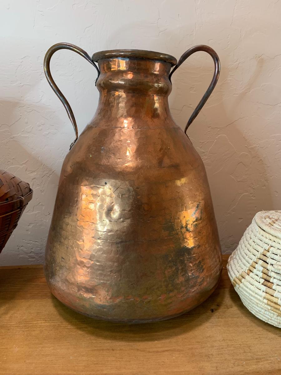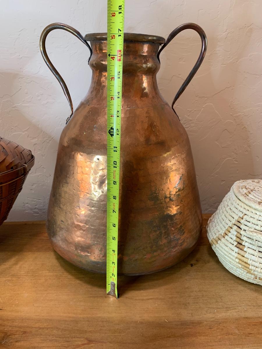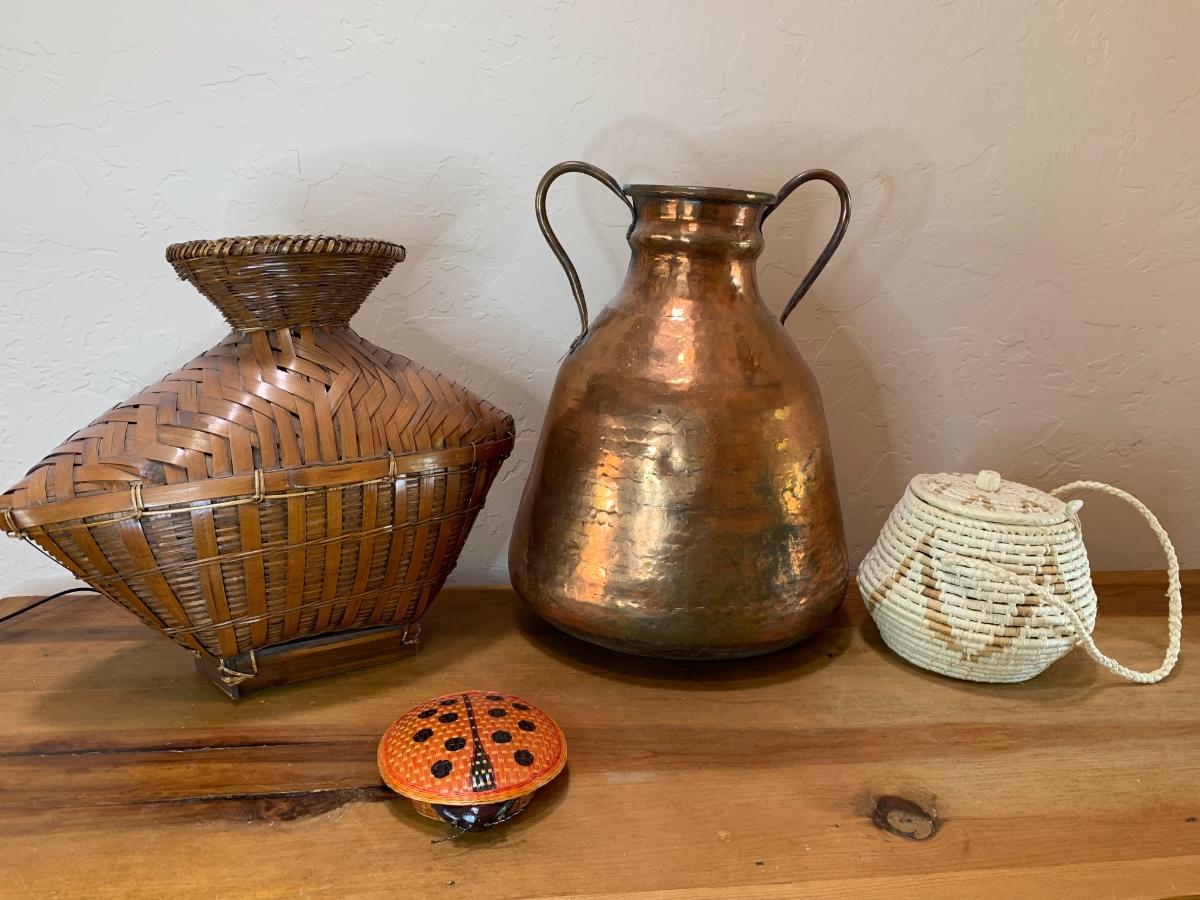 Woven Baskets and a heavy copper bin. Copper Bin weighs approximately 10 lbs. The larger brown basket appears to be some kind of back pack to shove your fish in after a good catch.