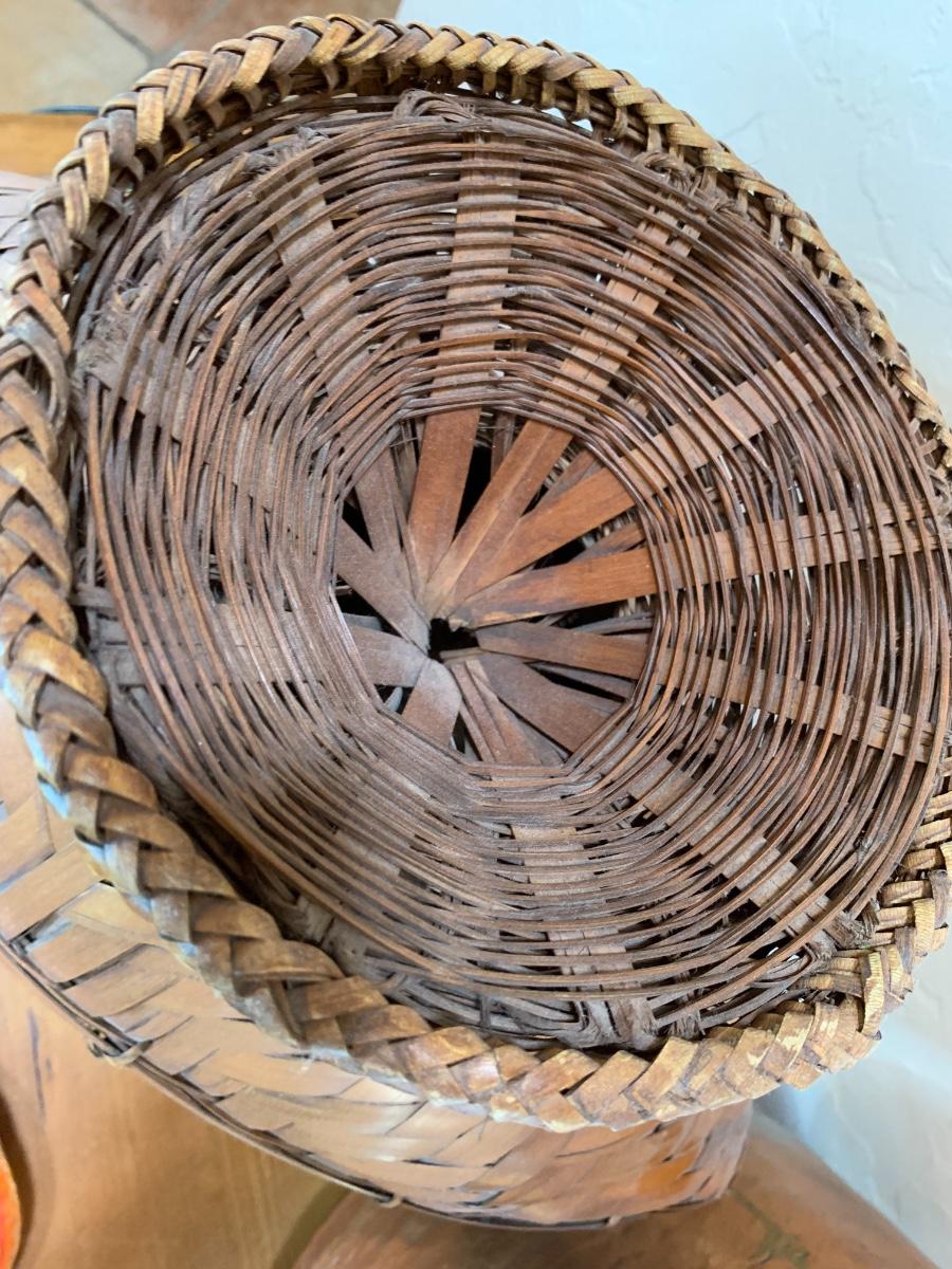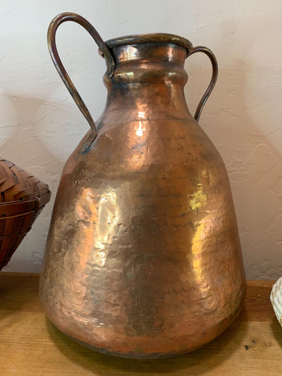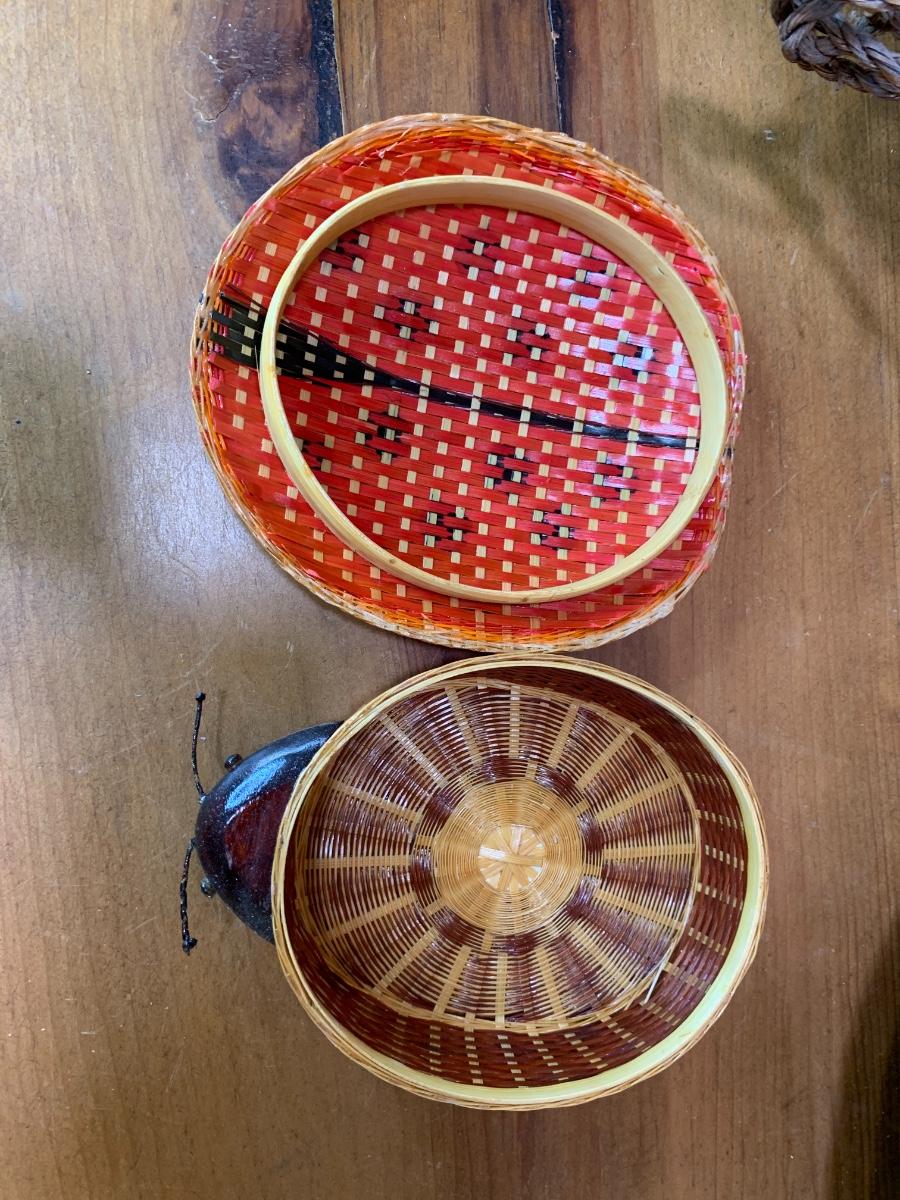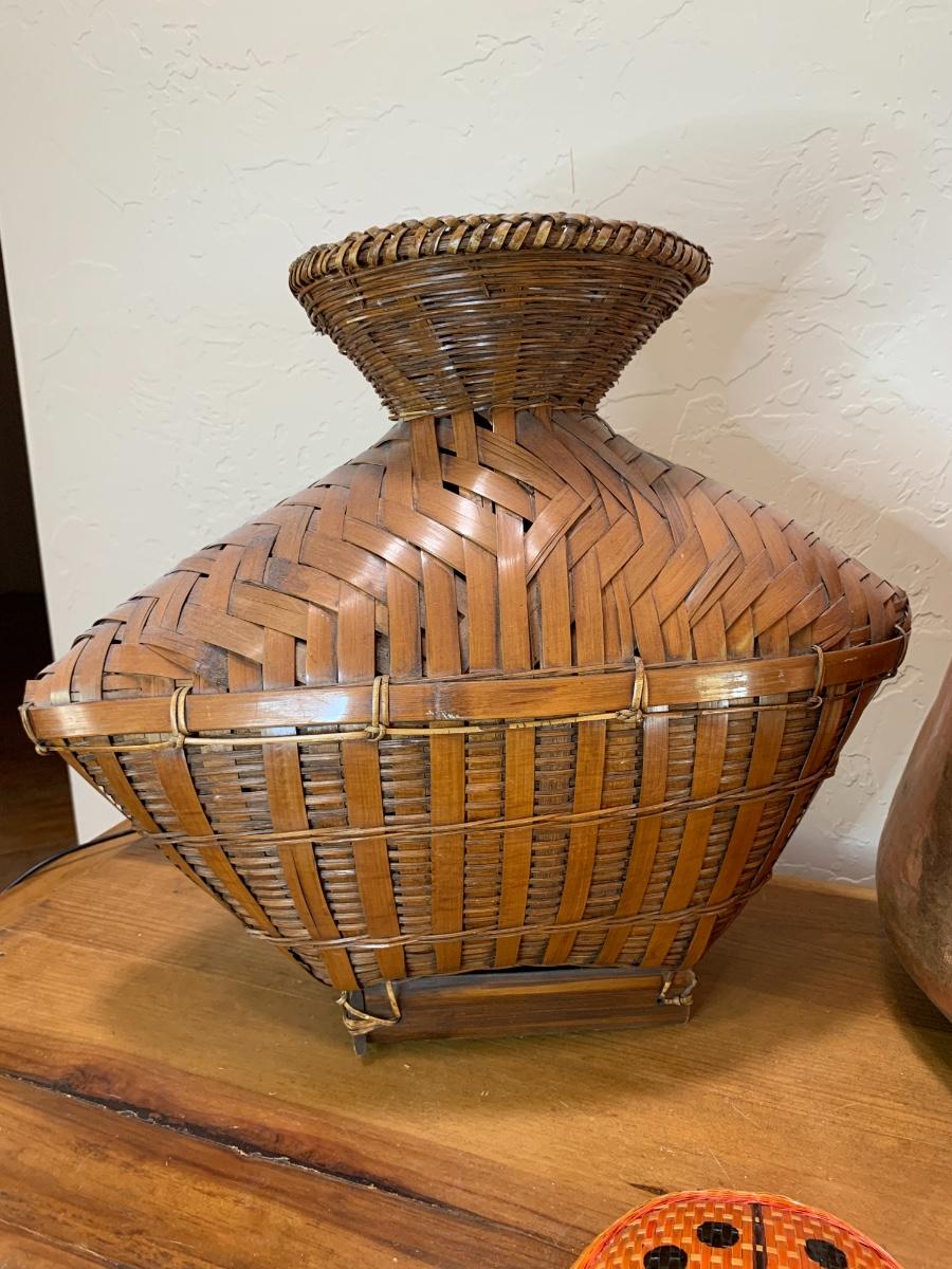 Woven Baskets and a heavy copper bin. Copper Bin weighs approximately 10 lbs. The larger brown basket appears to be some kind of back pack to shove your fish in after a good catch.