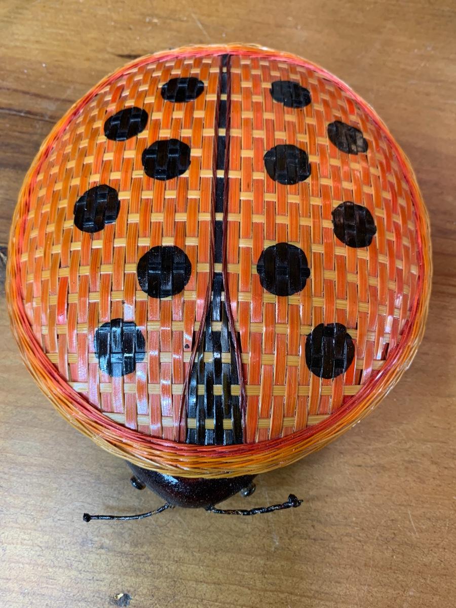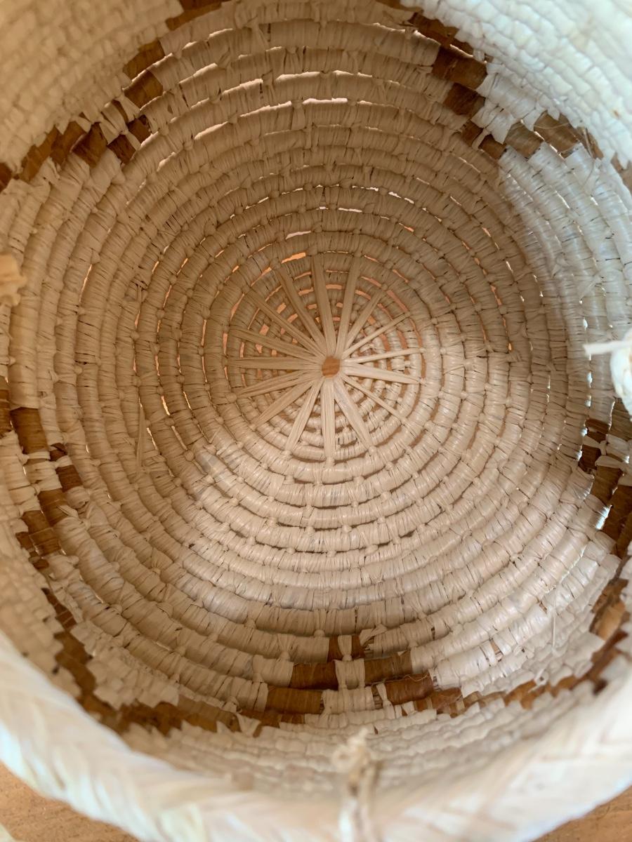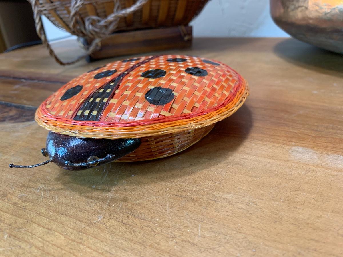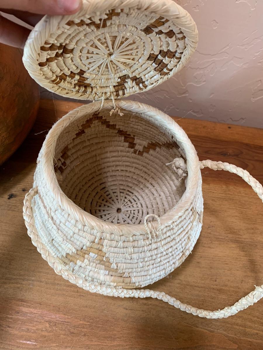Woven Baskets and a heavy copper bin. Copper Bin weighs approximately 10 lbs. The larger brown basket appears to be some kind of back pack to shove your fish in after a good catch.