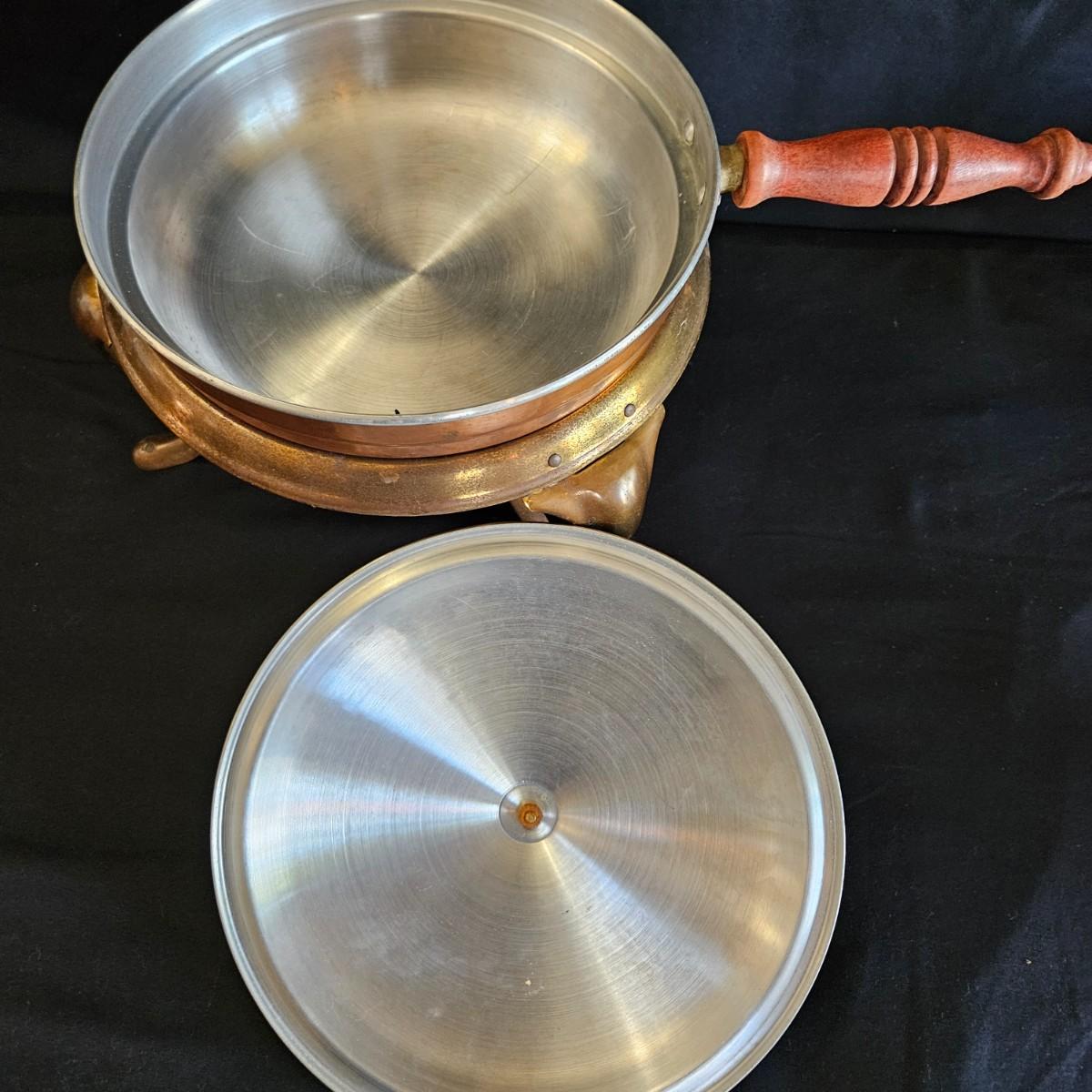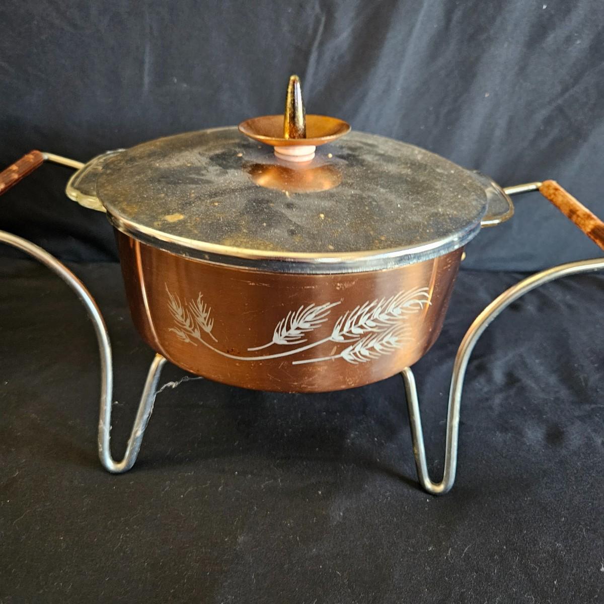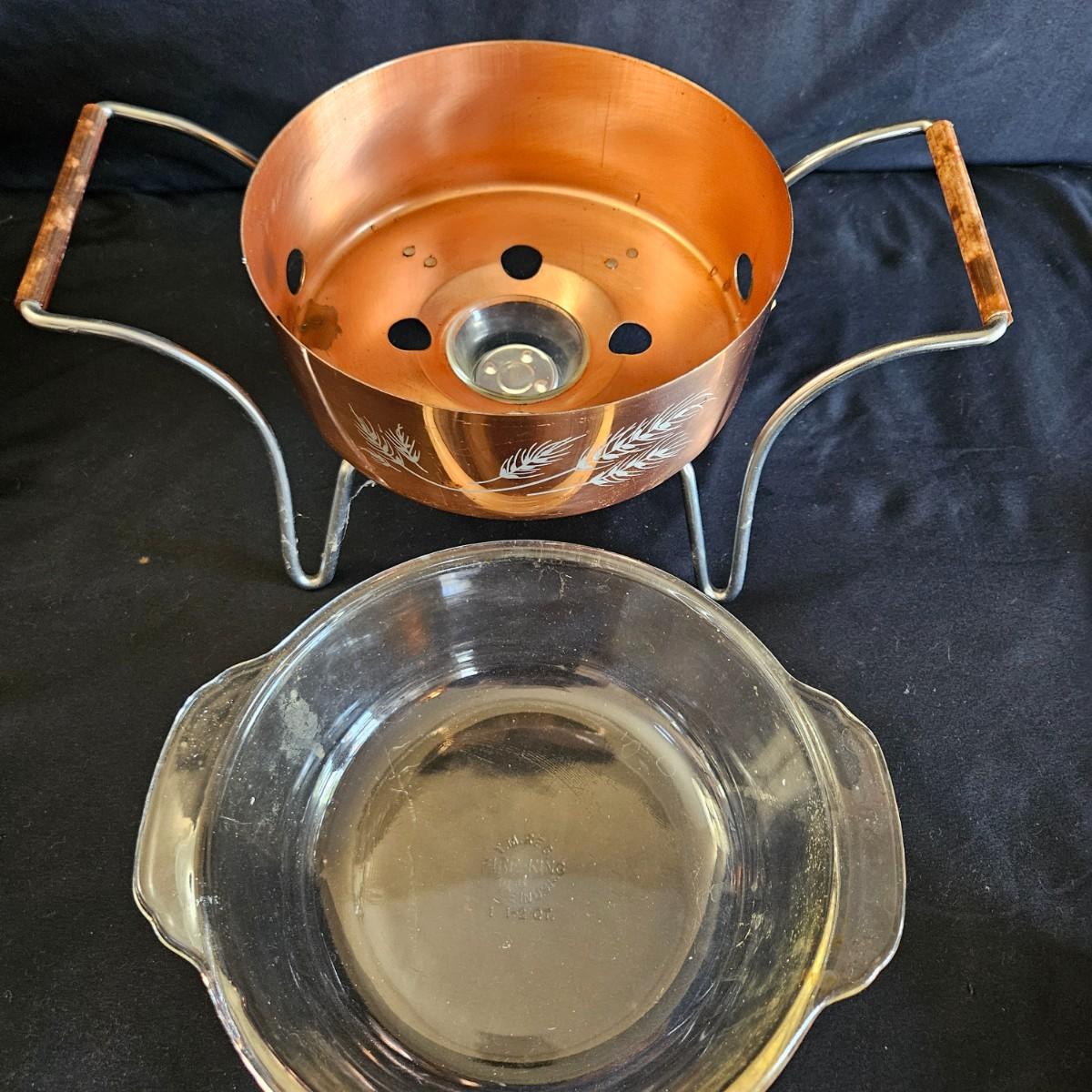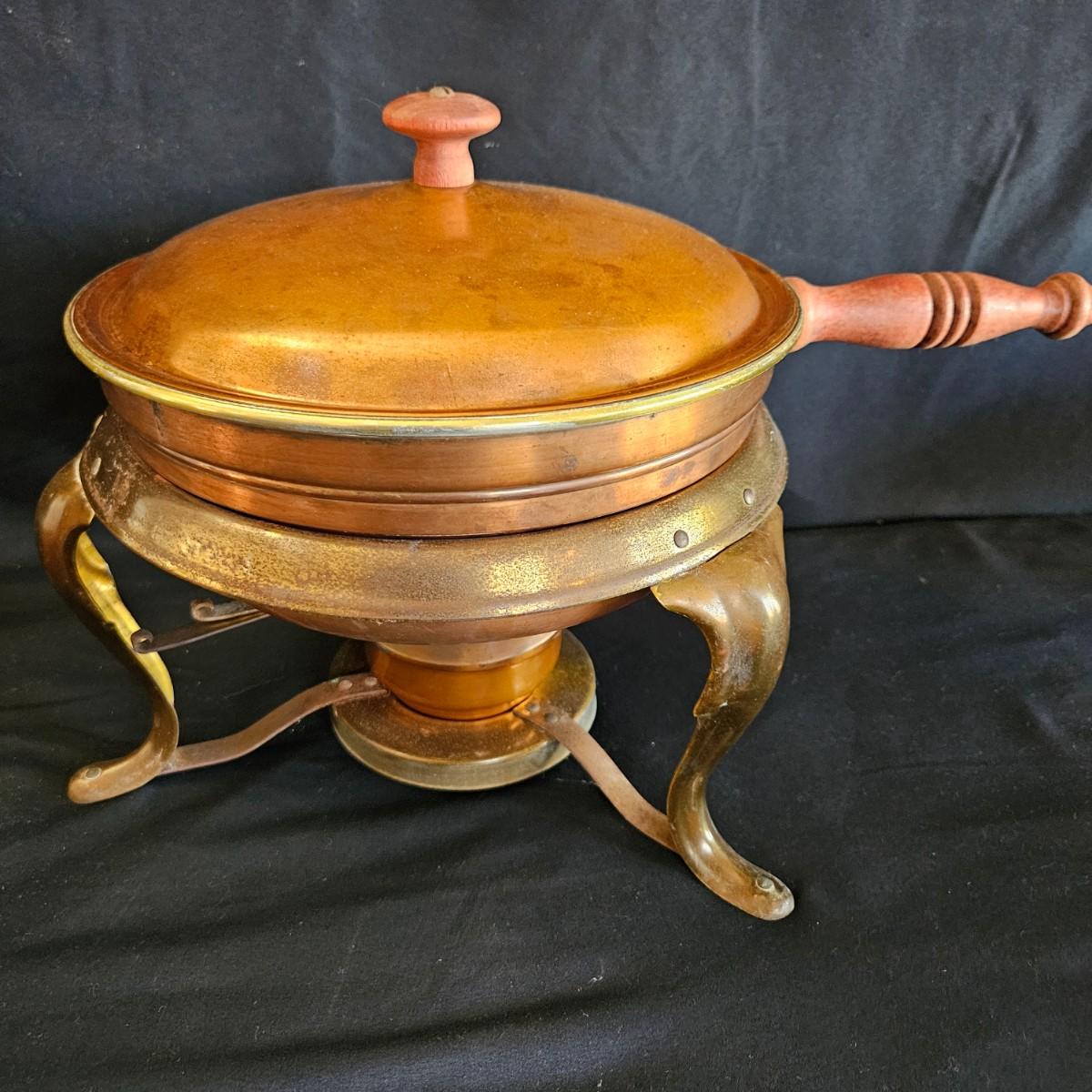 A pair of copper chafing dishes and a copper coffee pot. One chafing dish has a wheat design and an aluminum lid, a glass insert bowl and is heated by votive candles. The other has wooden handles, fits a sterno can for its heat source and has a brass-like frame. It measures approximately 10"D not including handle x 10"H. Also included is a copper and possibly brass coffee/tea kettle with a wooden handle. Local pickup only
