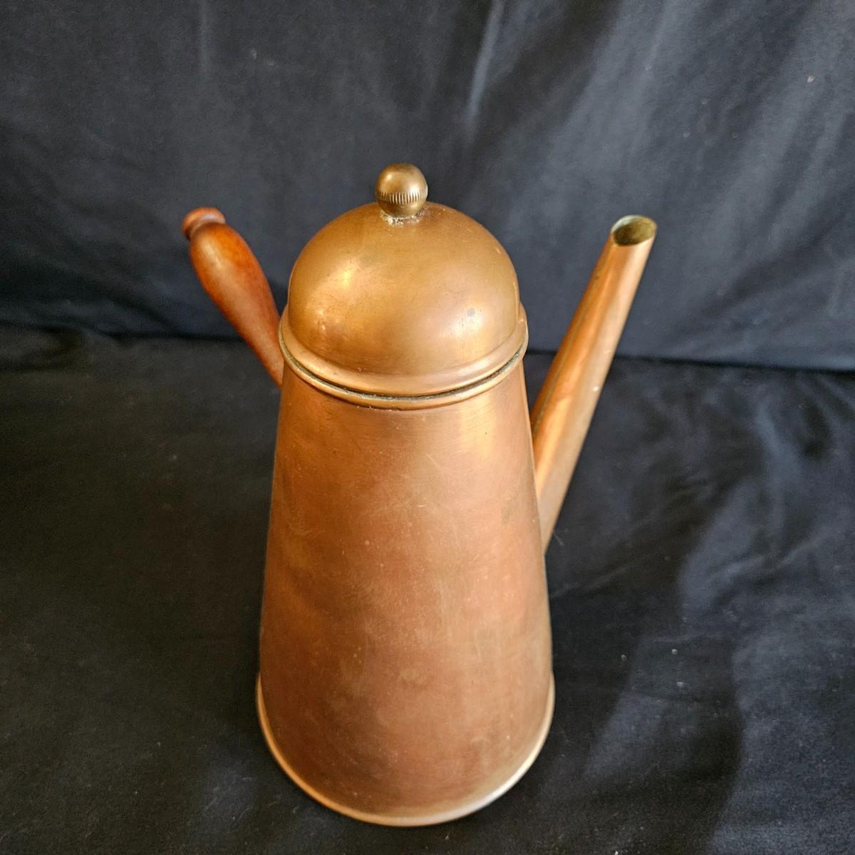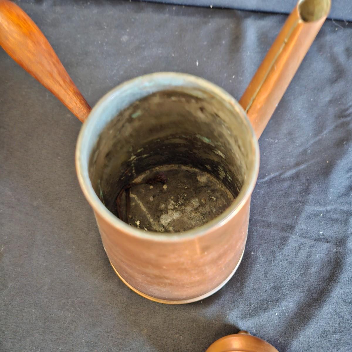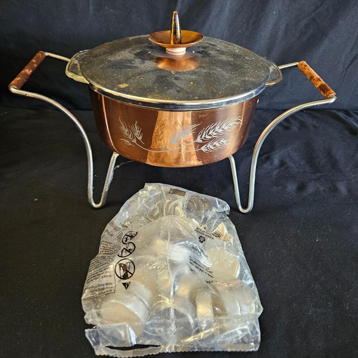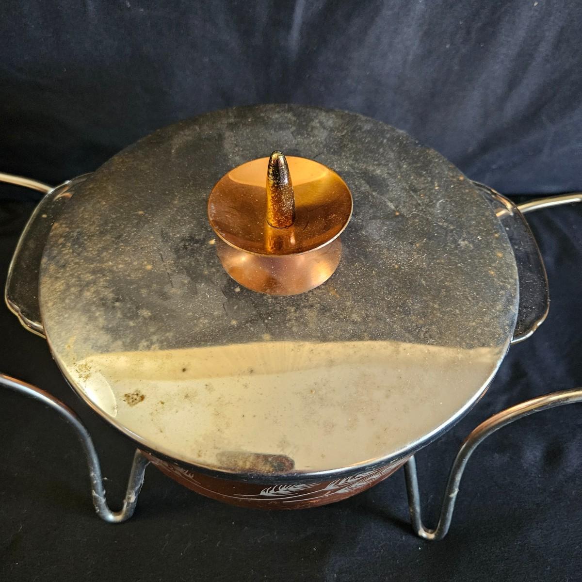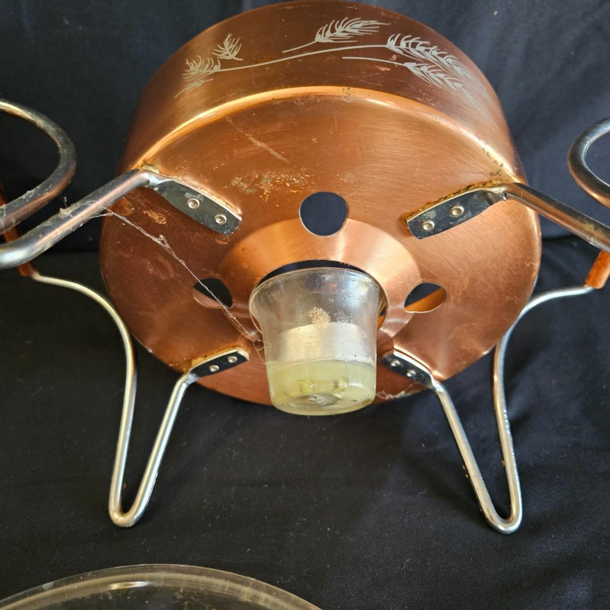 A pair of copper chafing dishes and a copper coffee pot. One chafing dish has a wheat design and an aluminum lid, a glass insert bowl and is heated by votive candles. The other has wooden handles, fits a sterno can for its heat source and has a brass-like frame. It measures approximately 10"D not including handle x 10"H. Also included is a copper and possibly brass coffee/tea kettle with a wooden handle. Local pickup only