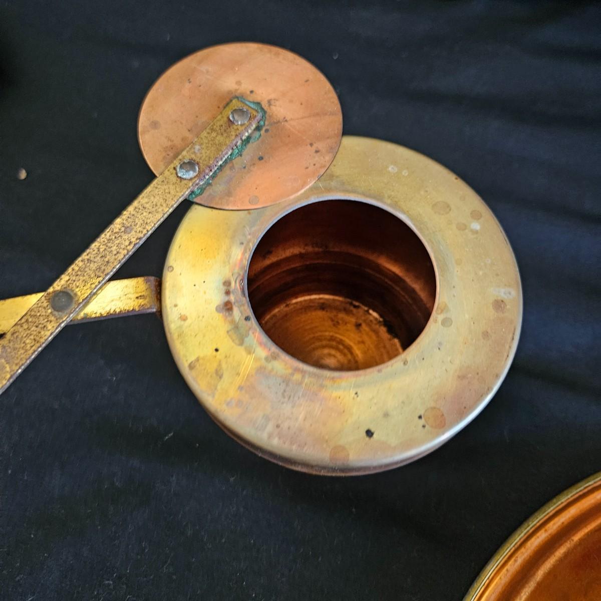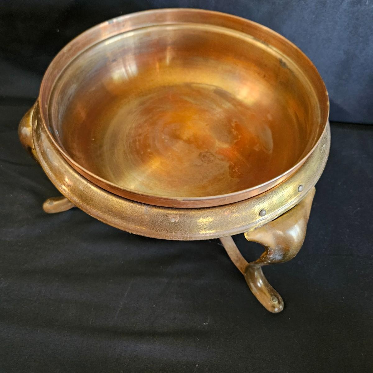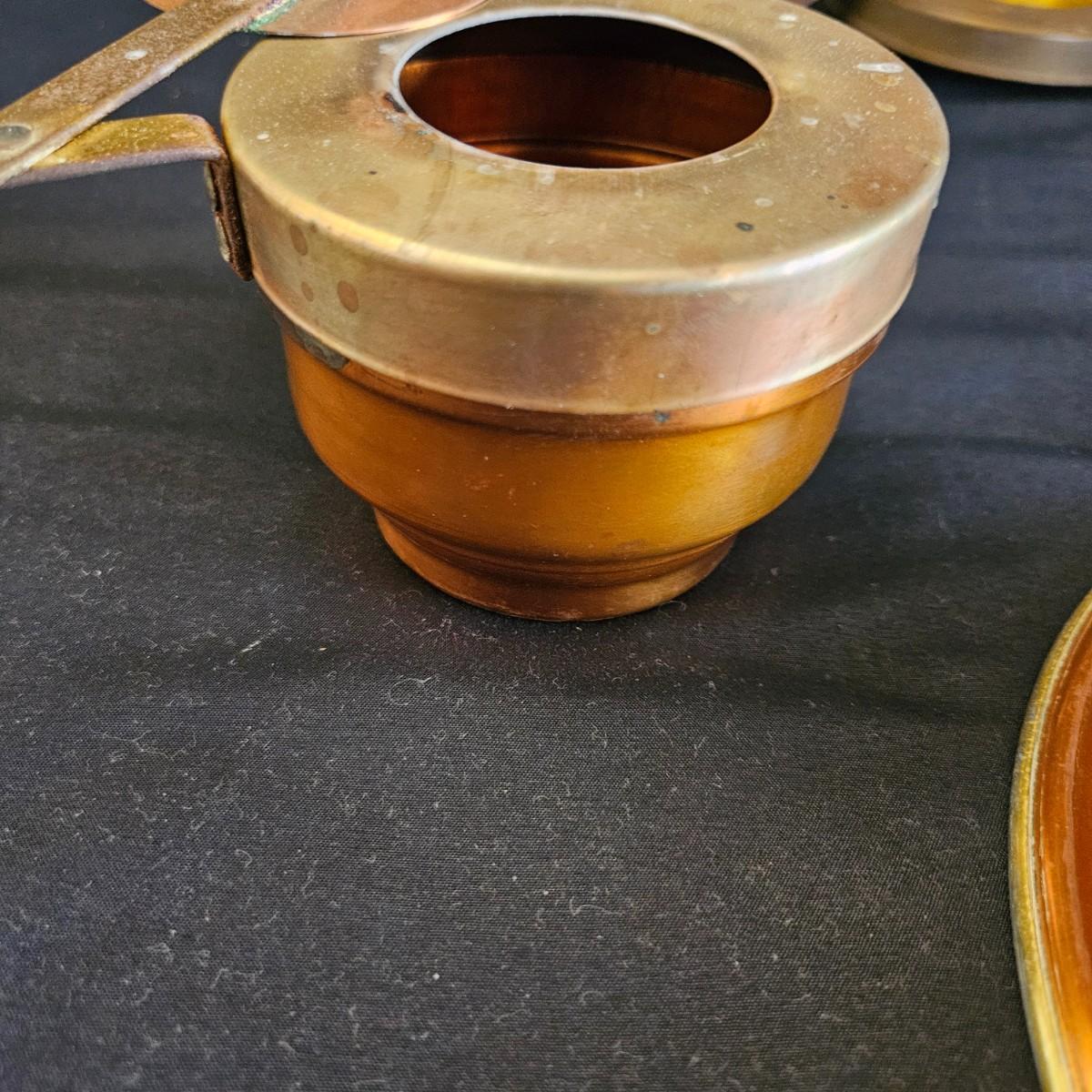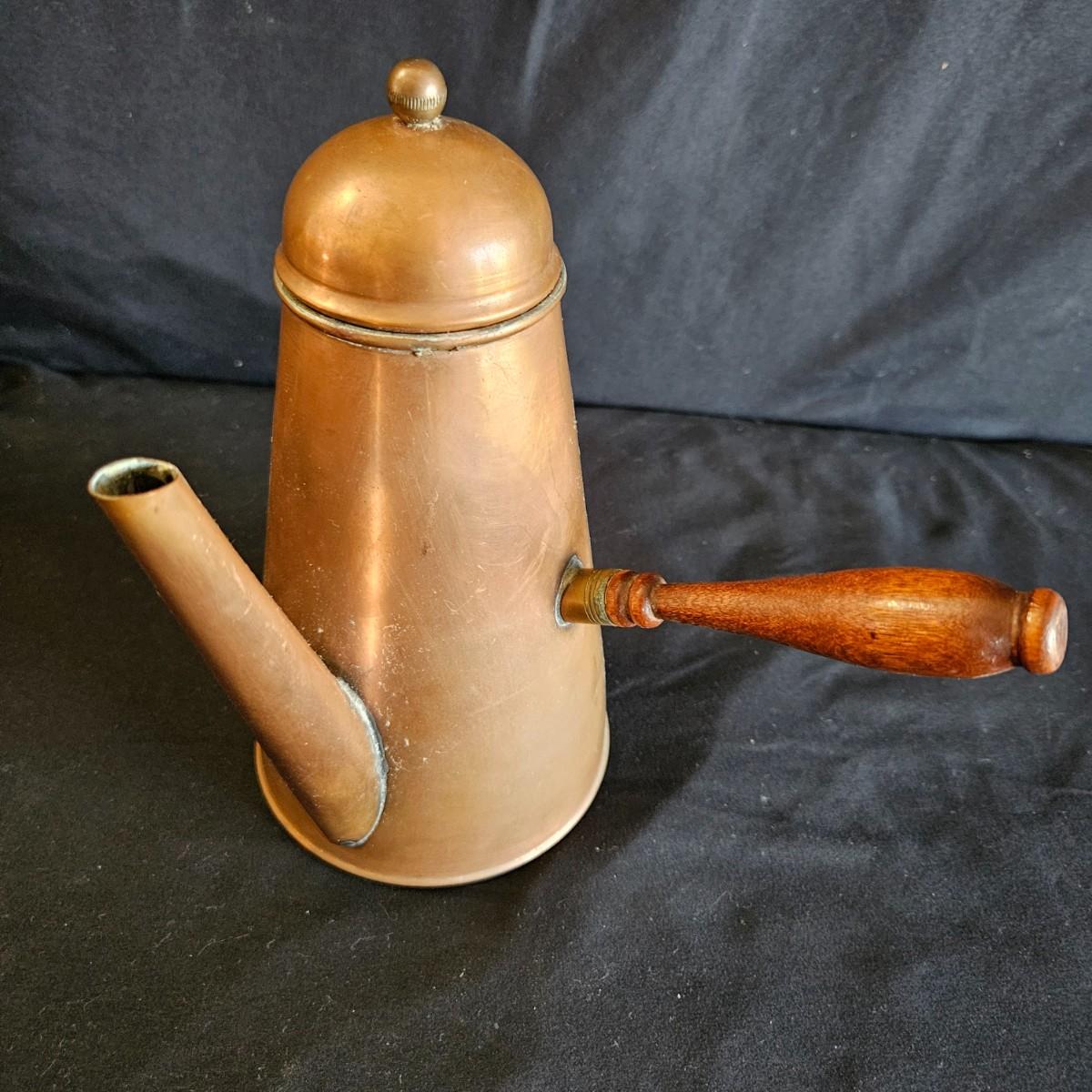 A pair of copper chafing dishes and a copper coffee pot. One chafing dish has a wheat design and an aluminum lid, a glass insert bowl and is heated by votive candles. The other has wooden handles, fits a sterno can for its heat source and has a brass-like frame. It measures approximately 10"D not including handle x 10"H. Also included is a copper and possibly brass coffee/tea kettle with a wooden handle. Local pickup only