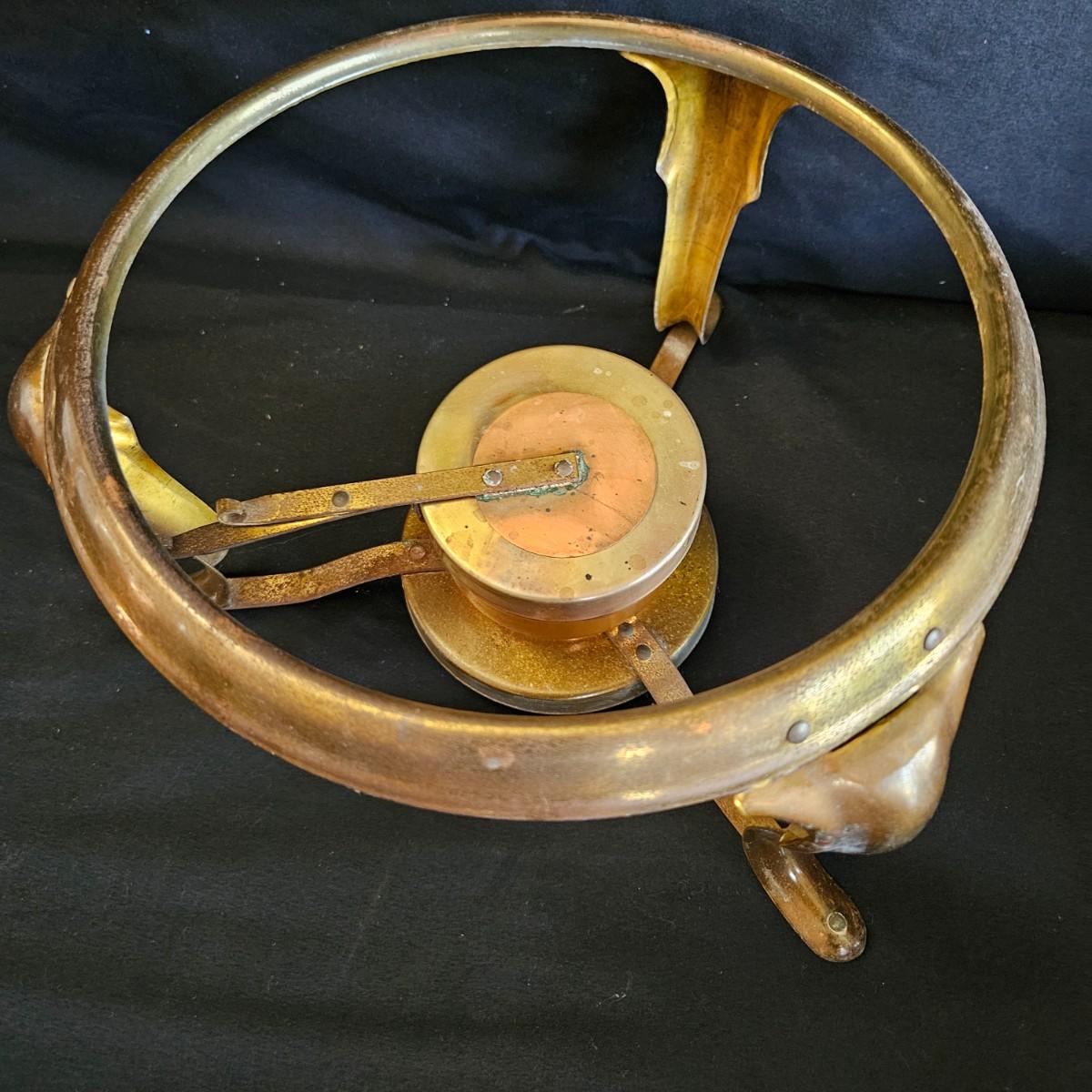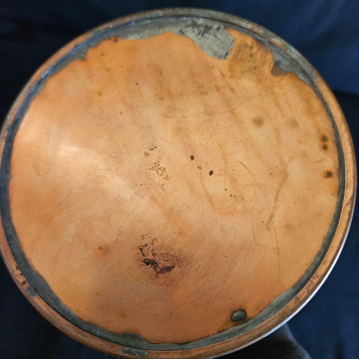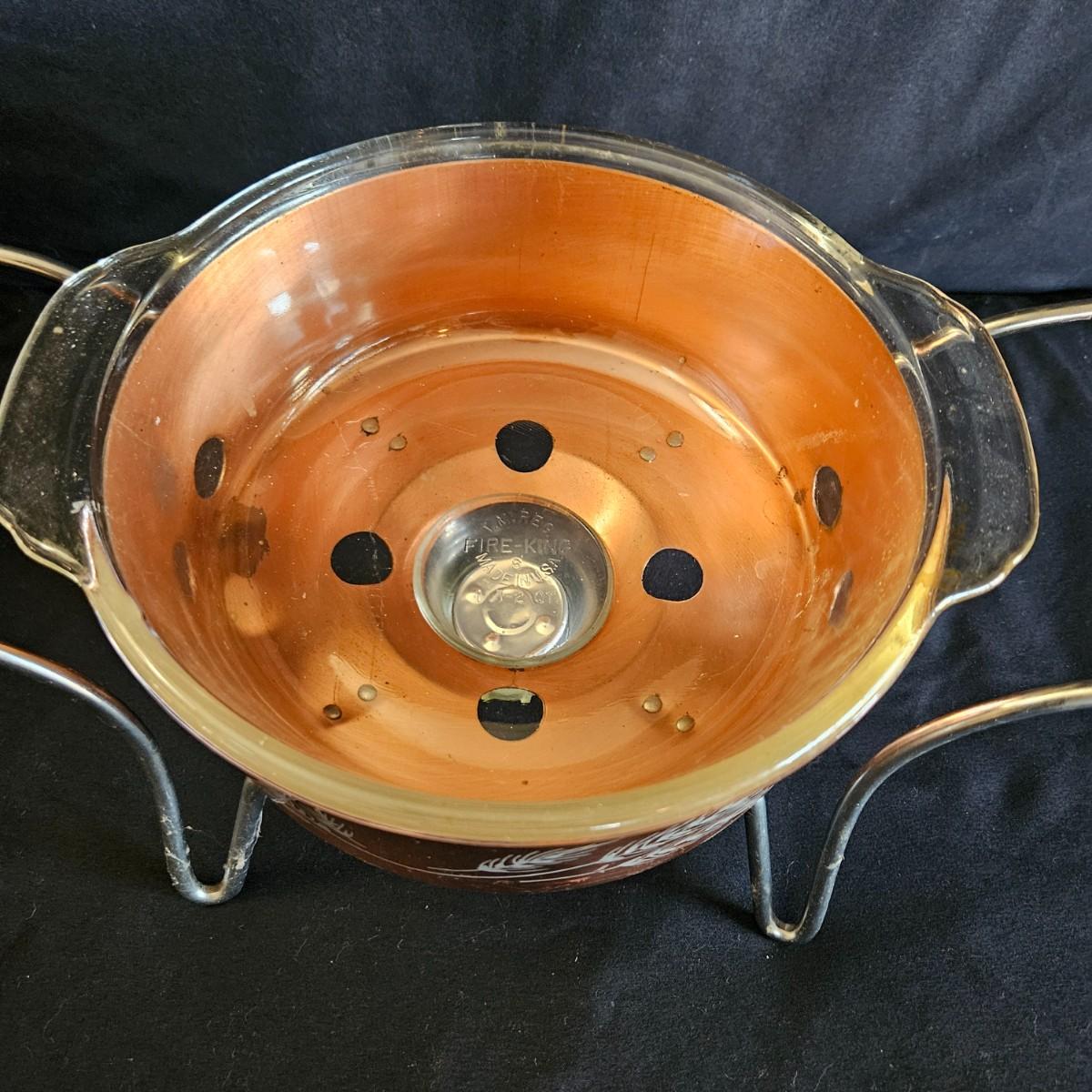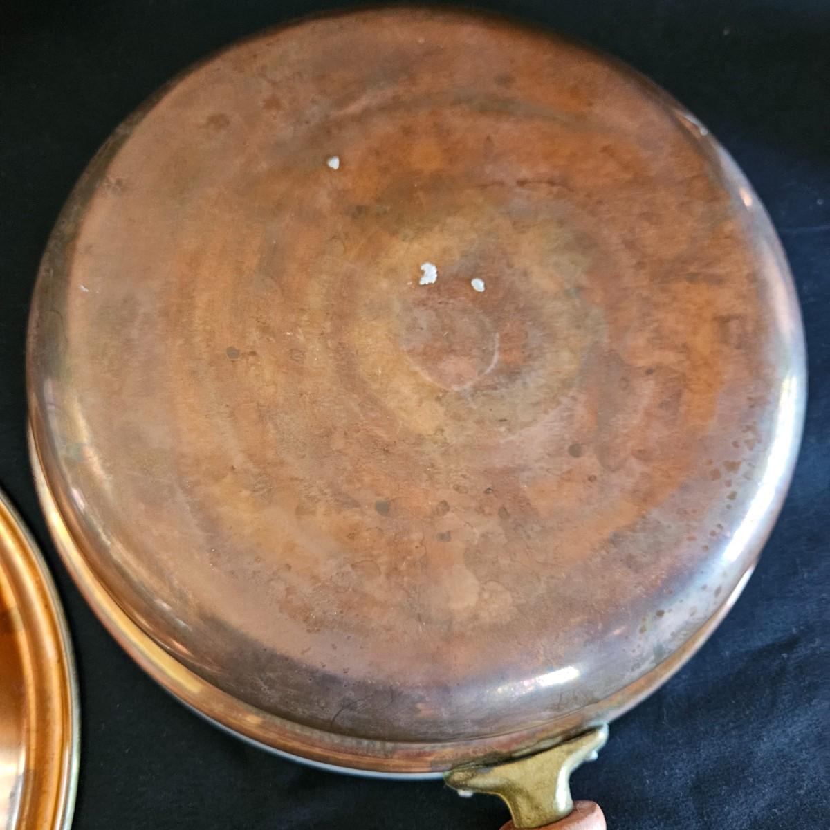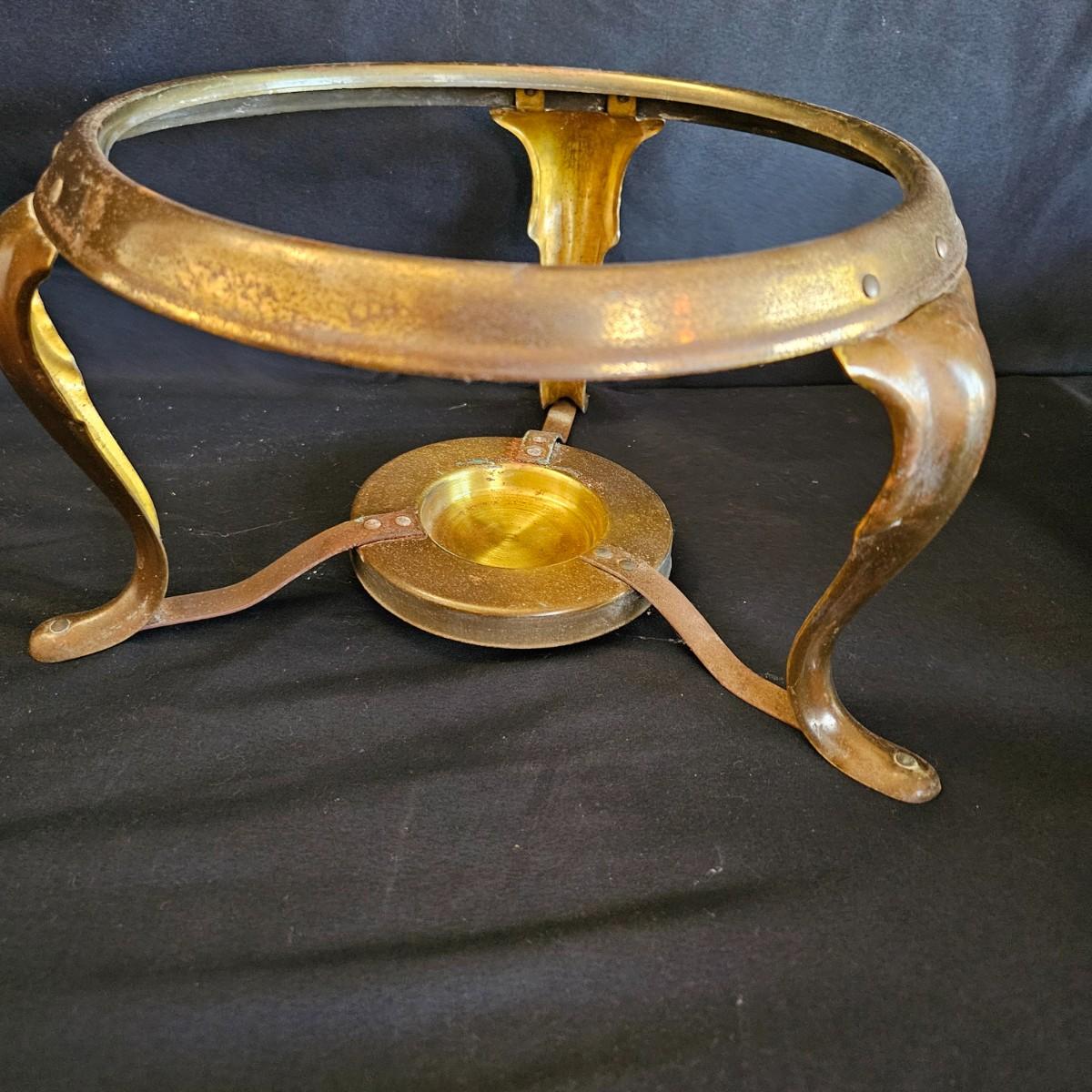 A pair of copper chafing dishes and a copper coffee pot. One chafing dish has a wheat design and an aluminum lid, a glass insert bowl and is heated by votive candles. The other has wooden handles, fits a sterno can for its heat source and has a brass-like frame. It measures approximately 10"D not including handle x 10"H. Also included is a copper and possibly brass coffee/tea kettle with a wooden handle. Local pickup only
