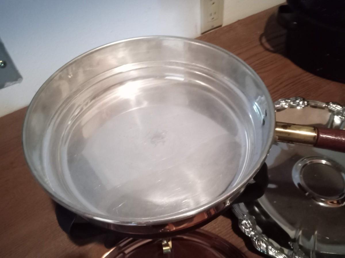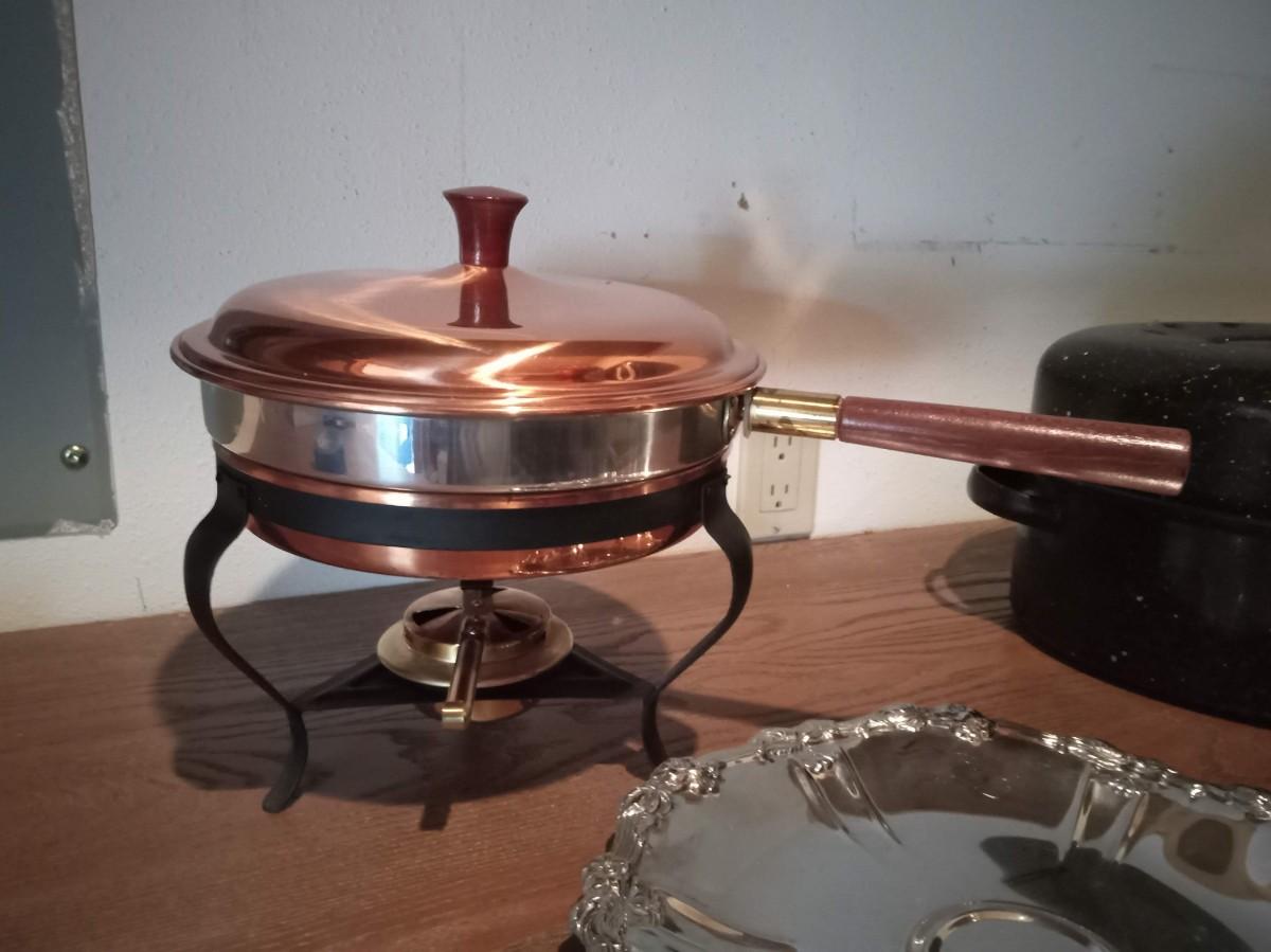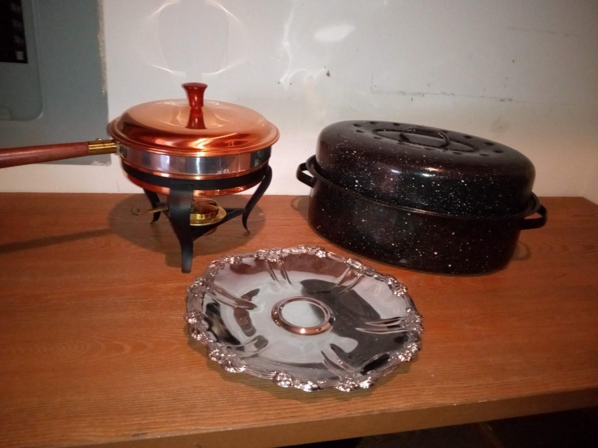 COPPER CHAFING DISH, ROASTING PAN AND SERVING PLATTER