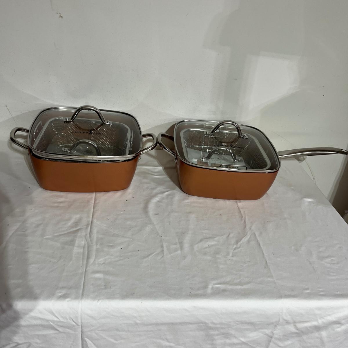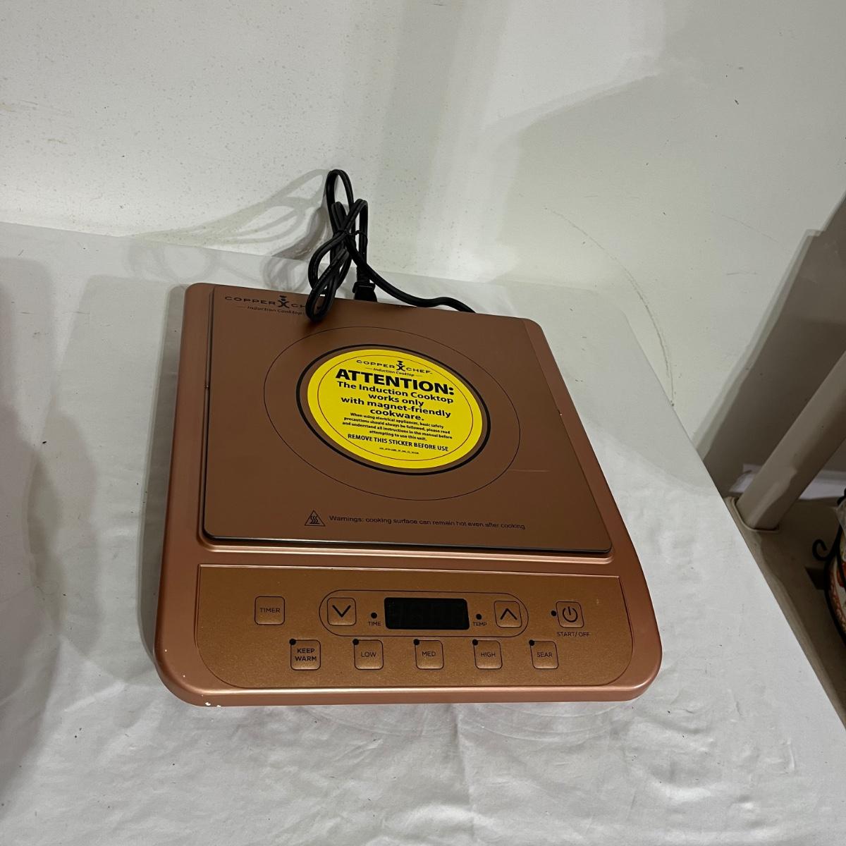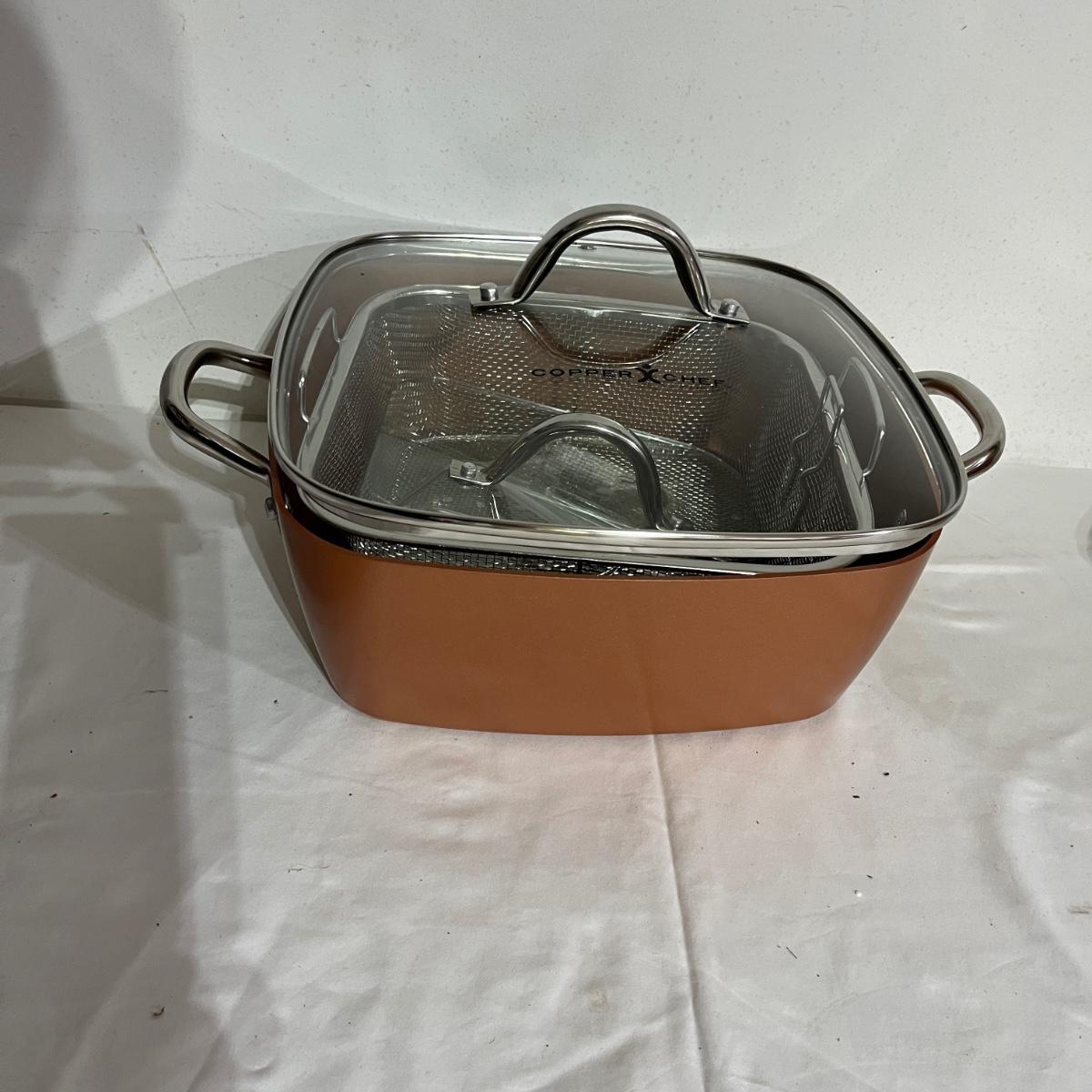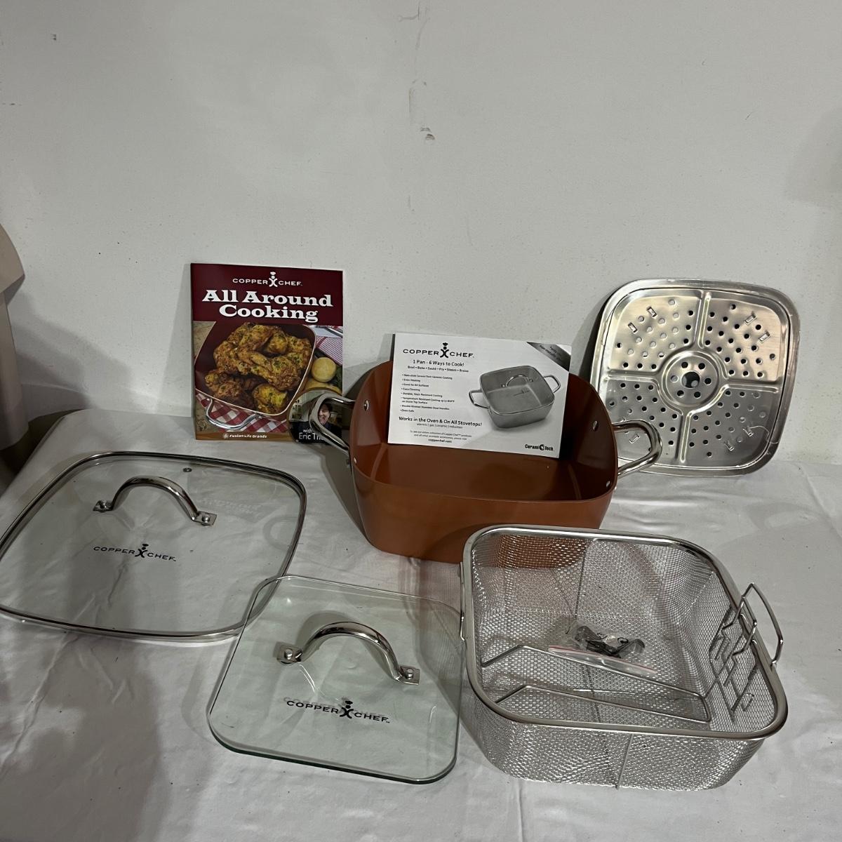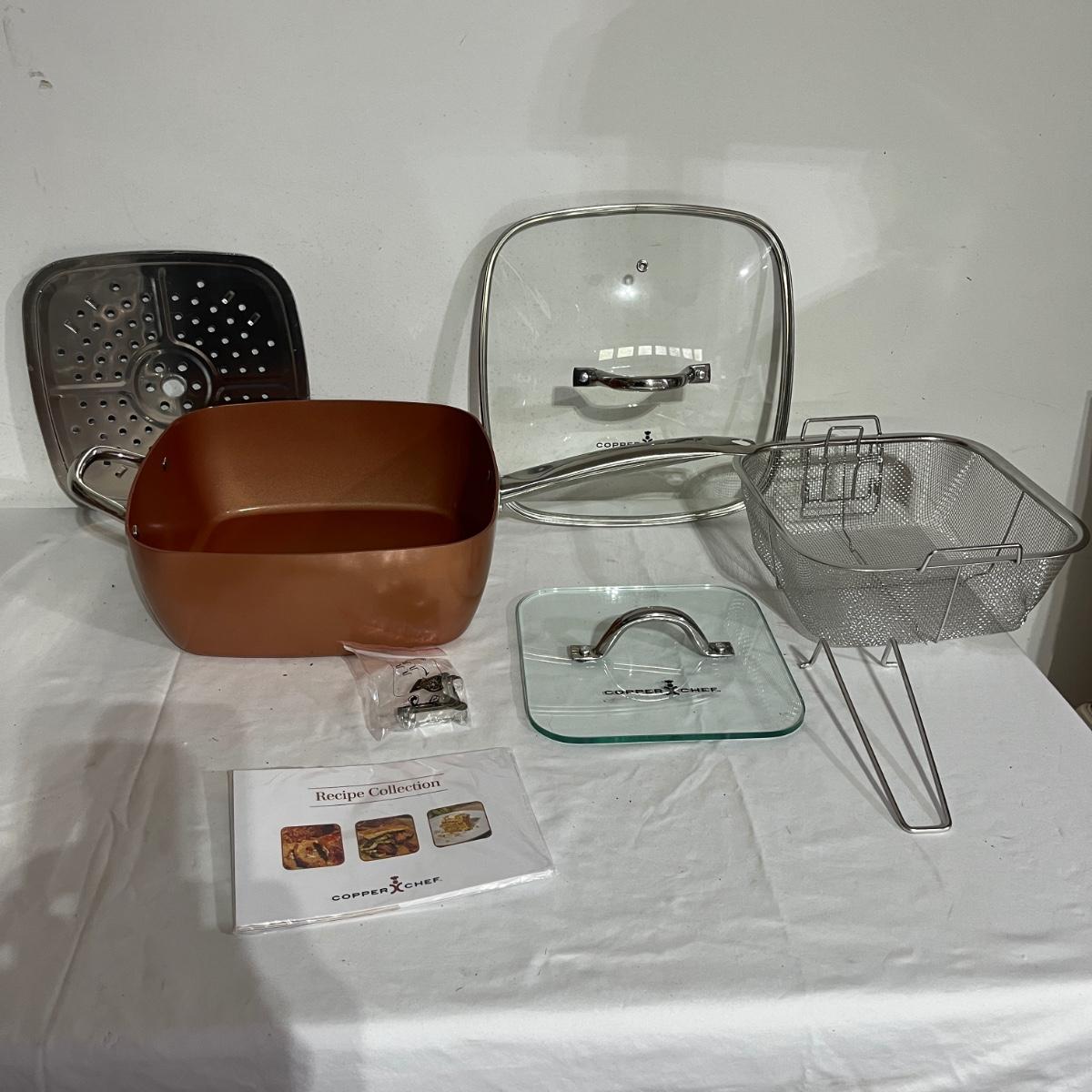 Lot includes a Copper Chef induction cooktop that powered on when plugged in and two Copper Chef pans with glass lids, fry basket and handle, steamer tray and legs and a Panini press. Induction cooktop measures 12” x 14” x 2.5”H. Items appear to be new and unused.