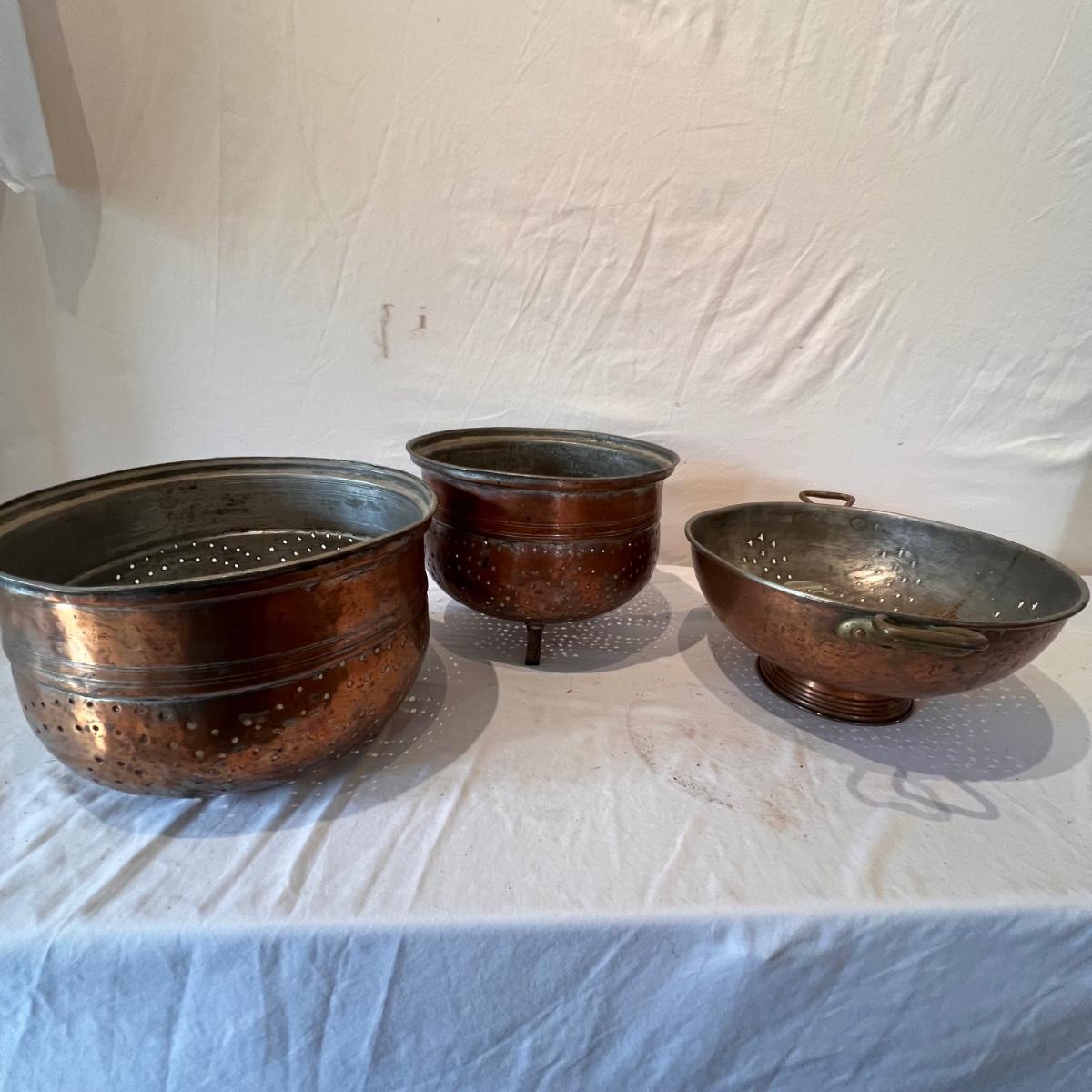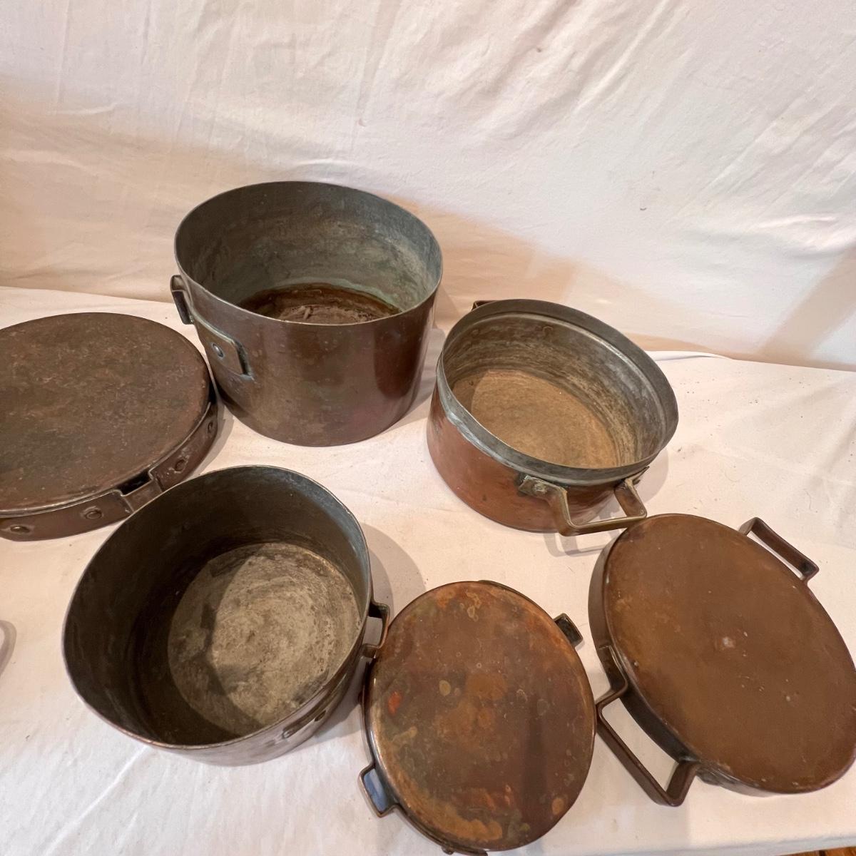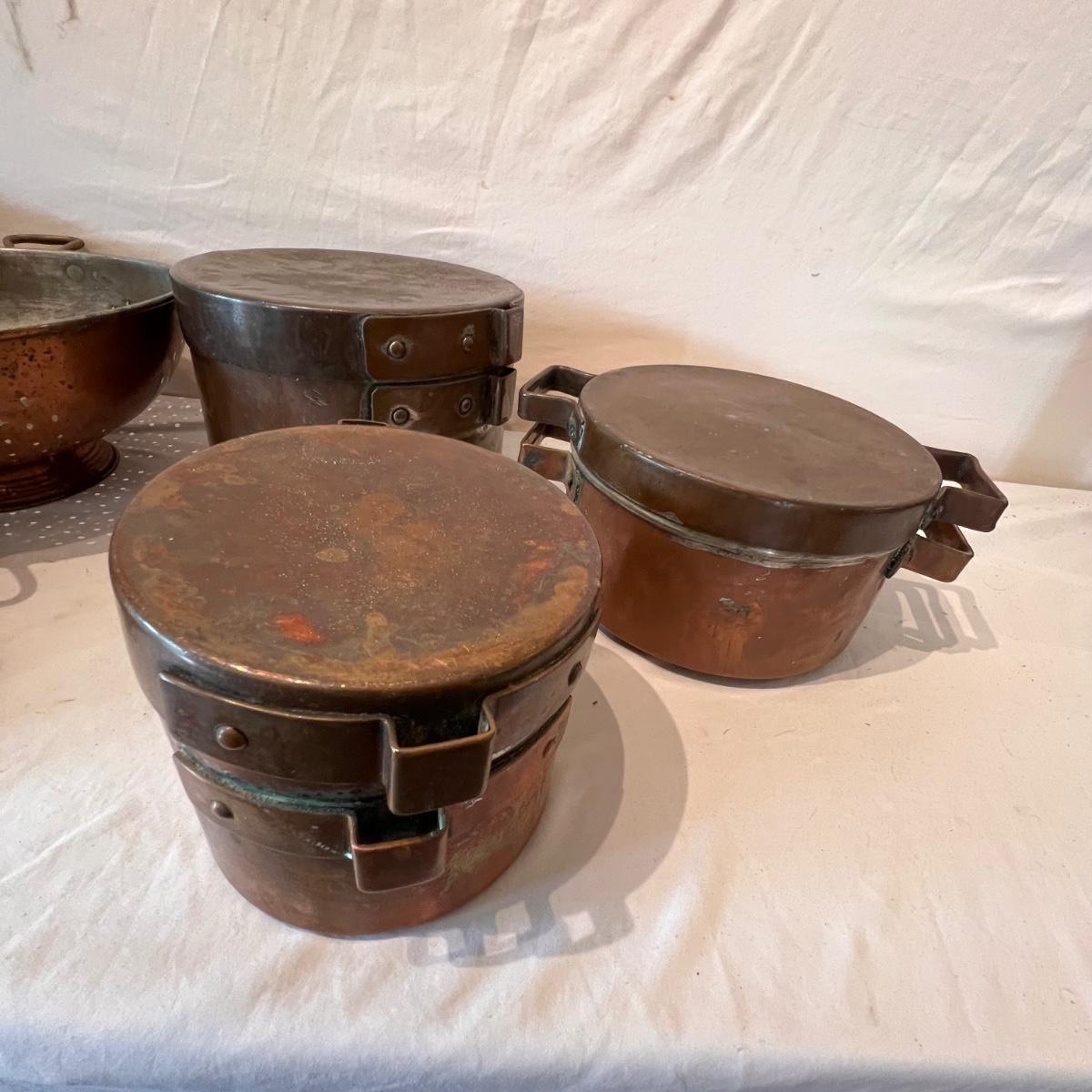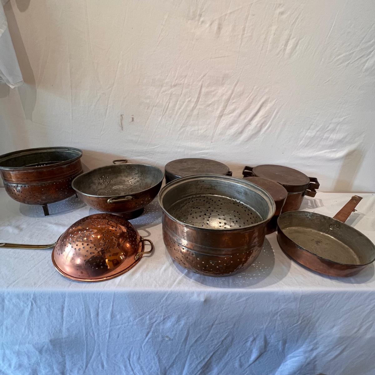 Three lidded pots plus a small skillet and four colander/strainers. All appear to be copper clad.