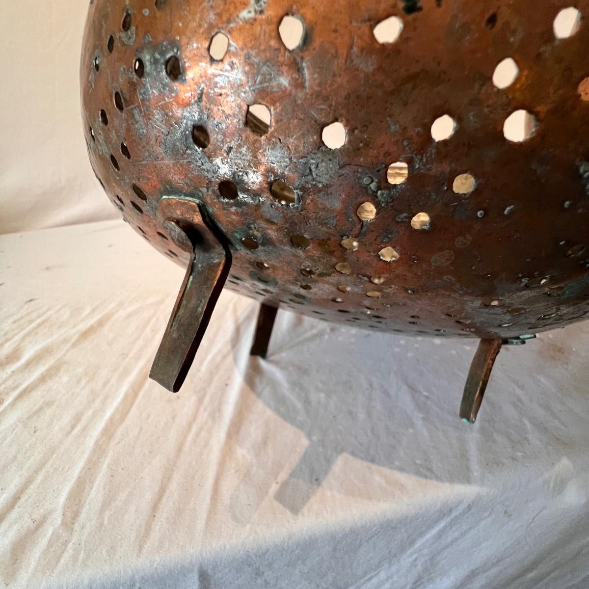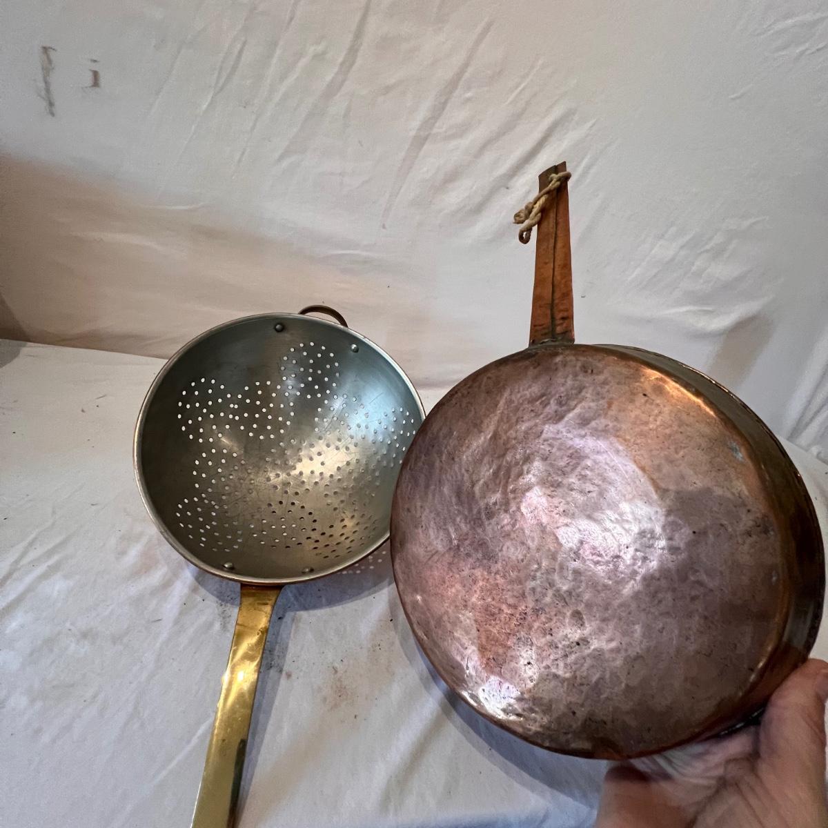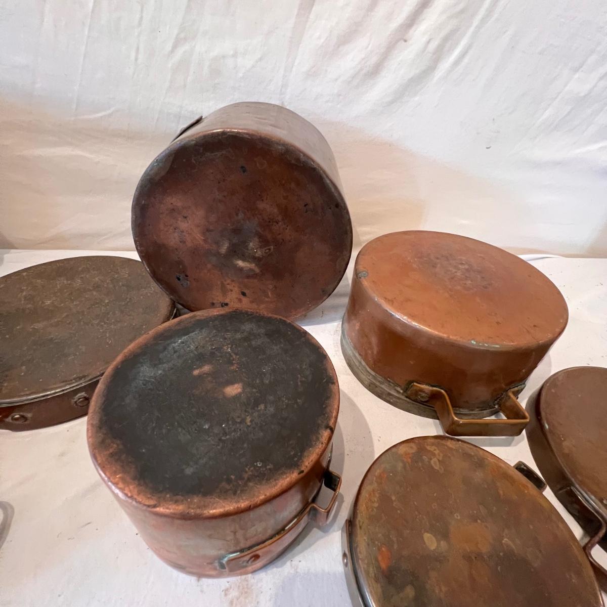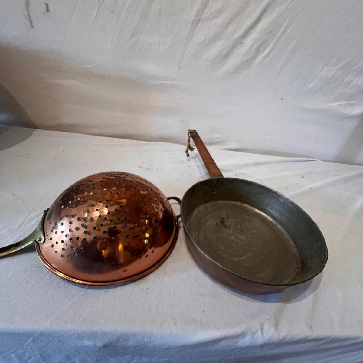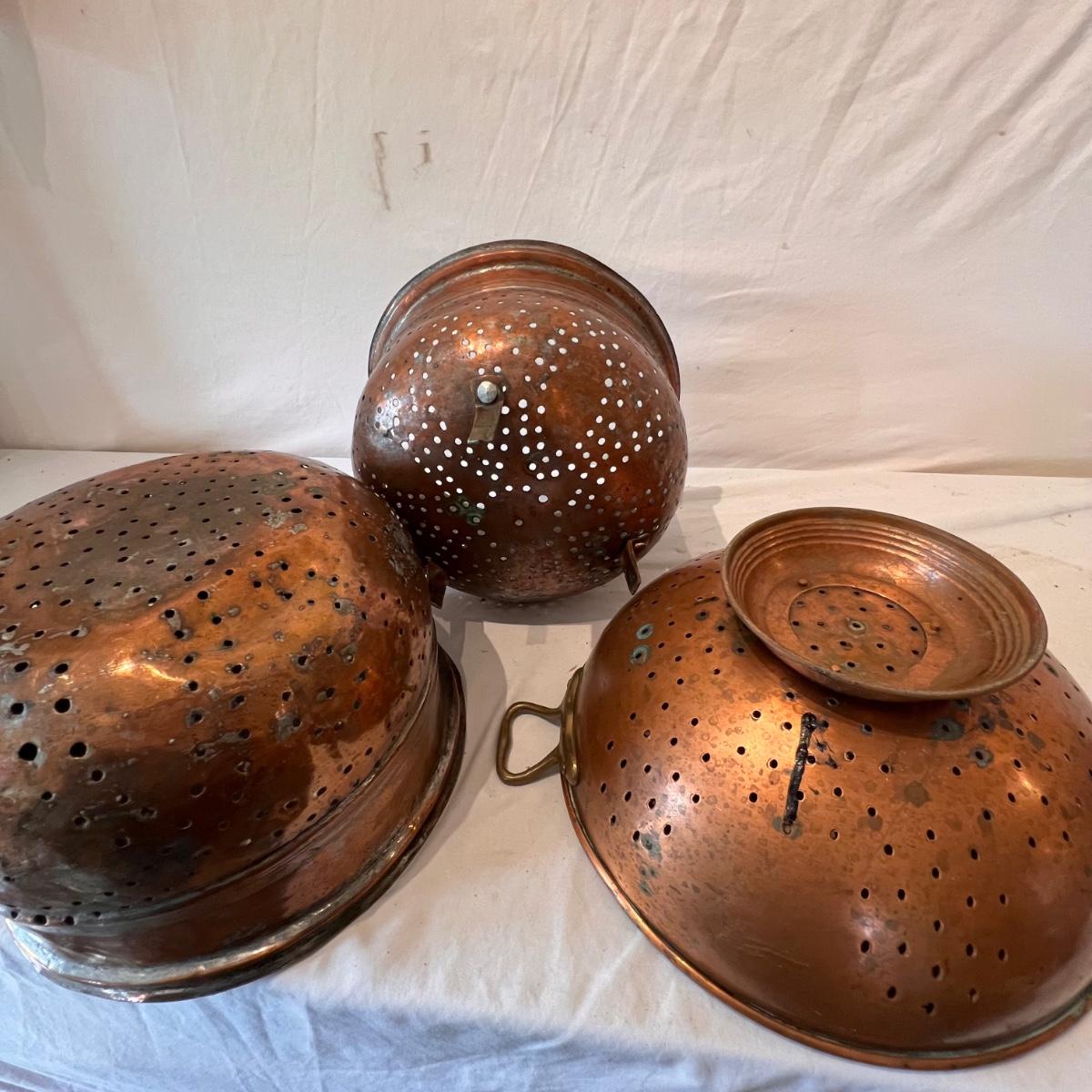 Three lidded pots plus a small skillet and four colander/strainers. All appear to be copper clad.
