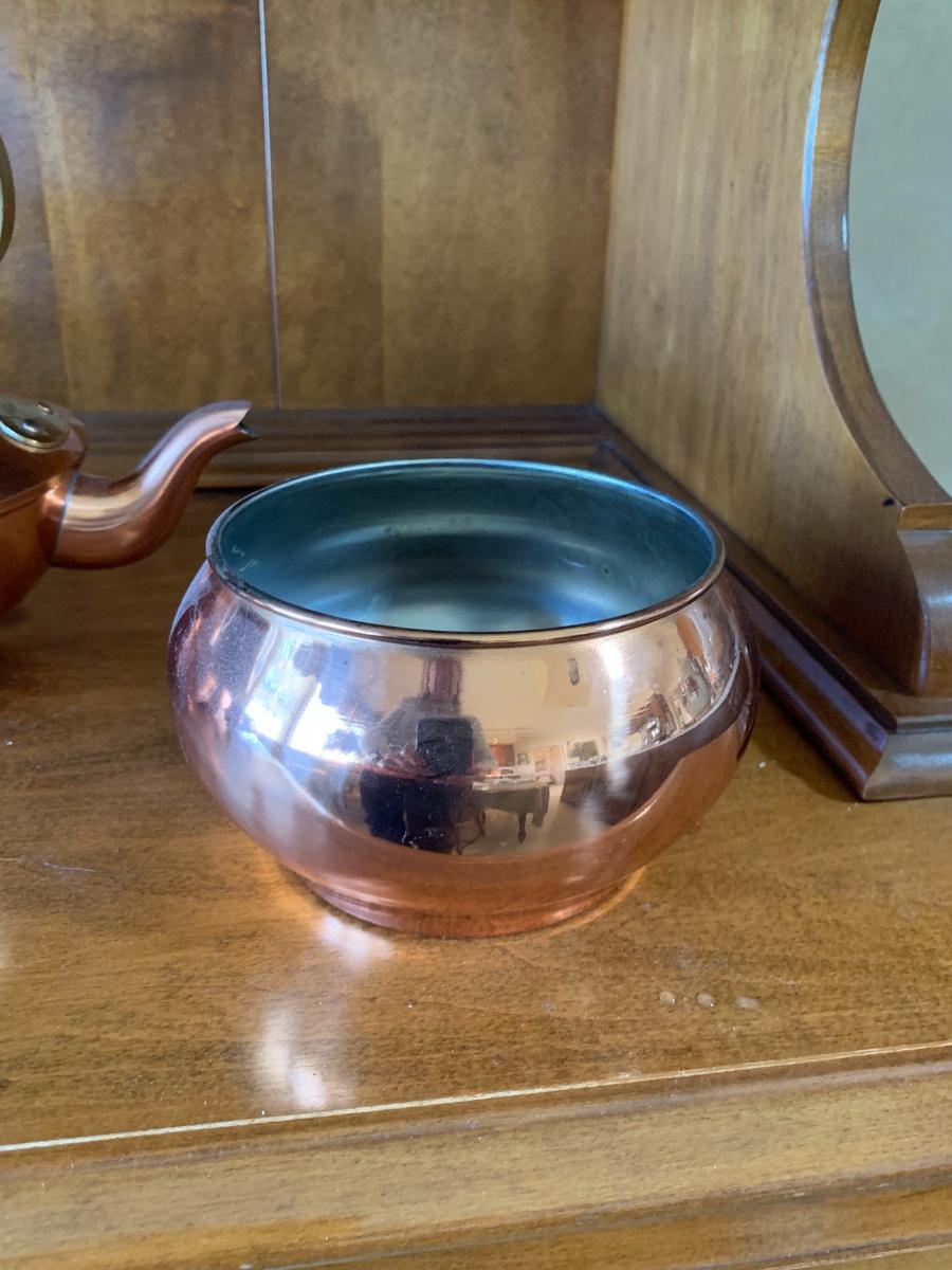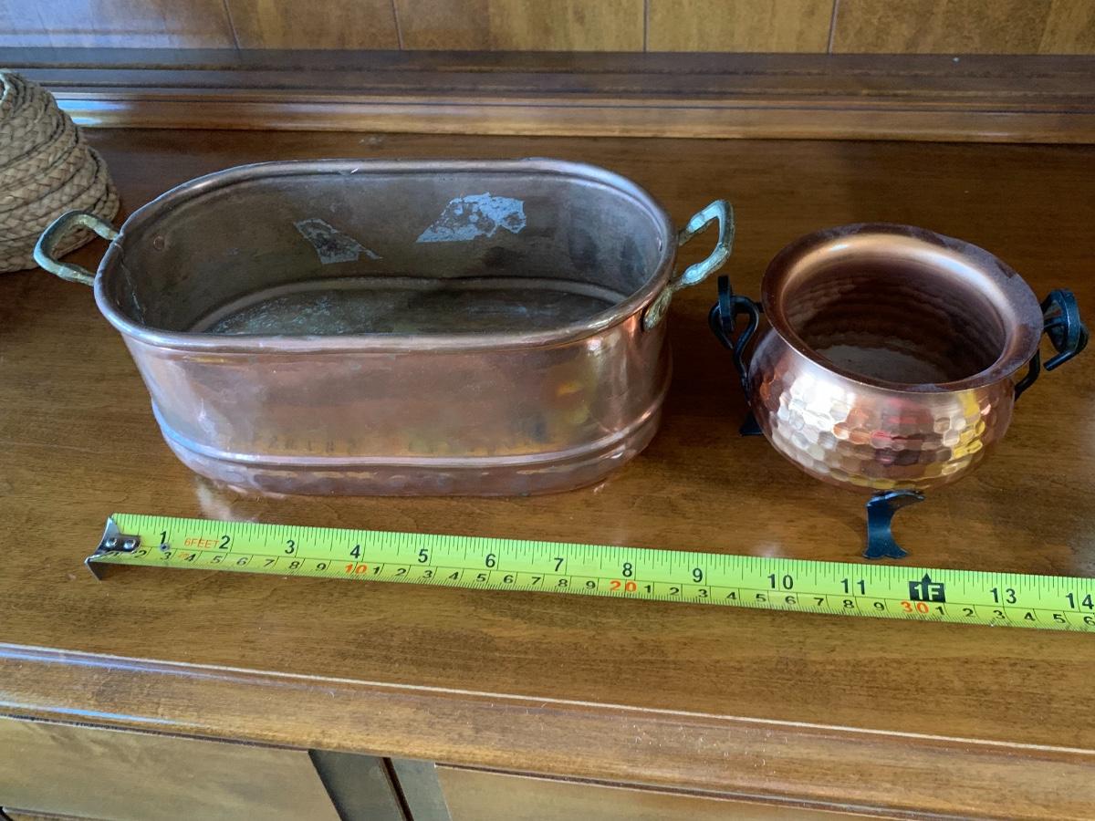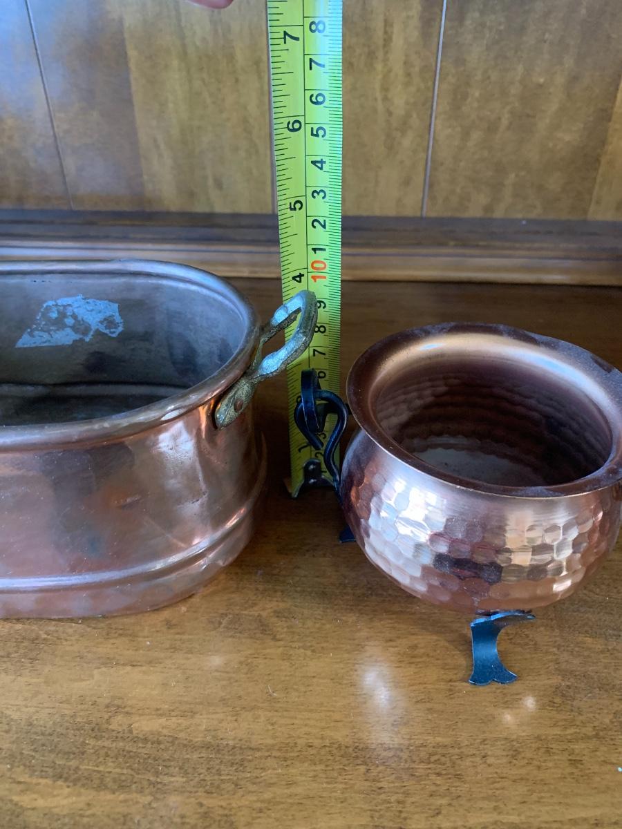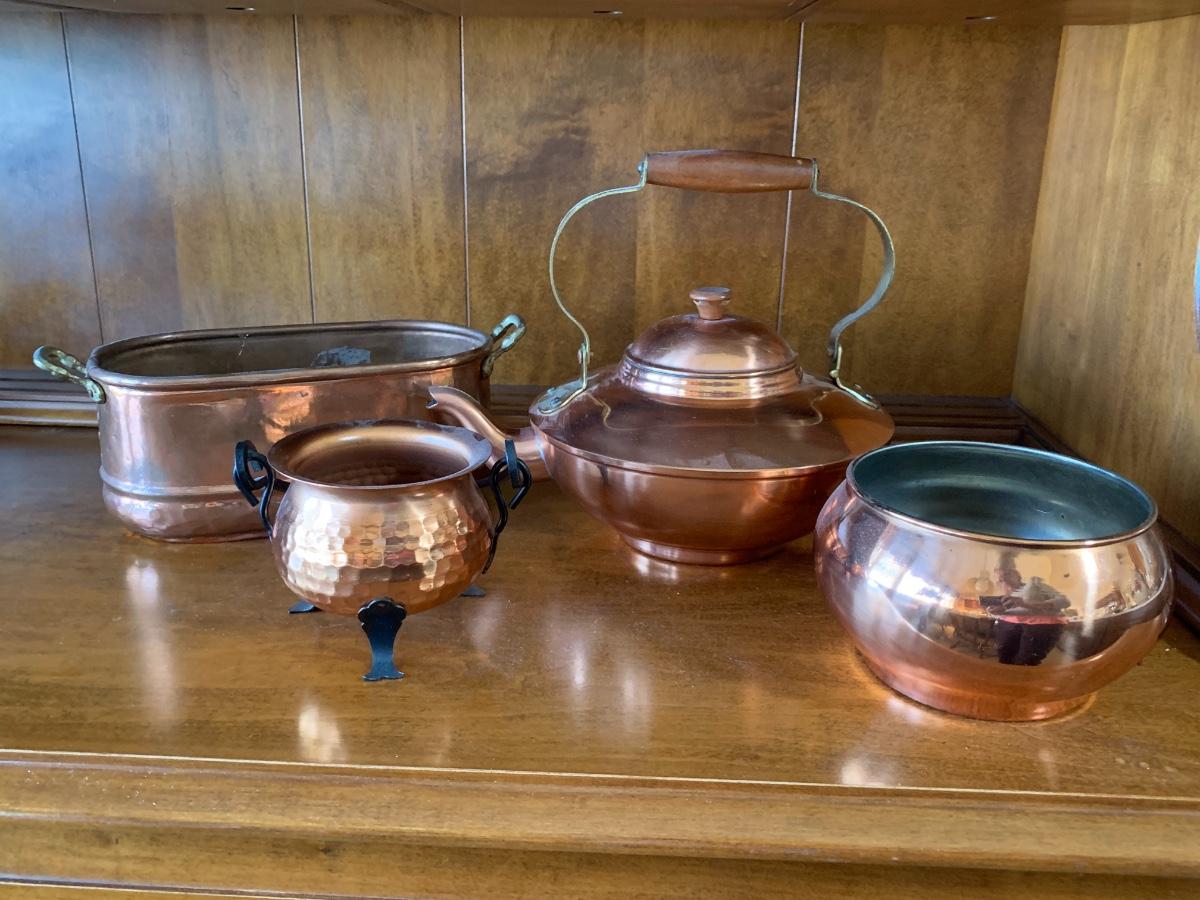 group of collectible copper. Decorative teapot made in Portugal, 2 'bowls' and oval hammered metal planter.